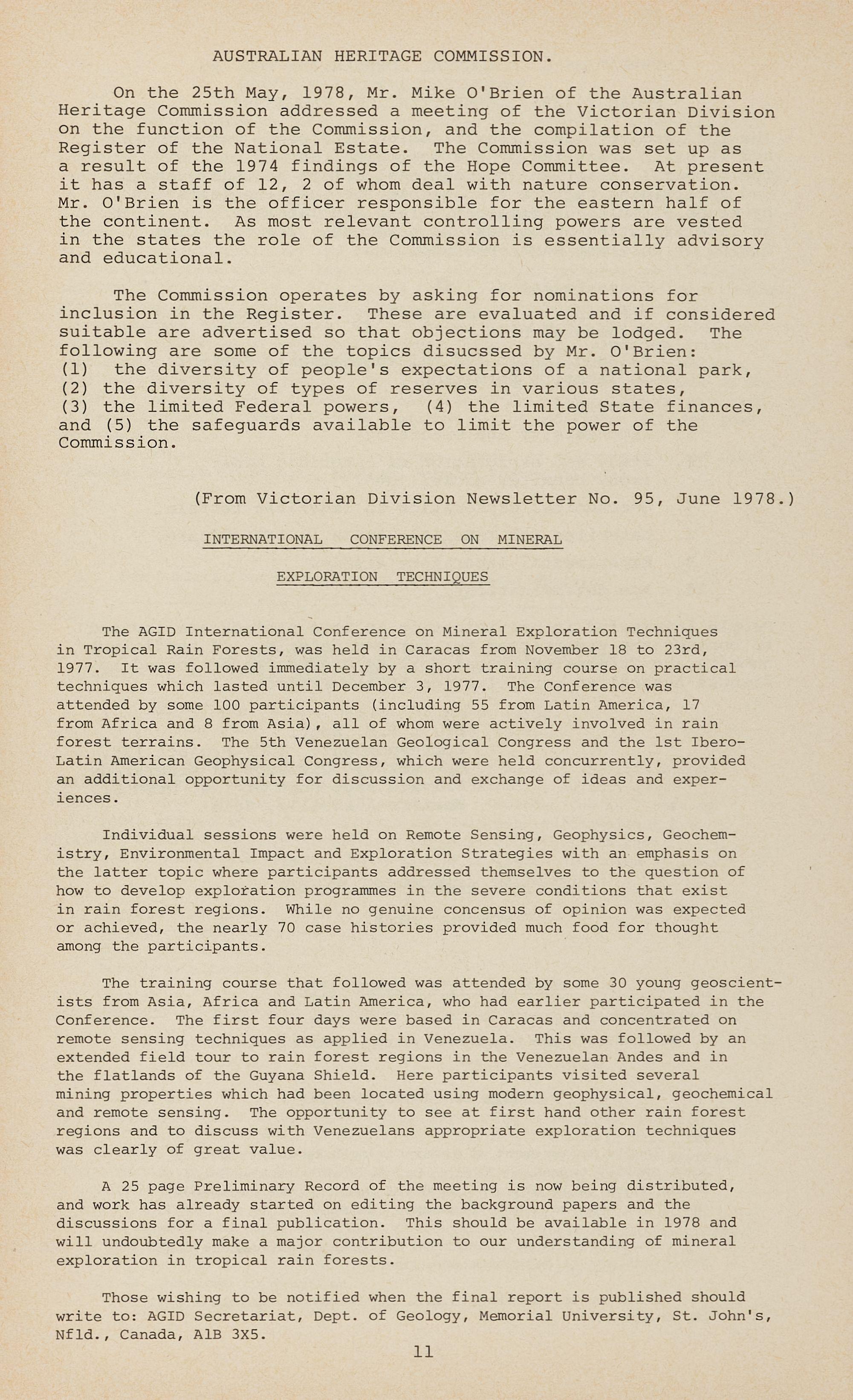On the 25th May, 1978, Mr. Mike O'Brien of the Australian Heritage Commission addressed a meeting of the Victorian Division on the function of the Commission, and the compilation of the Register of the National Estate. The Commission was set up as a result of the 1974 findings of the Hope Committee. At present it has a staff of 12, 2 of whom deal with nature conservation. Mr. O'Brien is the officer responsible for the eastern half of the continent. As most relevant controlling powers are vested in the states the role of the Commission is essentially advisory and educational.