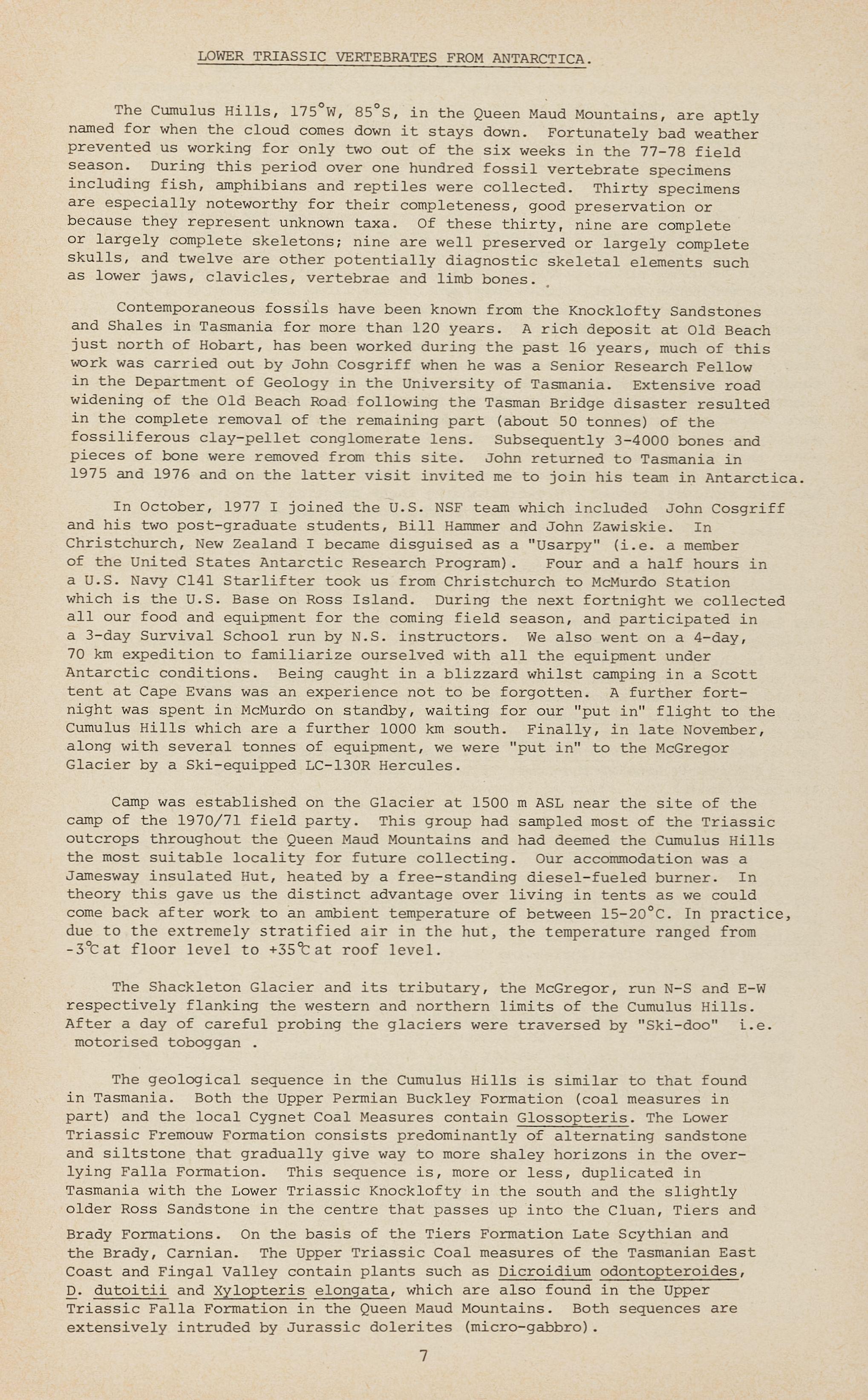 The Cwnulus Hills , 175°W, 85°S , in the Queen Maud Mountains, are aptly named for when the cloud comes down it stays down. Fortunately bad weather prevented us working for only two out of the six weeks in the 77-78 field season During this period over one hundred fossil vertebrate specimens including fish, amphibians and reptiles were collected. Thirty specimens are especially noteworthy for their completeness, good preservation or because they represent unknown taxa. Of these thi r t y , nine are complete or largely complete skeletons ; nine are well preserved or largely complete skulls , and twelve are other potentially diagnostic skeletal elements such as lower jaws, clavicles , vertebrae and limb bones.