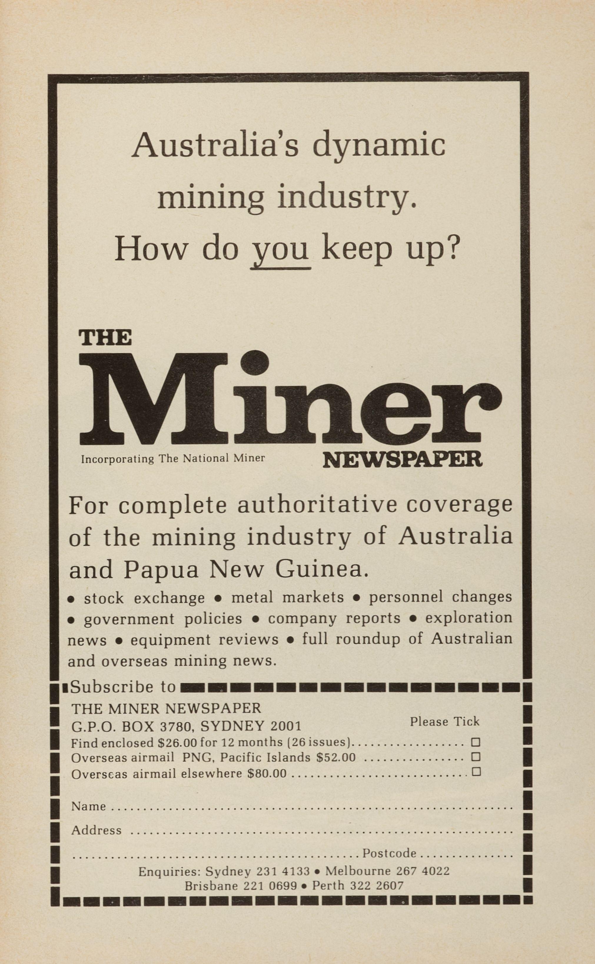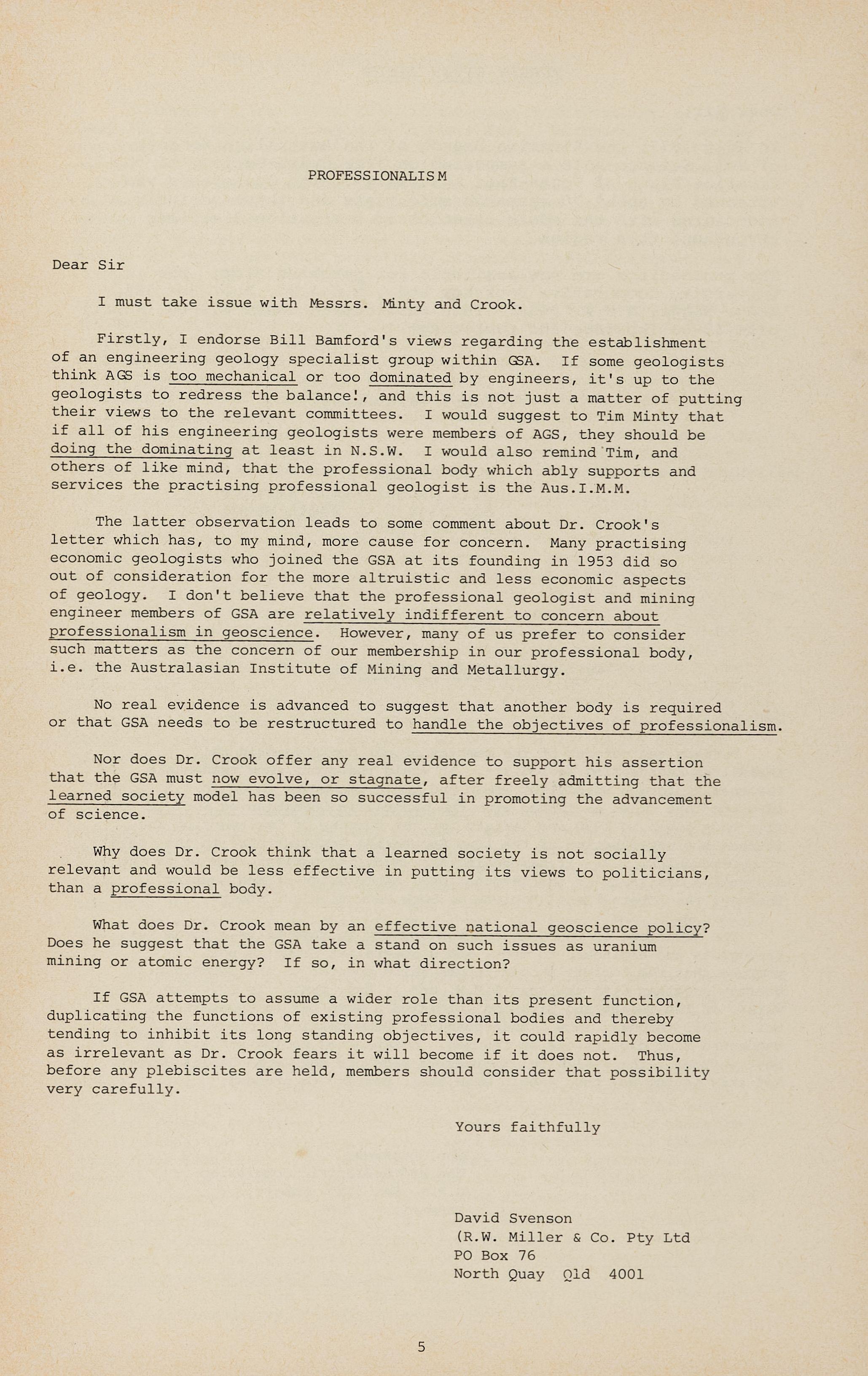 The latter observation leads to some comment about Dr. Crook's letter which has, to my mind, more cause for concern. Many practising economic geologists who joined the GSA at its founding in 1953 did so out of consideration for the more altruistic and less economic aspects of geology. I don't believe that the professional geologist and mining engineer members of GSA are relatively indifferent to concern about professionalism in geoscience. However, many of us prefer to consider such matters as the concern of our membership in our professional body, i.e. the Australasian Institute of Mining and Metallurgy.