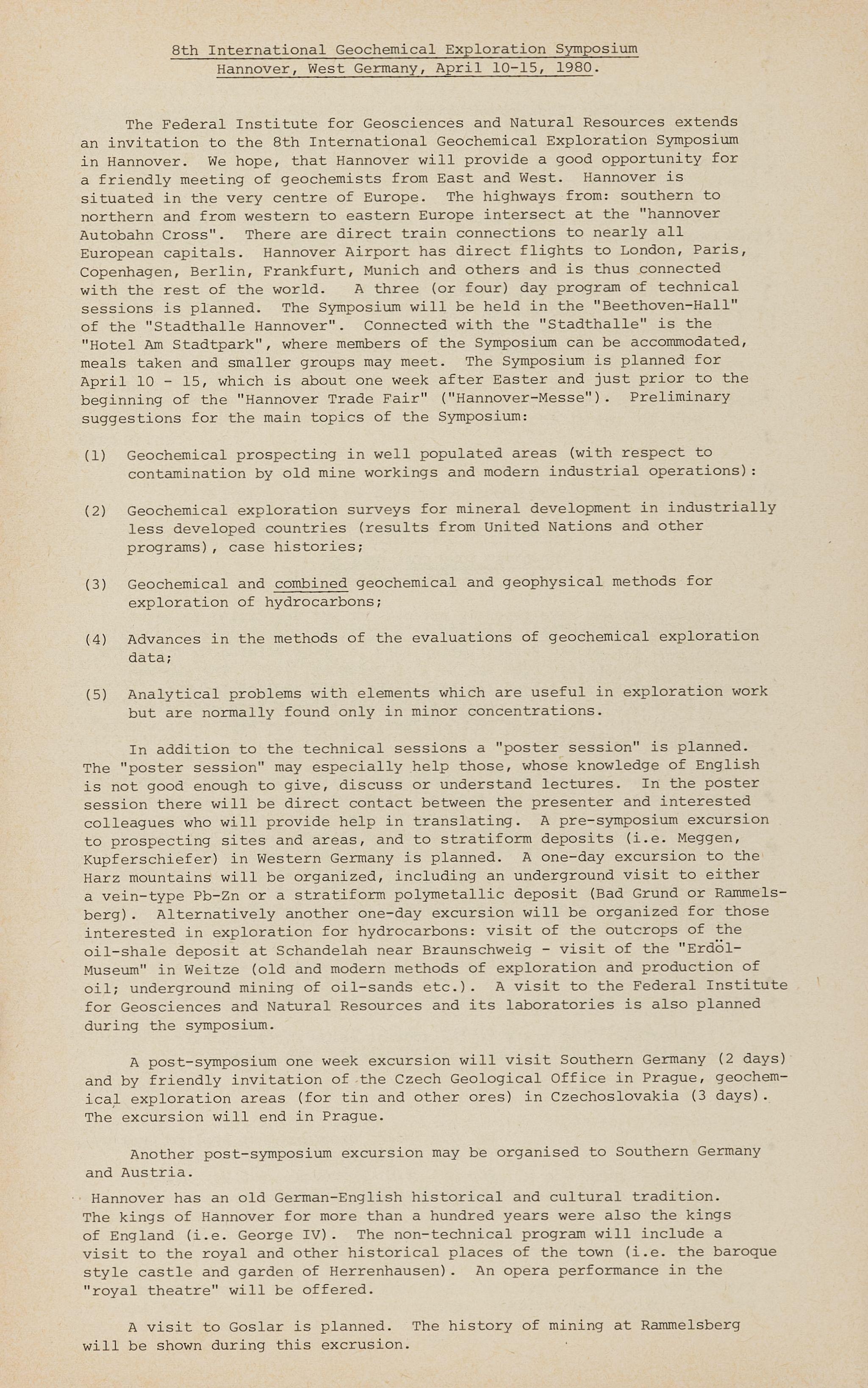 The Federal Institute for Geosciences and Natura l Resources extends an invitation to the 8th International Geochemical Exp loration Symposium in Hannover. We hope, that Hannover will provide a good opportunity for a friendly meeting of geochemists from East and West. Hannover is situated in the very centre of Europe. The highways from: southern to northern and from western to eastern Europe intersect at the " hannover Autobahn Cross ". There are direct train connections to nearly all European capitals. Hannover Airport has direct flights to London , Paris, Copenhagen, Berlin, Frankfurt, Munich and others and is thus connected with the rest of the world A three (or four) day program of technical sessions is planned. The Symposium will be held in the " Beethoven- Hall " of the "Stadthalle Hannover " Connected with the " Stadthalle" is the "Hotel Am Stadtpark" , where members of the Symposium can be accommodated , meals taken and smaller groups may meet. The Symposium is planned for April 10 - 15, which is about one week after Easter and just prior to the beginning of the " Hannover Trade Fair " ("Hannover-Messe"). Preliminary suggestions for the main topics of the Symposium :