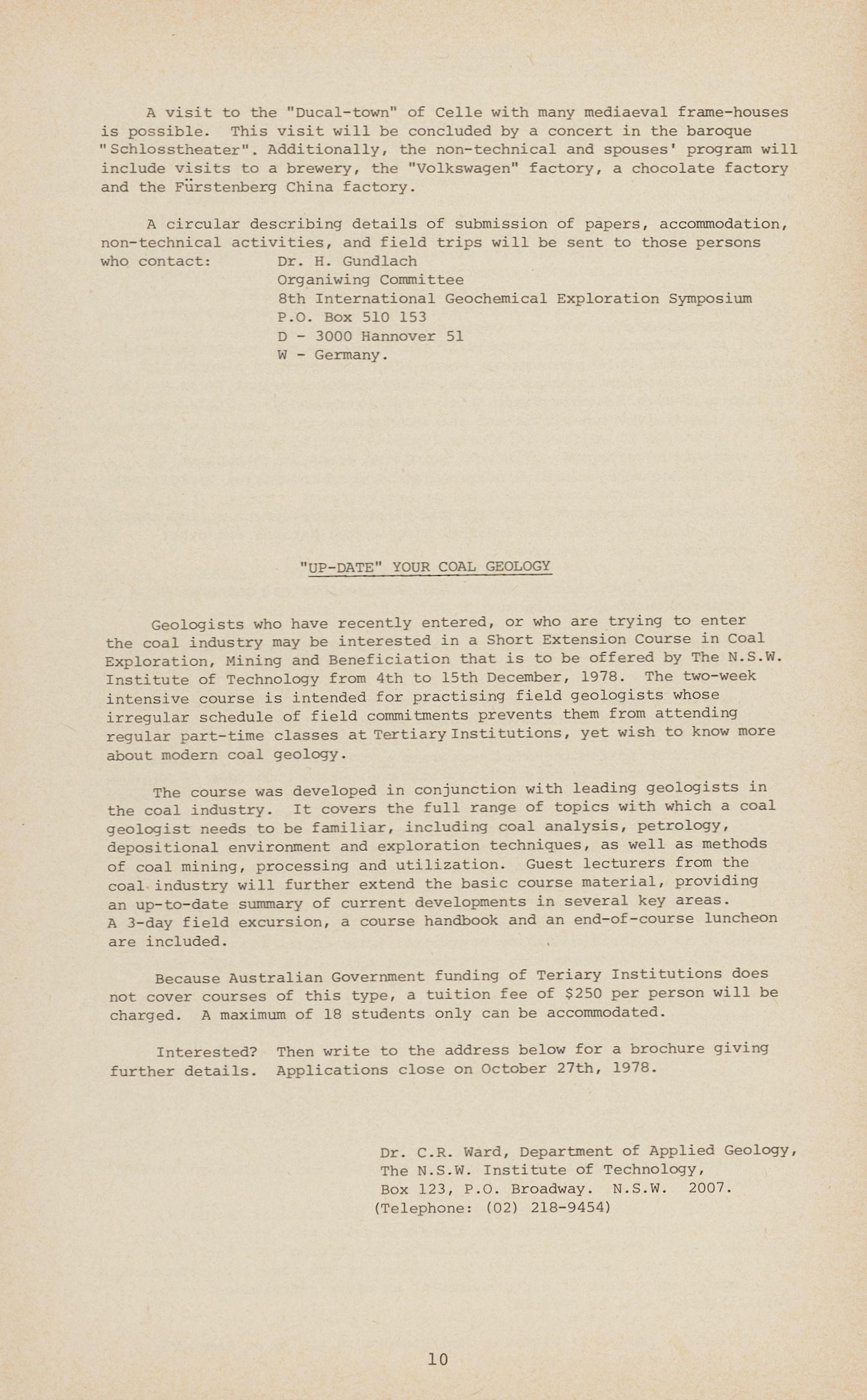 A circular describing details of submission of papers , accommodation, non-technical activities, and field trips will be sent to those persons who contact: Dr. H. Gundlach Organiwing Committee