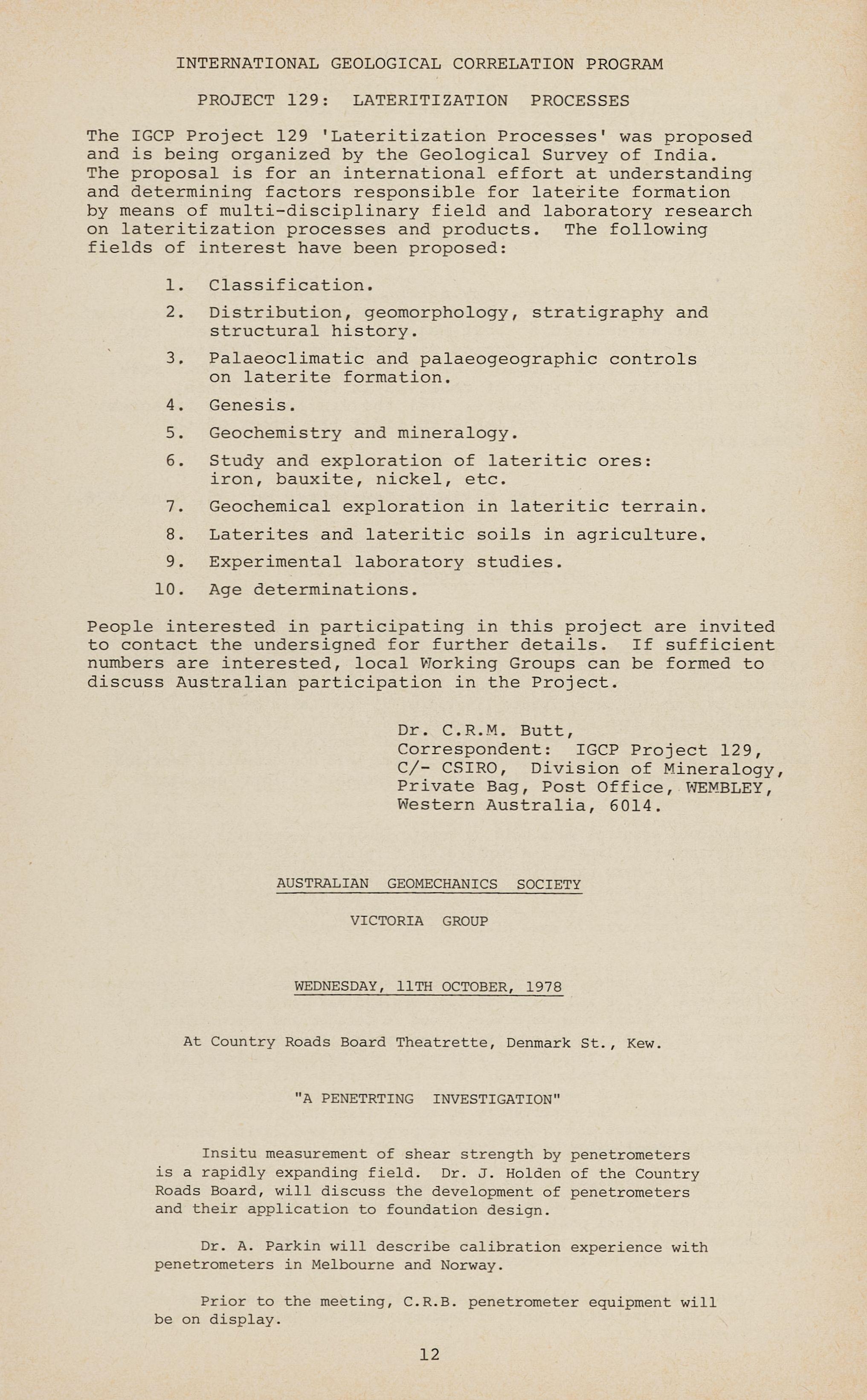 Dr. C.R.M. Butt, Correspondent: IGCP Project 129, C/- CSIRO, Division of Mineralogy, Private Bag, Post Office, WEMBLEY, Western Australia, 6014.