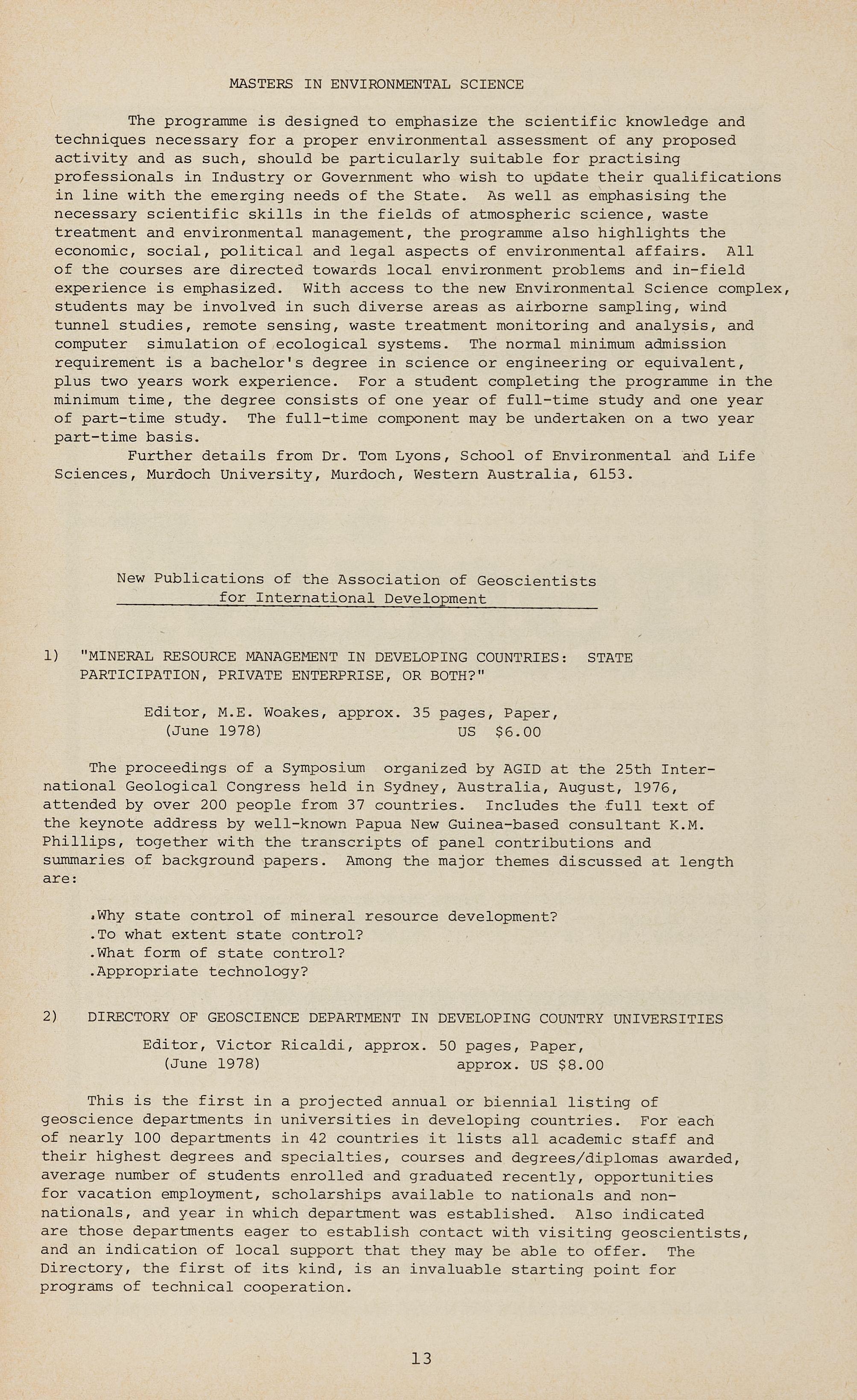 A 25 page Preliminary Record of the meeting is now being distributed, and work has already started on editing the background papers and the discussions for a final publication. This should be available in 1978 and will undoubtedly make a major contribution to our understanding of mineral exploration in tropical rain forests.