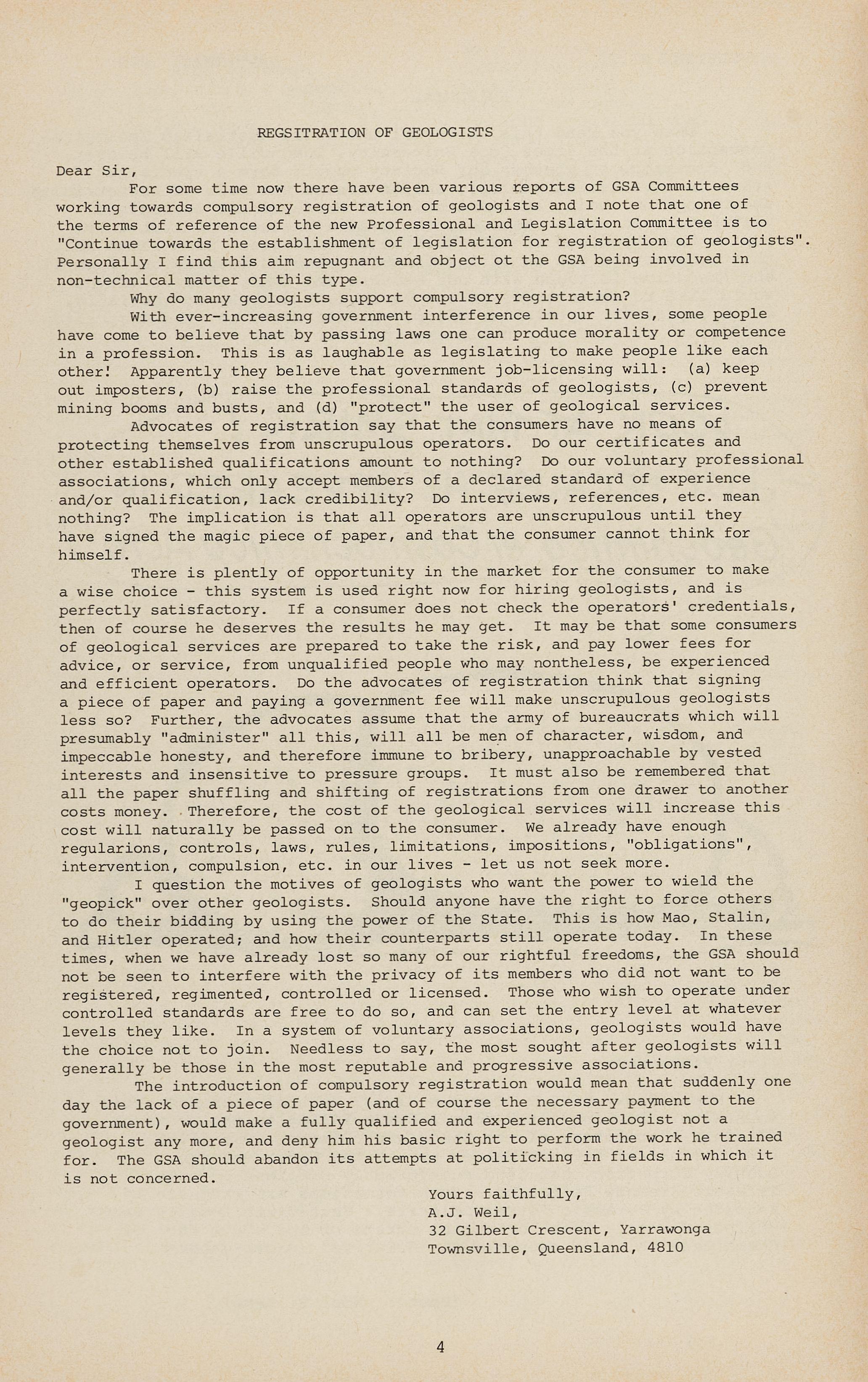 For some time now there have been various reports of GSA Committees working towards compulsory registration of geologists and I note that one of the terms of reference of the new Professional and Legislation Committee is to "Continue towards the establishment of legislation for registration of geologists". Personally I find this aim repugnant and object ot the GSA being involved in non-technical matter of this type.