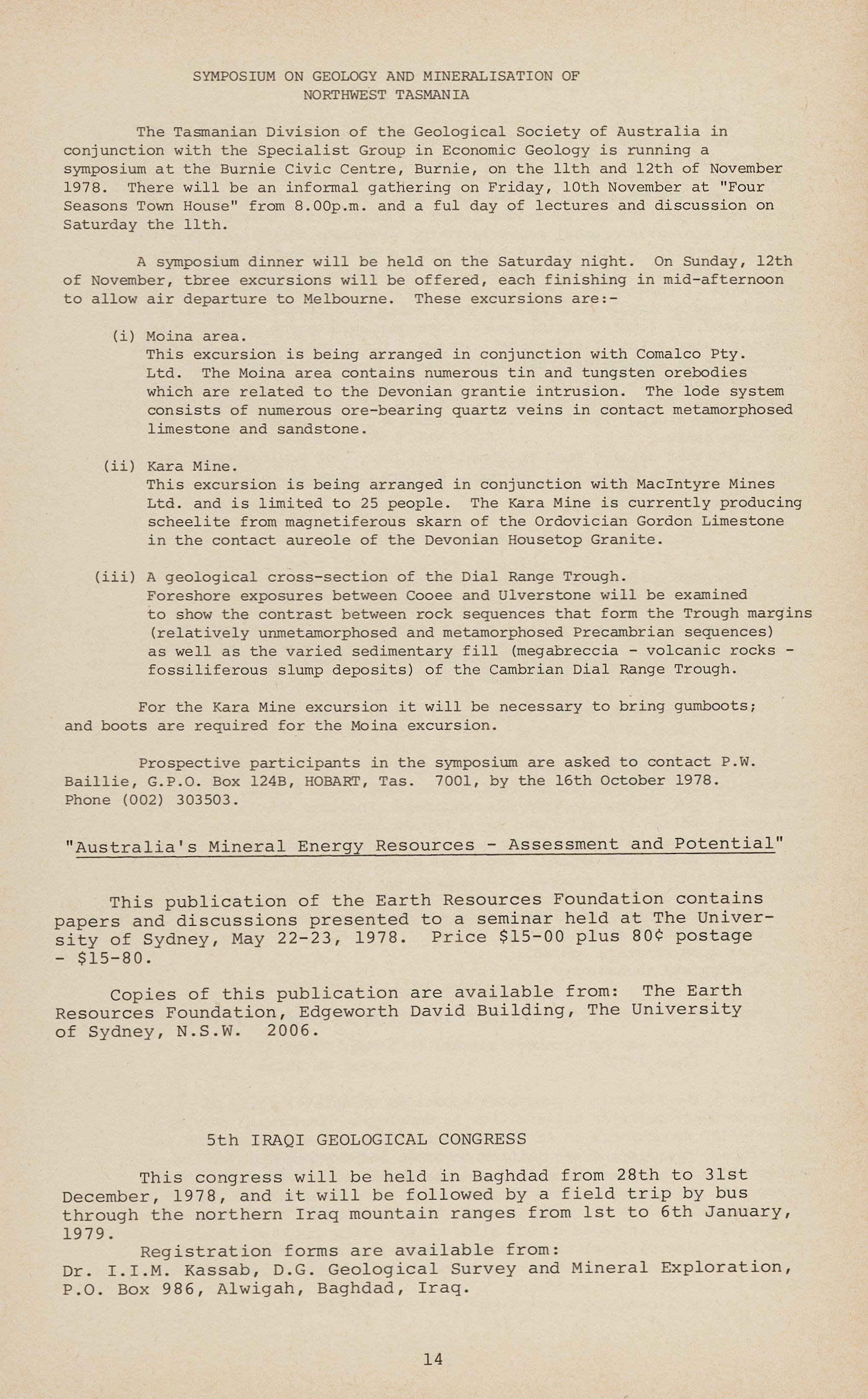 The Tasmanian Division of the Geological Society of Australia in conjunction with the Specialist Group in Economic Geology is running a symposium at the Burnie Civic Centre, Burnie, on the 11th and 12th of November 1978. There will be an informal gathering on Friday, 10th November at "Four Seasons Town House" from 8.00p.m. and a ful day of lectures and discussion on Saturday the 11th.