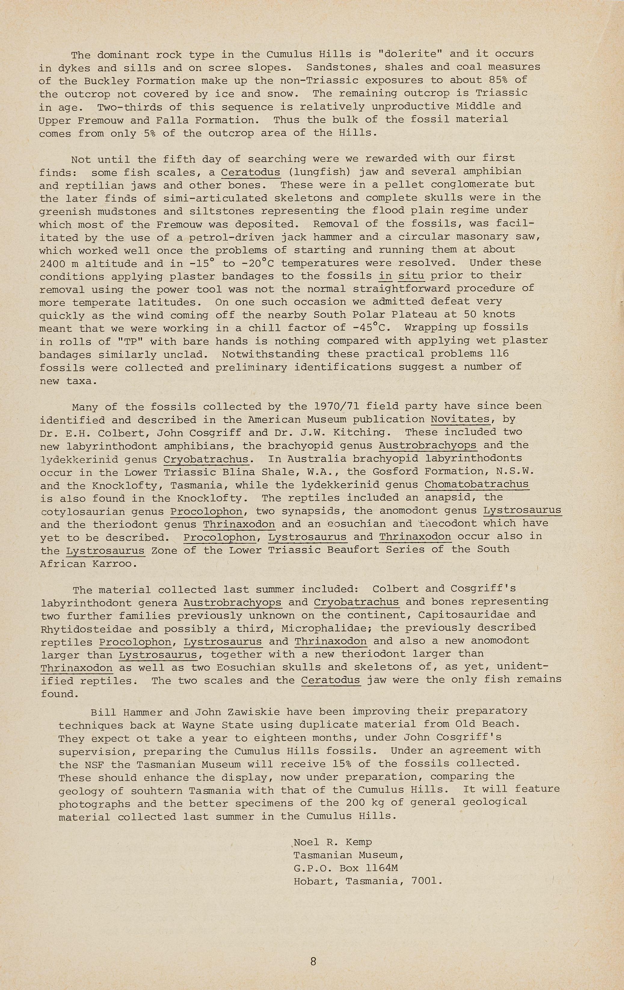 Many of the fossils collected by the 1970/71 field party have since been identified and described in the American Museum publication Novitates, by Dr. E .H. Colbert, John Cosgriff and Dr. J.W. Kitching. These included two new labyrinthodont amphibians, the brachyopid genus Austrobrachyops and the lydekkerinid genus Cryobatrachus. In Australia brachyopid labyr inthodonts occur in the Lower Triassic Blina Shale, W.A., the Gosford Formation, N.S.W. and the Knocklofty, Tasmania, while the lydekkerinid genus Chomatobatrachus is also found in the Knocklofty. The reptiles included an anapsid, the co tylosaurian genus Procolophon, two synapsids, the anomodont genus Lystrosaurus and the theriodont genus Thrinaxodon and an eosuchian and t;-1ecodont which have yet to be described. Procolophon, Lystrosaurus and Thrinaxodon occur also in the Lystrosaurus Zone of the Lower Triassic Beaufort Series of the South African Karroo