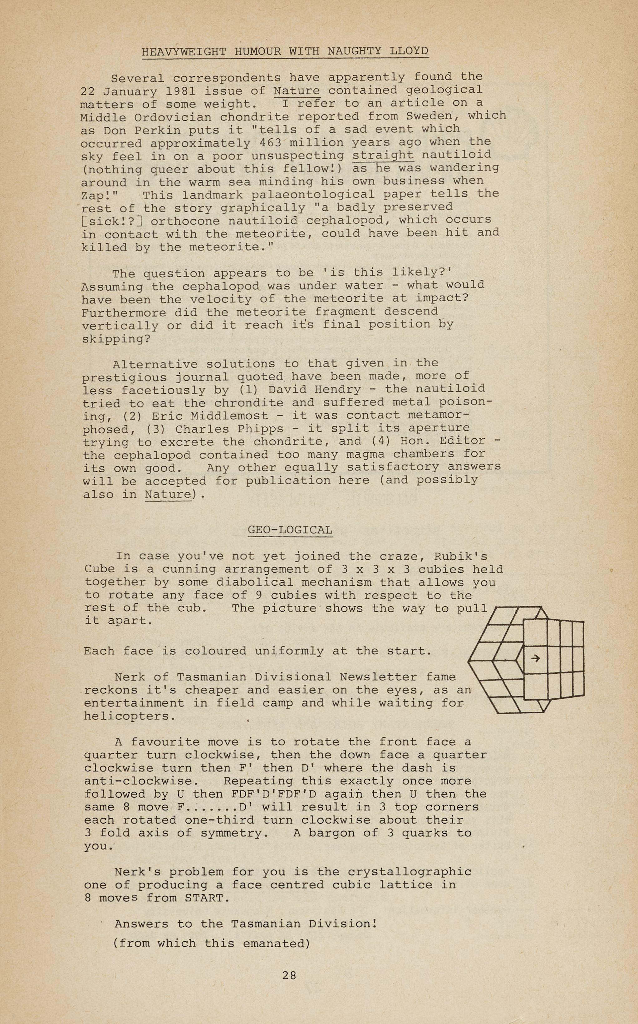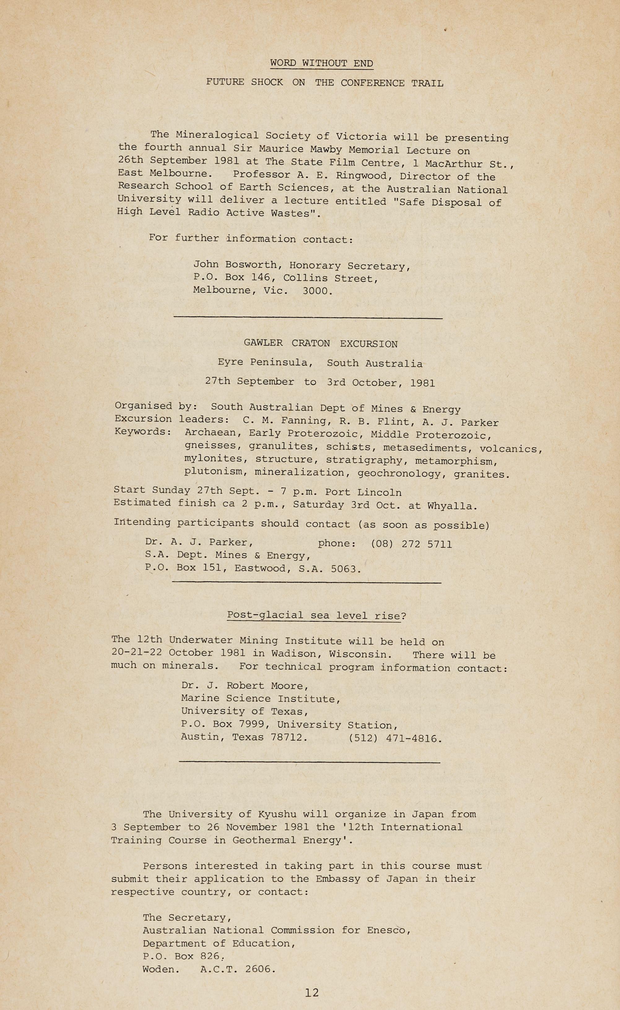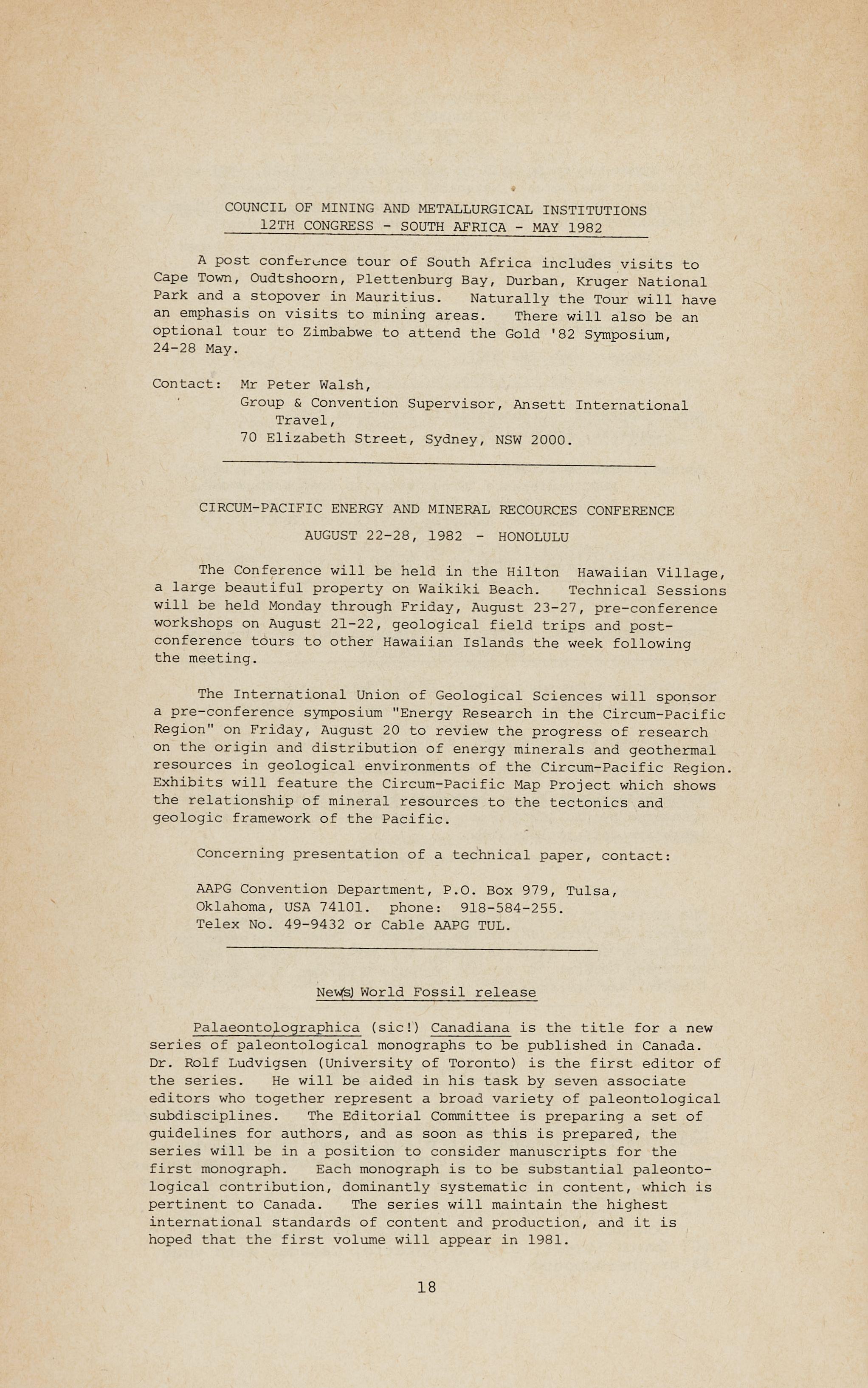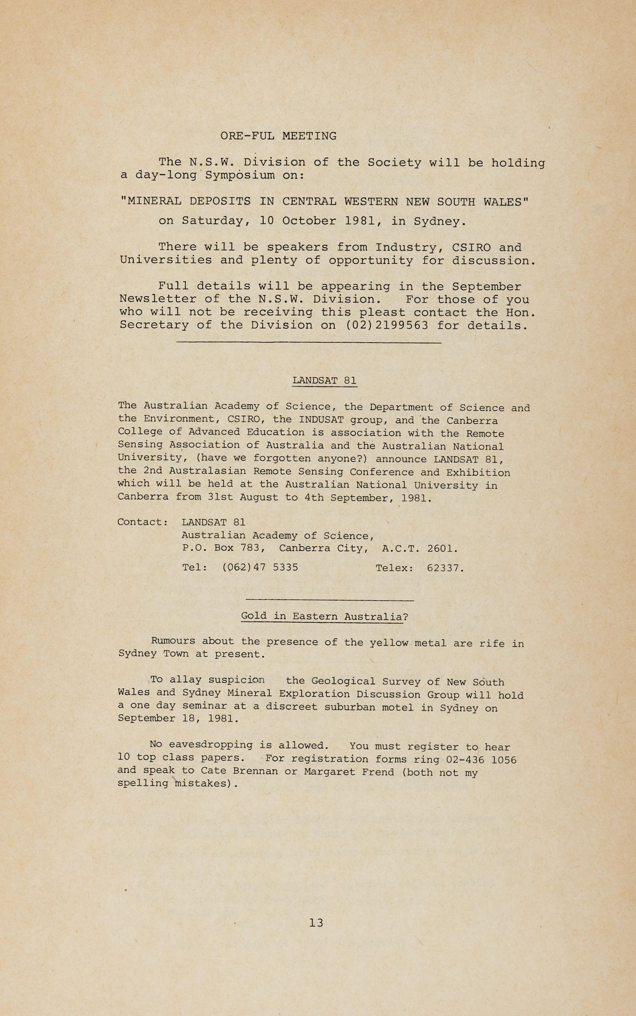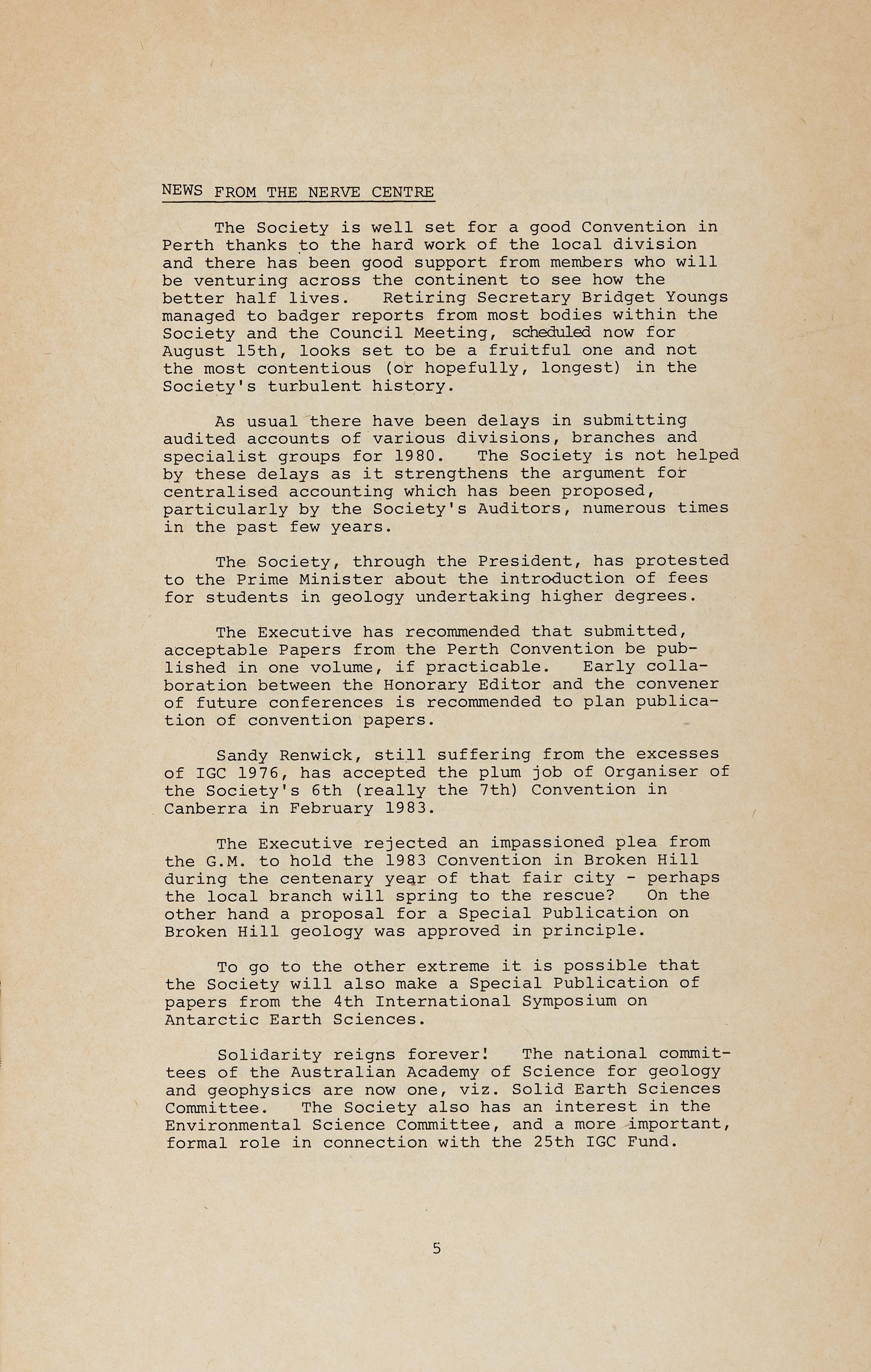 The Executive rejected an impassioned plea from the G.M. to hold the 1983 Convention in Broken Hill during the centenary yeqr of that fair city - perhaps the local branch will spring to the rescue? On the other hand a proposal for a Special Publication on Broken Hill geology was approved in principle.