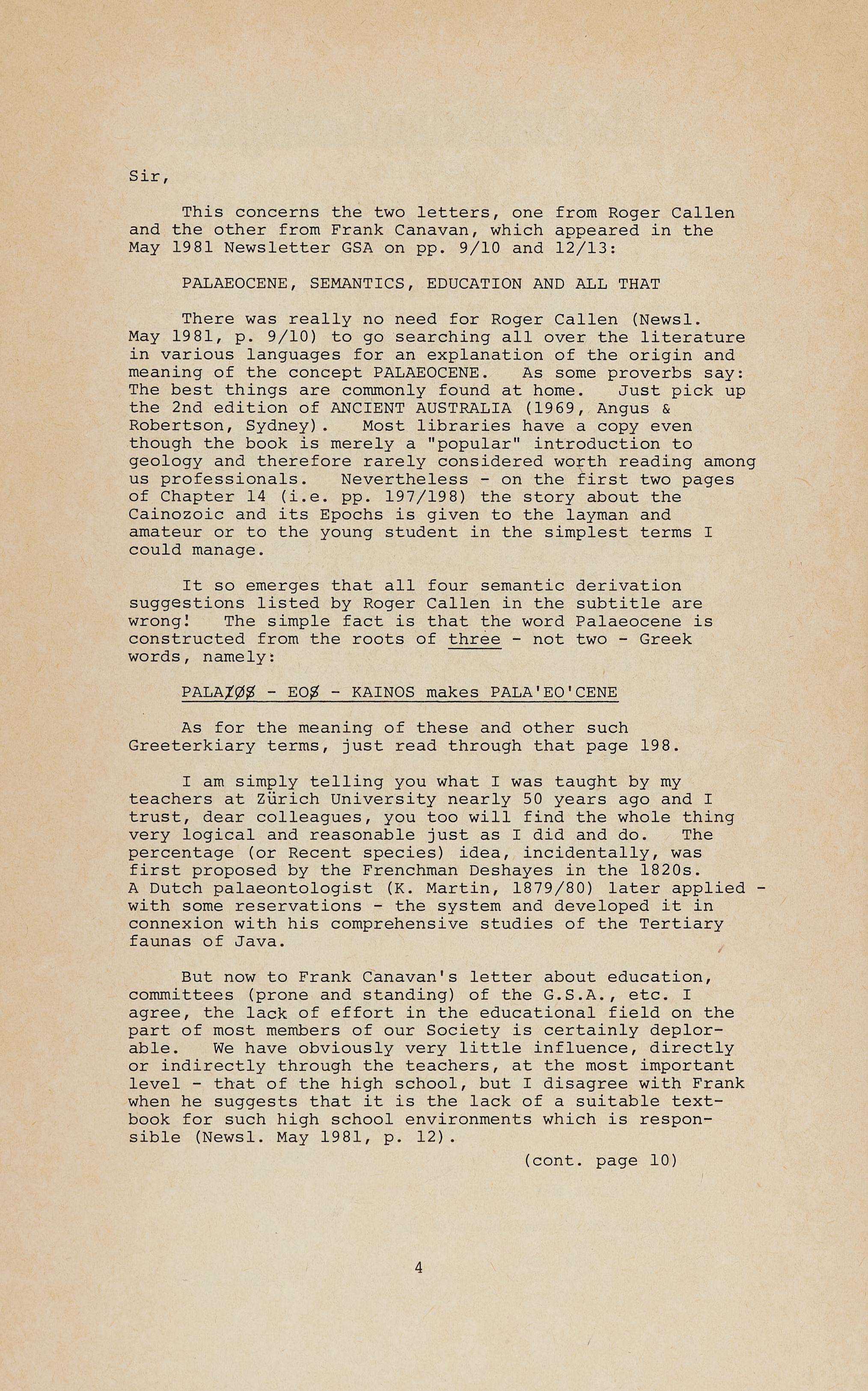 There was really no need for Roger Callen (Newsl. May 1981, p 9 / 10) to go searching all over the literature in various languages for an explanation of the origin and meaning of the concept PALAEOCENE. As some proverbs say : The best things are commonly found at home. Just pick up the 2nd edition of ANCIENT AUSTRALIA (1969, Angus & Robertson, Sydney). Most libraries have a copy even though the book is merely a "popular" introduction to geology and therefore rarely considered worth reading among us professionals . Nevertheless - on the f irst two pages of Chapter 14 (i e. pp 197/198) the story about the Cainozoic and its Epochs is given to the layman and amateur or to the young student in the simplest terms I could manage