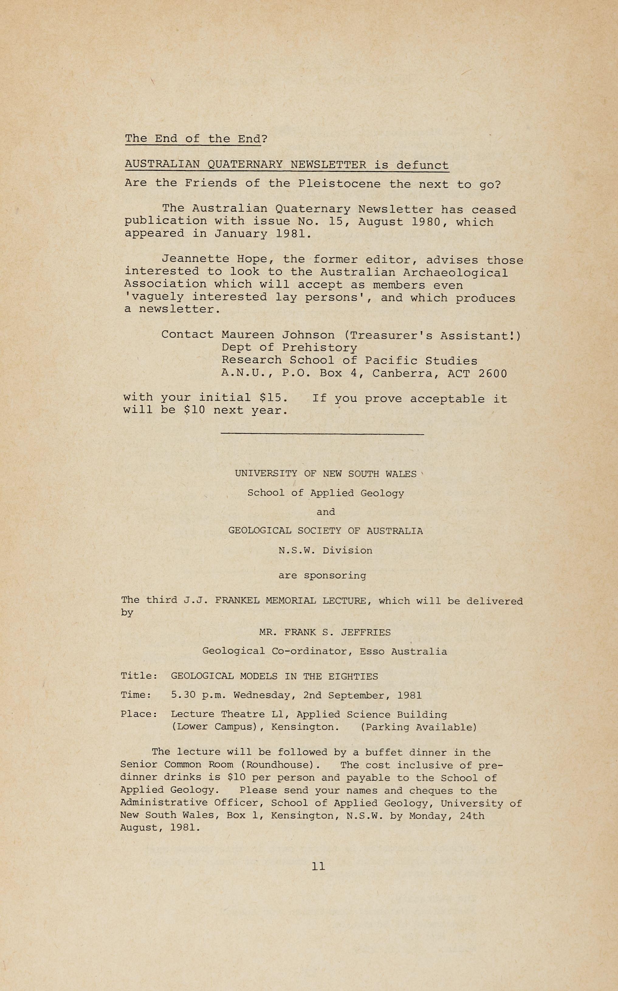 The Australian Quaternary Newsletter has ceased publication with issue No. 15, August 1980 , which appeared in January 1981.