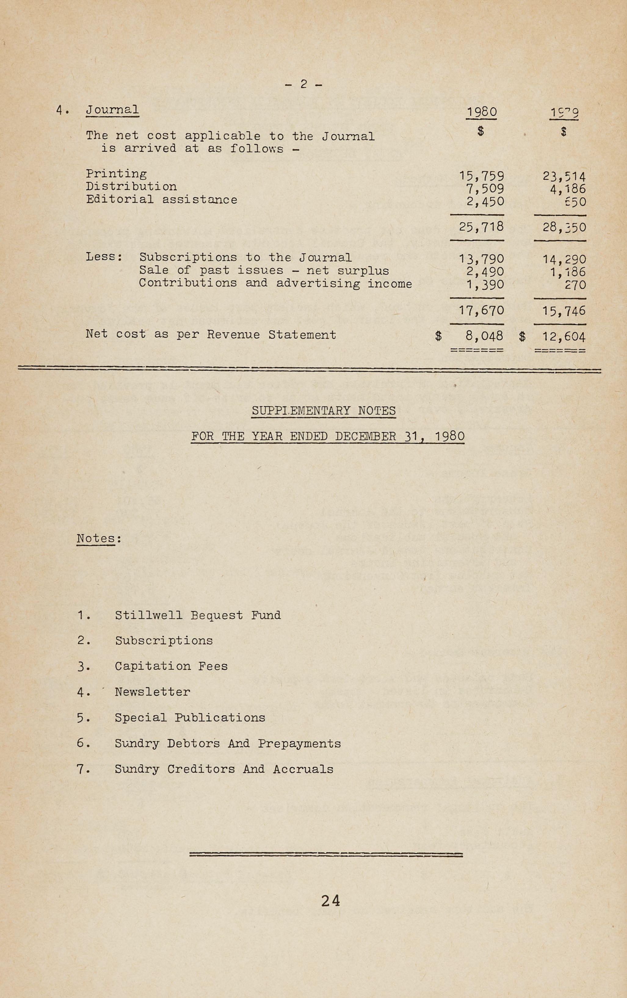 Net cost as per Revenue Statement SUPPI.EMENTARY NOTES 1980 $ 15,759 7,509 2,450 25,718 13,790 2,490 1,390 17,670 $ 8,048