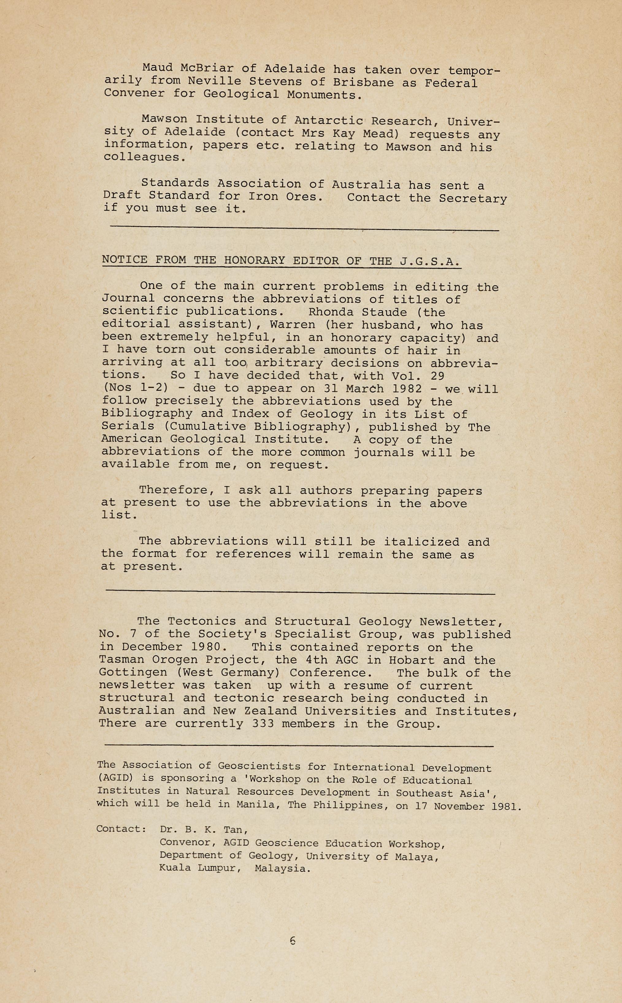 One of the main current problems in editing the Journal concerns the abbreviations of titles of scientific publications. Rhonda Staude (the editorial assistant), Warren (her husband, who has been extremel y helpful, in an honorar y capacity) and I have torn out considerable amounts of hair in arriving at all to~ arbitrar i decisions on abbreviations. So I have decided that, with Vol. 29 (Nos 1-2) - due to appear on 31 March 1982 - we will fol l ow precisel y the abbreviations used by the Bibliography and Index of Geology in its List of Serials (Cumulati v e Bibliography), published by The American Geological Institute. A copy of the abbreviations of the more common journals will be available f rom me , on request.