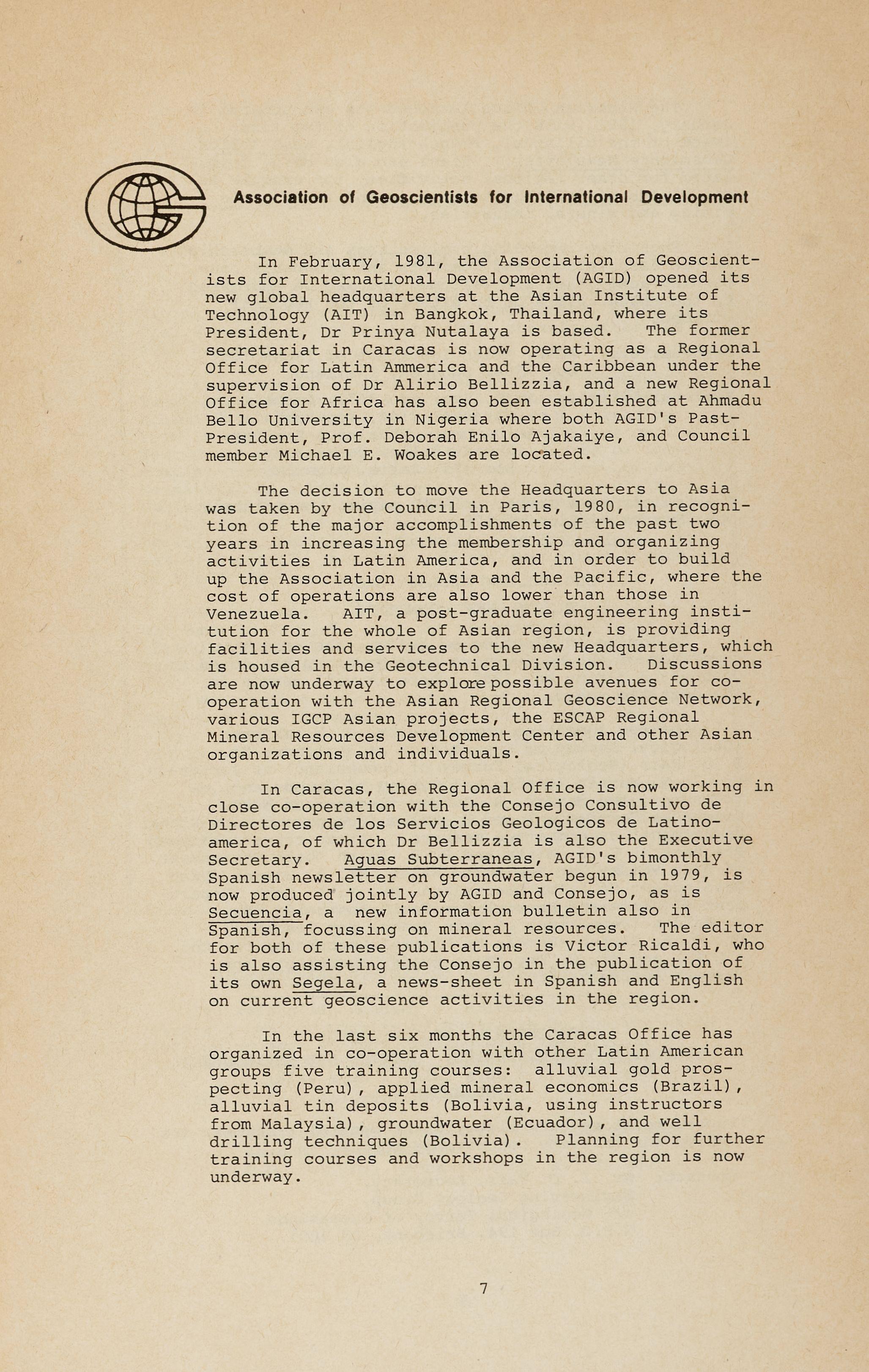 In February, 1981, the Association of Geoscientists for International Development (AGID) opened its new global headquarters at the Asian Institute of Technology (AIT) in Bangkok, Thailand, where its President, Dr Prinya Nutalaya is based. The former secretariat in Caracas is now operating as a Regional Office for Latin Ammerica and the Caribbean under the supervision of Dr Alirio Bellizzia, and a new Regional Office for Africa has also been established at Ahmadu Bello University in Nigeria where both AGID's PastPresident, Prof. Deborah Enilo Ajakaiye, and Council member Michael E. Woakes are loc~ted.
