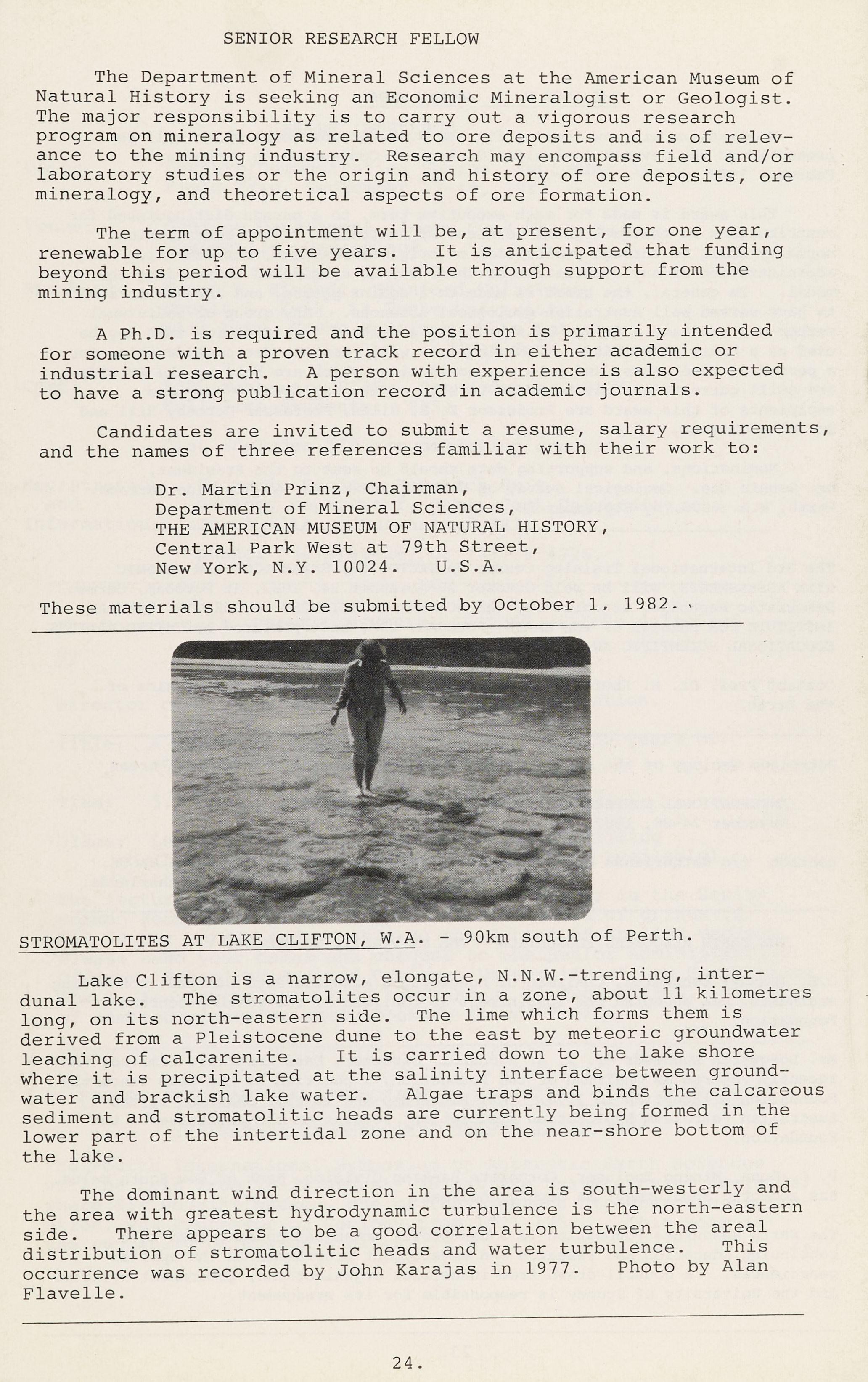 The Department of Mineral Sciences at the American Museum of Natura~ History is seeking an Economic Mineralogist or Geologist. The maJor responsibility is to carry out a vigorous research program on mineralogy as related to ore deposits and is of relevance to the mining industry. Research may encompass field and/or l~boratory studies or the origin and history of ore deposits, ore mineralogy, and theoretical aspects of ore formation.