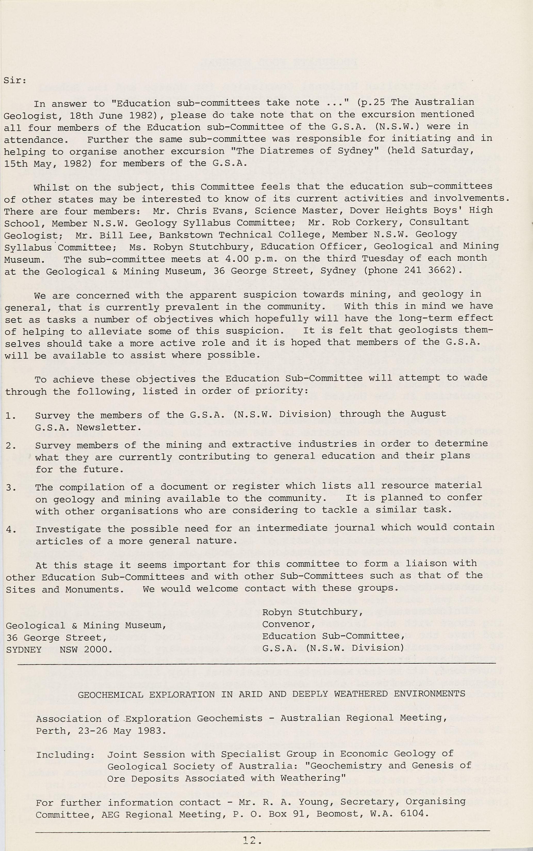 Whilst on the subject, this Committee feels that the education sub-committees of other states may be interested to know of its current activities and involvements. There are four members: Mr. Chris Evans, Science Master, Dover Heights Boys' High School, Member N.S.W. Geology Syllabus Committee; Mr. Rob Corkery, Consultant Geologist; Mr. Bill Lee, Bankstown Technical College, Member N.S.W. Geology Syllabus . Committee; Ms. Robyn Stutchbury, Education Officer, Geological and Mining Museum. The sub-committee meets at 4.00 p.m. on the third Tuesday of each month at the Geological & Mining Museum, 36 George Street, Sydney (phone 241 3662).