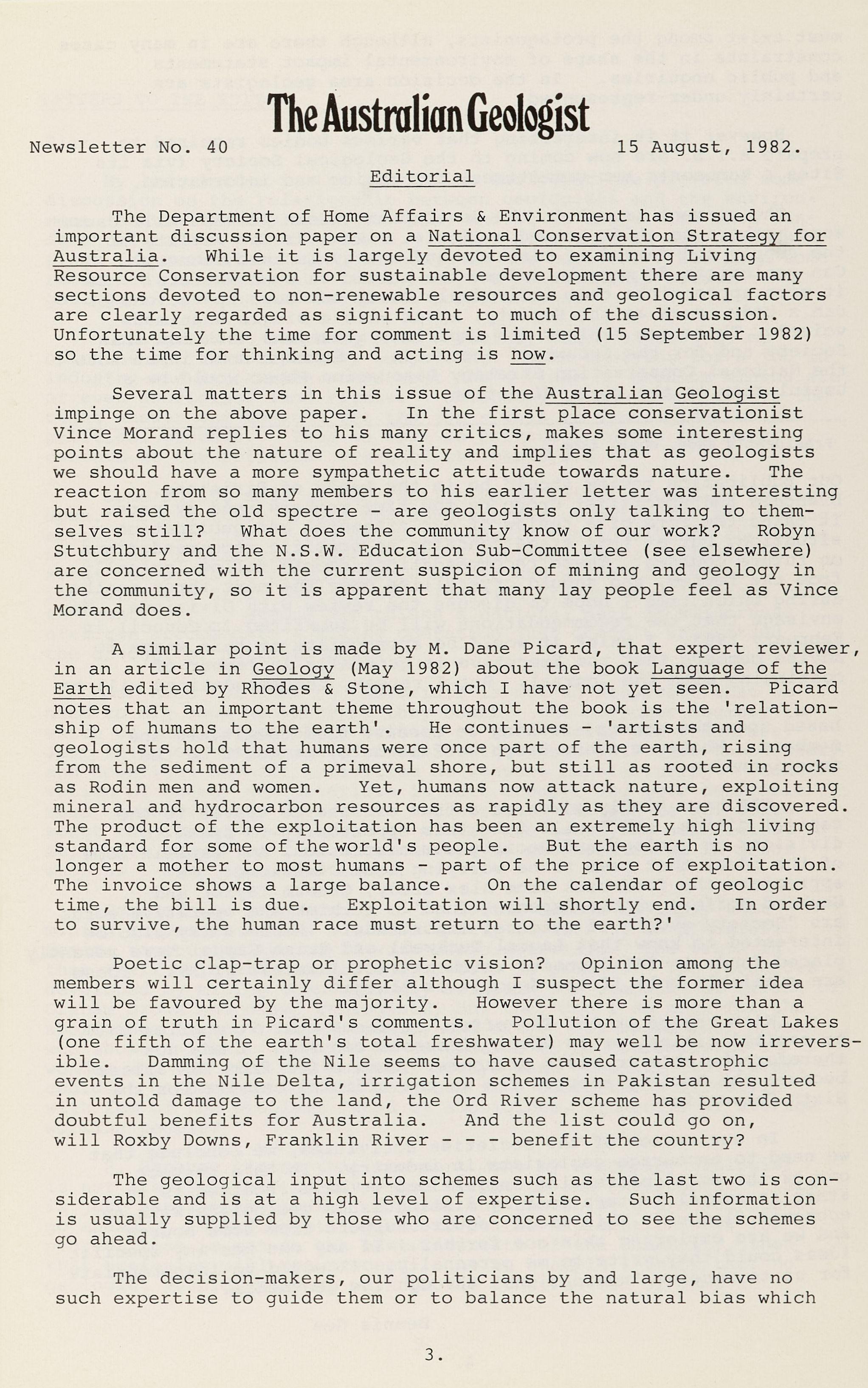 The Department of Horne Affairs & Environment has issued an important discussion paper on a National Conservation Strategy for Australia. While it is largely devoted to examining Living Resource Conservation for sustainable development there are many sections devoted to non-renewable resources and geological factors are clearly regarded as significant to much of the discussion. Unfortunately the time for comment is limited (15 September 1982) so the time for thinking and acting is now.