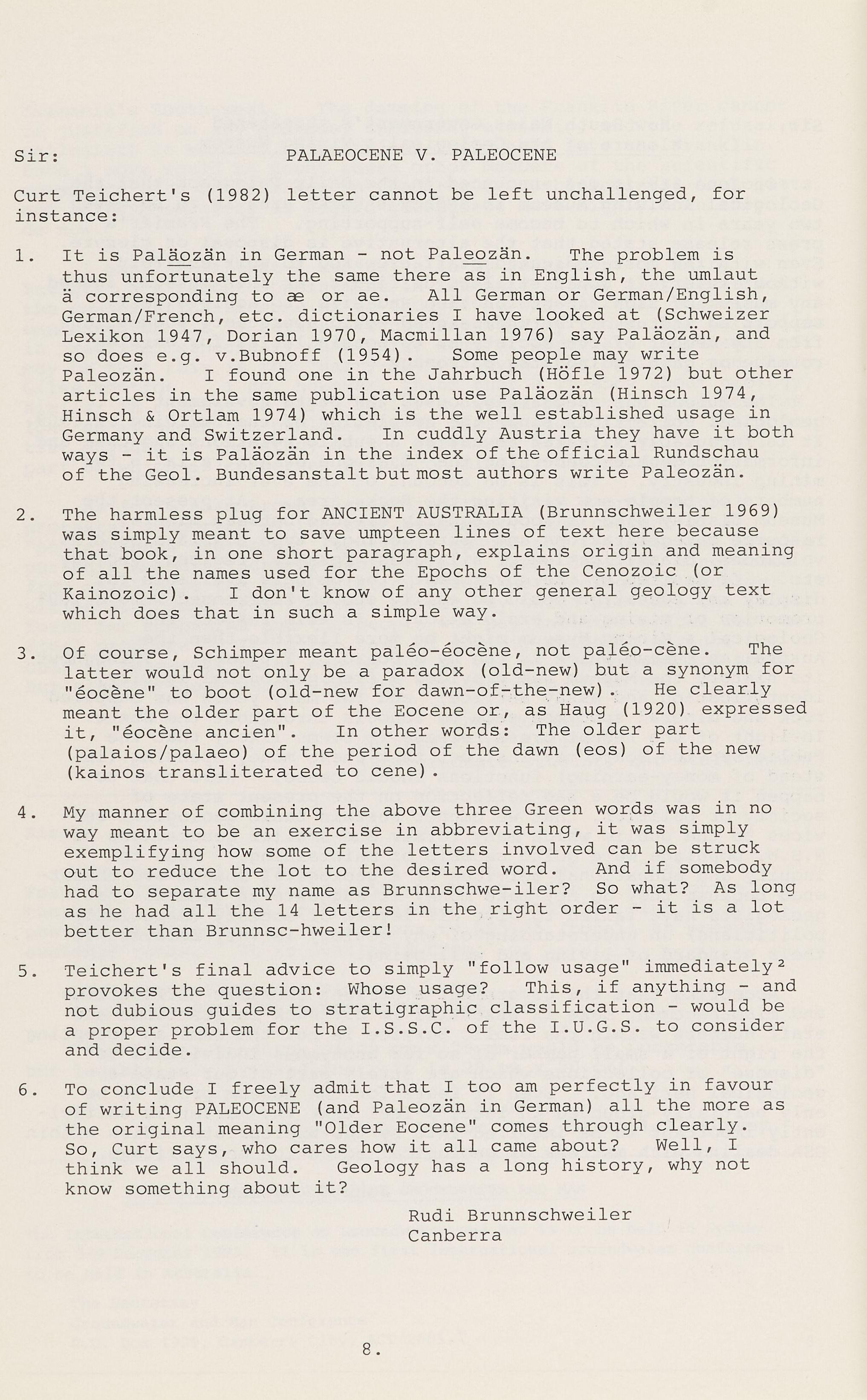 6. To conclude I freely admit that I too am perfectly in favour of writing PALEOCENE (and Paleozan in German) all the more as the original meaning "Older Eocene" comes through clearly. So, Curt says, who cares how it all came about? Well, I think we all should. Geology has a long history, why not know something about it?