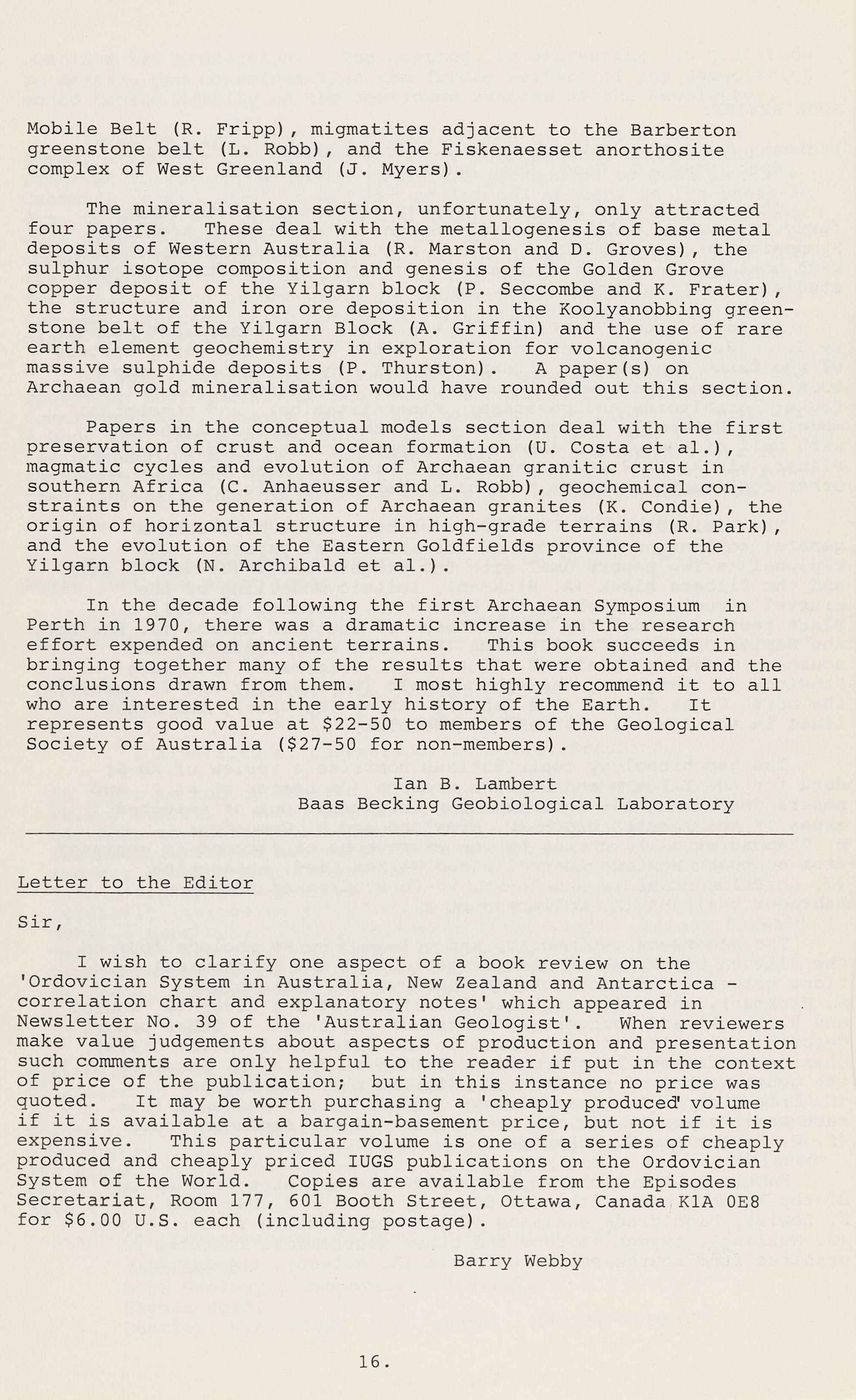 Ian Percival's review of "Illustrations of New Zealand Fossils" (The Australian Geologist, March 1982) is perceptive and thorough . The price of this handbook is NZ$5.S0, plus $2.40 postage (surface mail), equivalent to A$5.75 (total) at present exchange rates. It is available from: