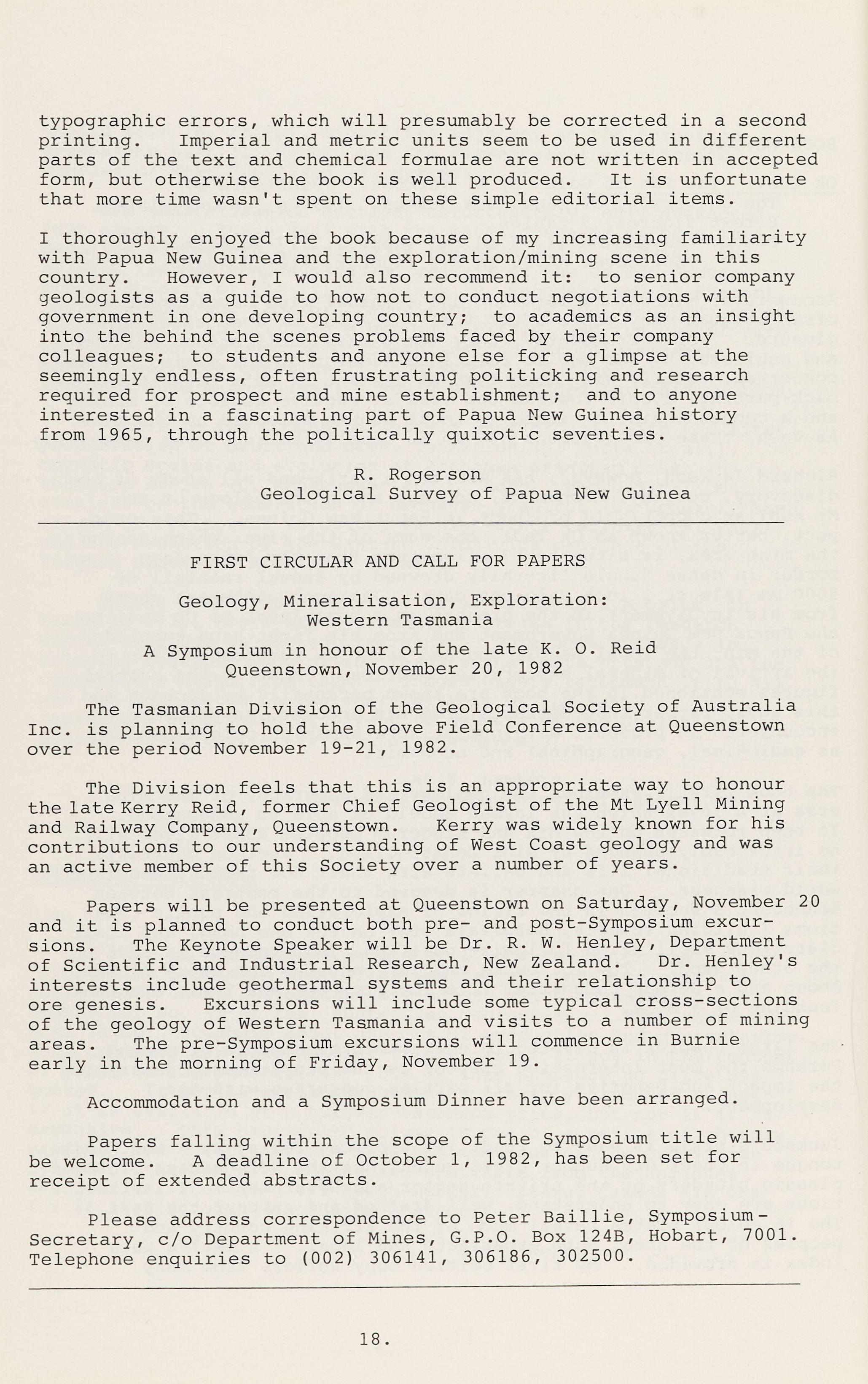 Papers will be presented at Queenstown on Saturday, November 20 and it is planned to conduct both pre- and post-Symposium excursions. The Keynote Speaker will be Dr R. W. Henley, Department of Scientific and Industrial Research, New Zealand. Dr. Henley's interests include geothermal systems and their relationship to ore genesis. Excursions will include some typical cross-sections of the geology of Western Tasmania and visits to a number of mining areas. The pre-Symposium excursions will commence in Burnie early in the morning of Friday, November 19.