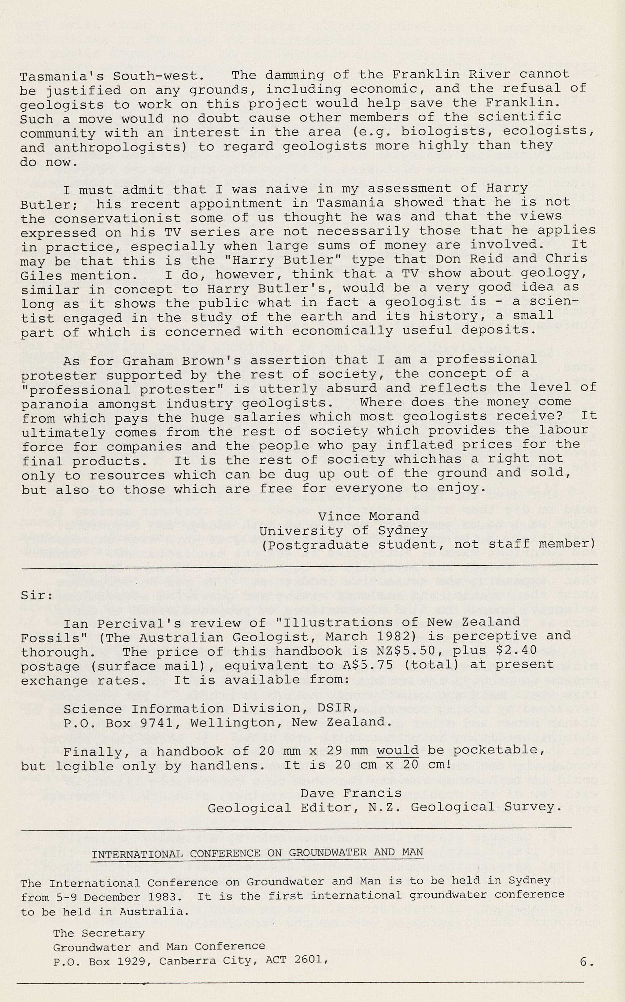 I must admit that I was naive in my assessment of Harry Butler; his recent appointment in Tasmania showed that he is not the conservationist some of us thought he was and that the views expressed on his TV series are not necessarily those that he applies in practice, especially when large sums of money are involved It may be that this is the "Harry Butler" type that Don Reid and Chris Giles mention. I do, however, think that a TV show about geology, similar in concept to Harry Butler's, would be a very good idea as long as it shows the public what in fact a geologist is -a scientist engaged in the study of the earth and its history, a small part of which is concerned with economically useful deposits.