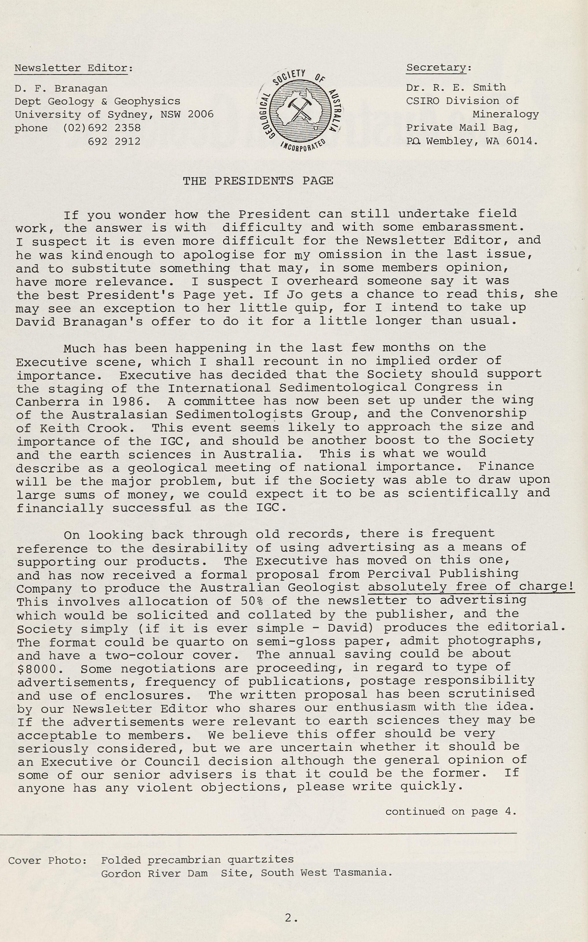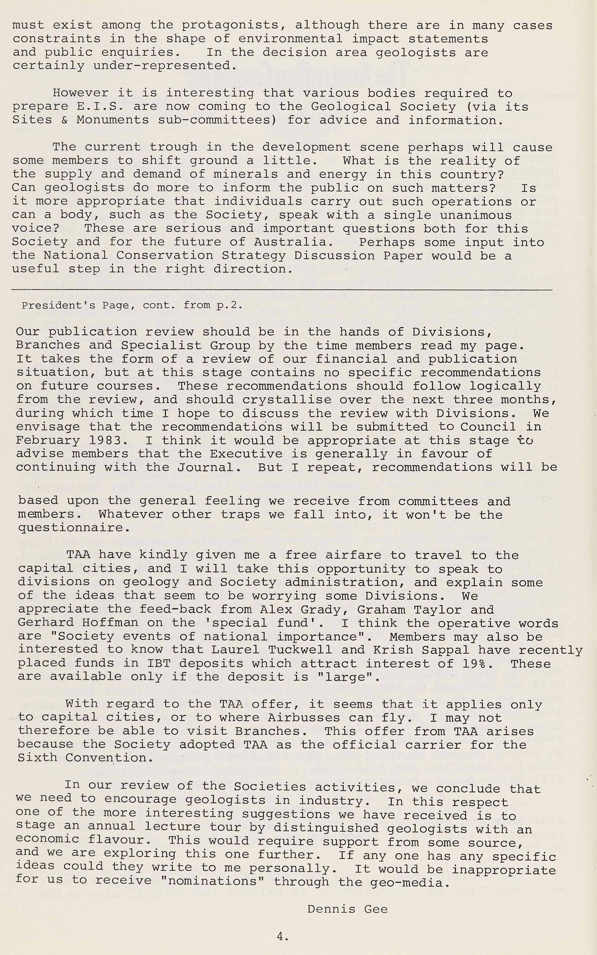 The current trough in the development scene perhaps will cause some members to shift ground a little. What is the reality of the supply and demand of minerals and energy in this country? Can geologists do more to inform the public on such matters? Is it more appropriate that individuals carry out such operations or can a body, such as the Society, speak with a single unanimous voice? These are serious and important questions both for this Society and for the future of Australia. Perhaps some input into the National Conservation Strategy Discussion Paper would be a useful step in the right direction.