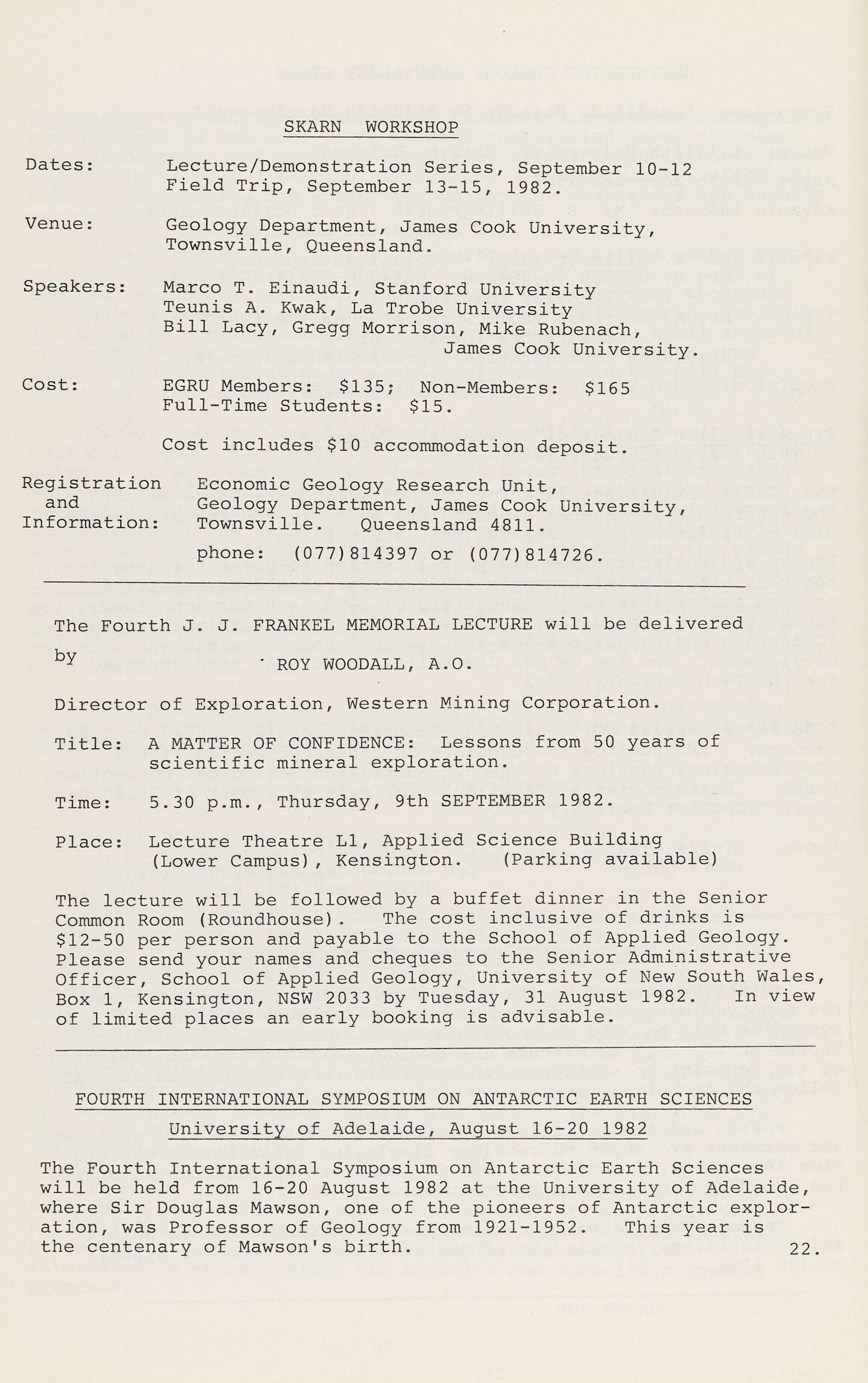 The lecture will be followed by a buffet dinner in the Senior Common Room (Roundhouse). The cost inclusive of drinks is $12-50 per person and payable to the School of Applied Geolog y. Please send your names and cheques to the Senior Administrative Officer, School of Applied Geology, University of New South Wales, Box 1, Kensington, NSW 2033 by Tuesday, 31 August 1982. In view of limited places an early booking is advisable.