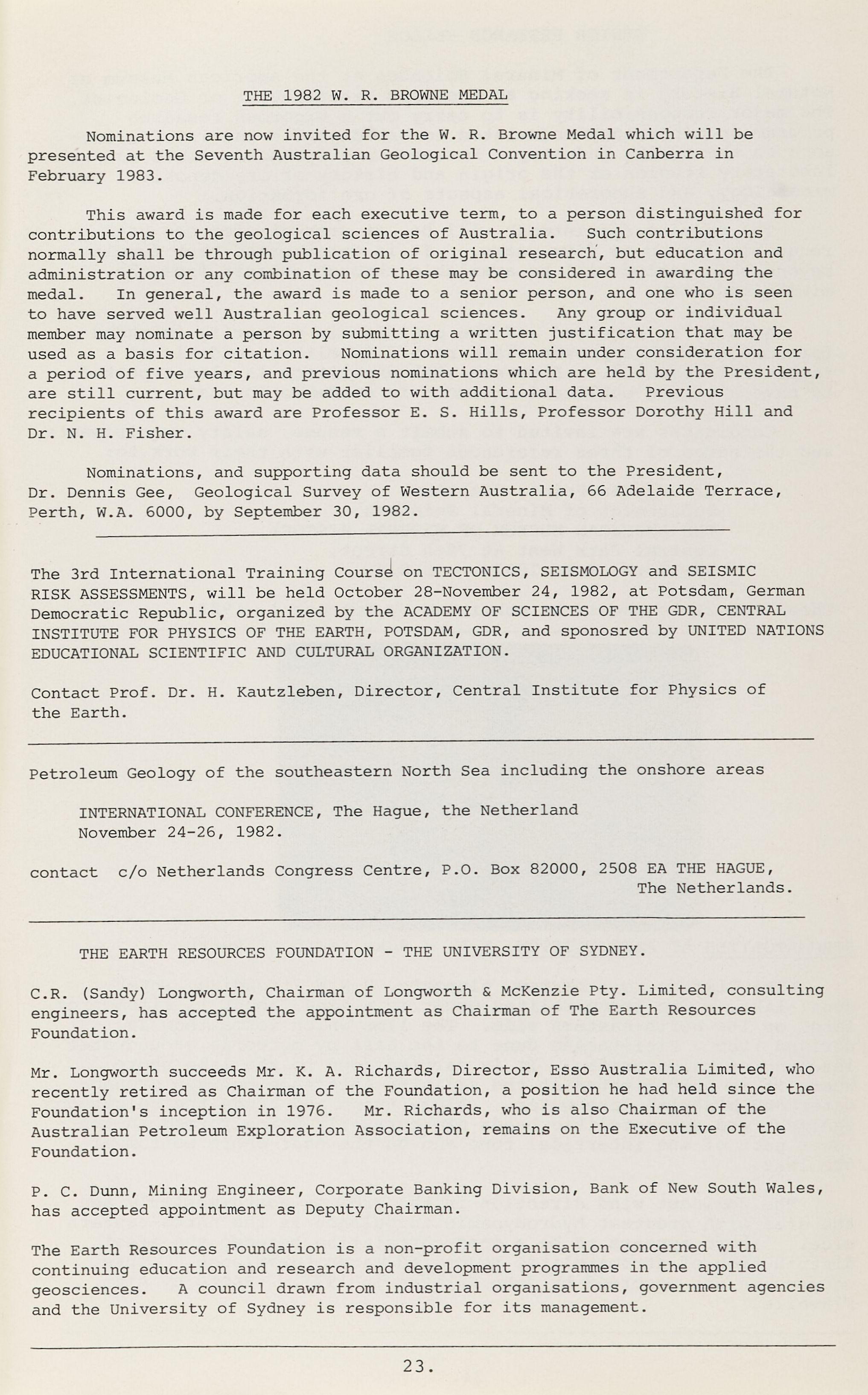 Nominations, and supporting data should be sent to the President, Dr. Dennis Gee, Geological Survey of Western Australia, 66 Adelaide Terrace, Perth, W.A. 6000, by September 30, 1982.