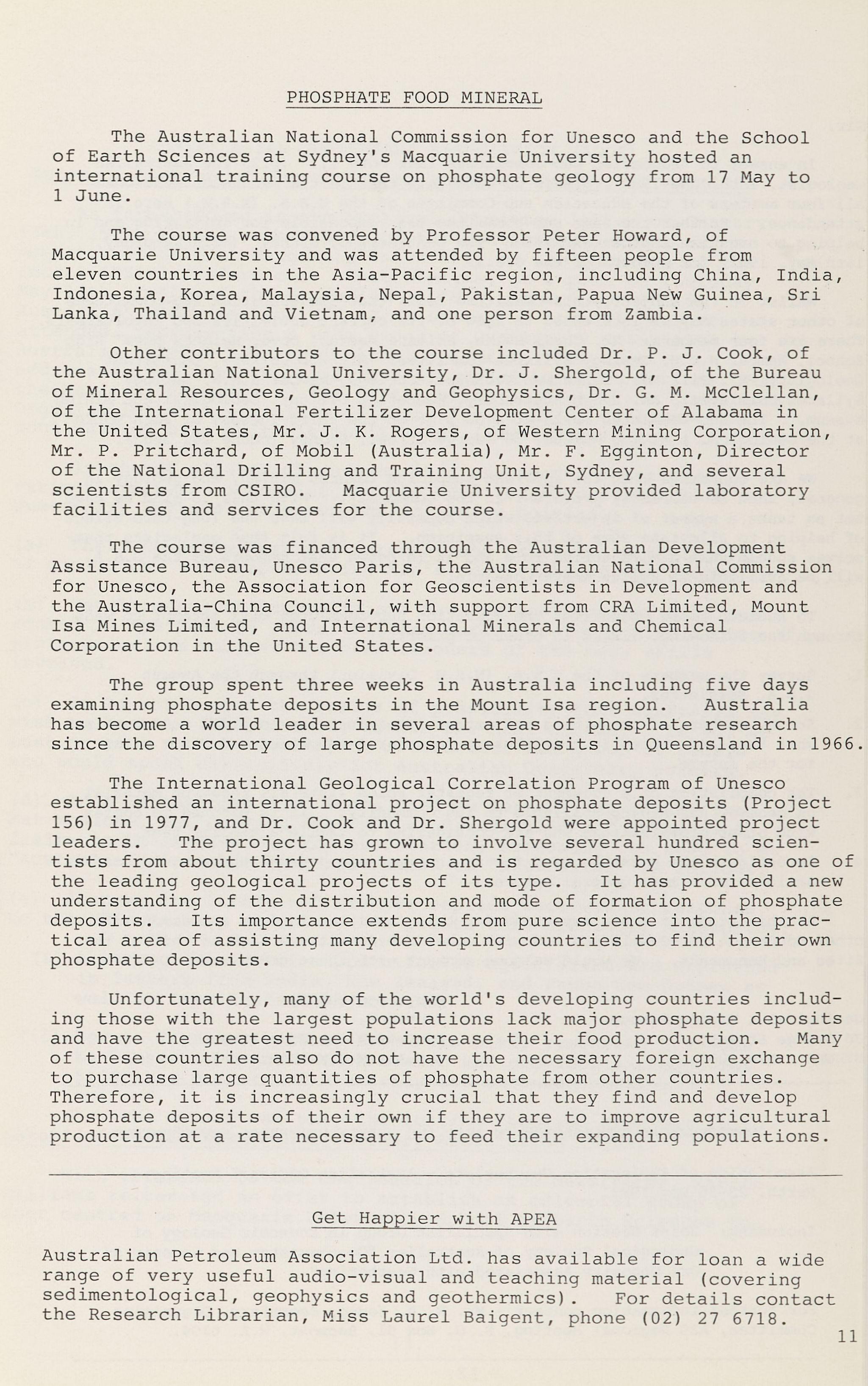 Other contributors to the course included Dr. P. J. Cook, of the Australian National University, Dr. J. Shergold, of the Bureau of Mineral Resources, Geology and Geophysics, Dr. G. M. McClellan, of the International Fertilizer Development Center of Alabama in the United States, Mr. J. K. Rogers, of Western Mining Corporation, Mr. P. Pritchard, of Mobil (Australia), Mr. F. Egginton, Director of the National Drilling and Training Unit, Sydne y , and several scientists from CSIRO. Macquarie University provided laboratory facilities and services for the course.