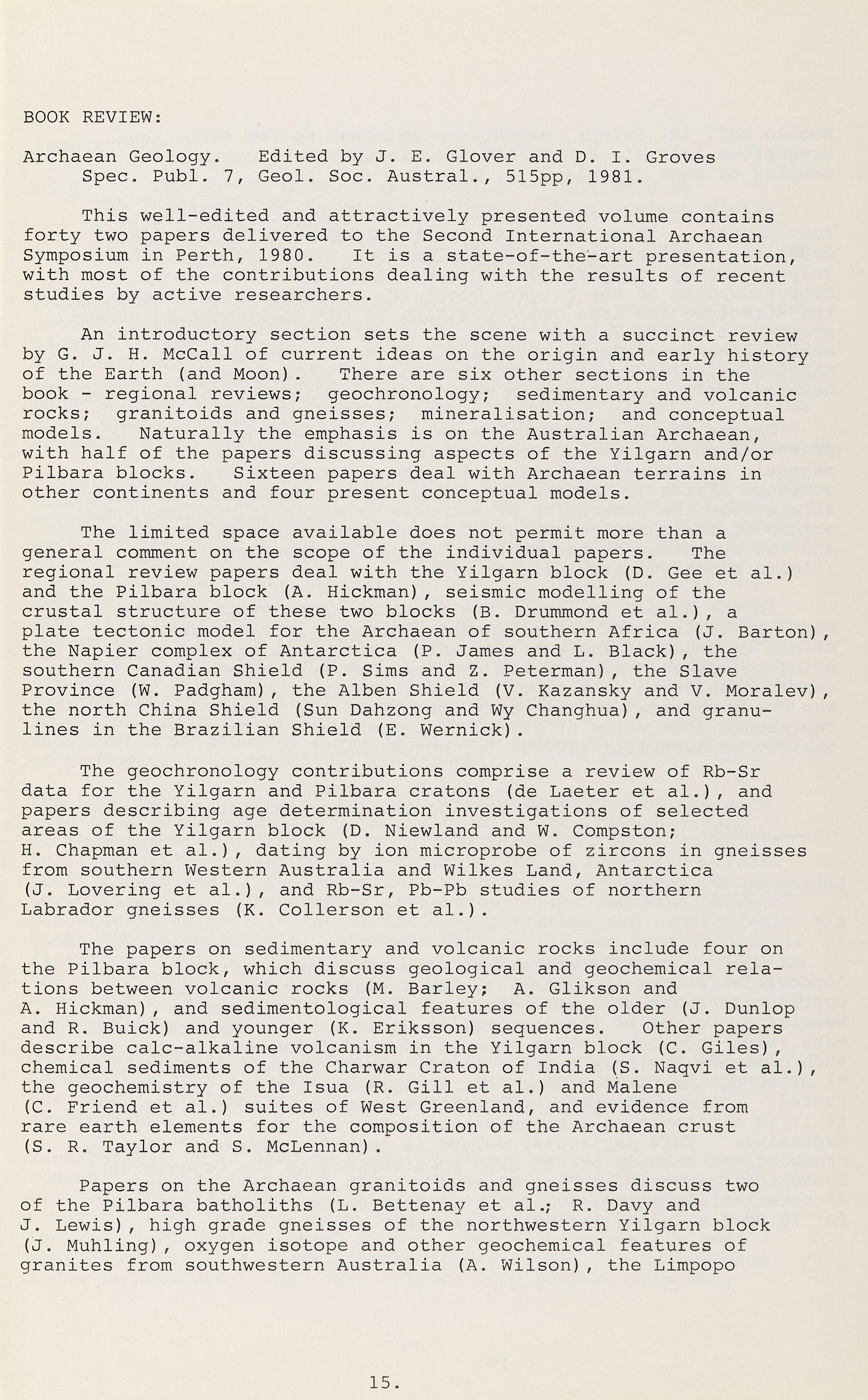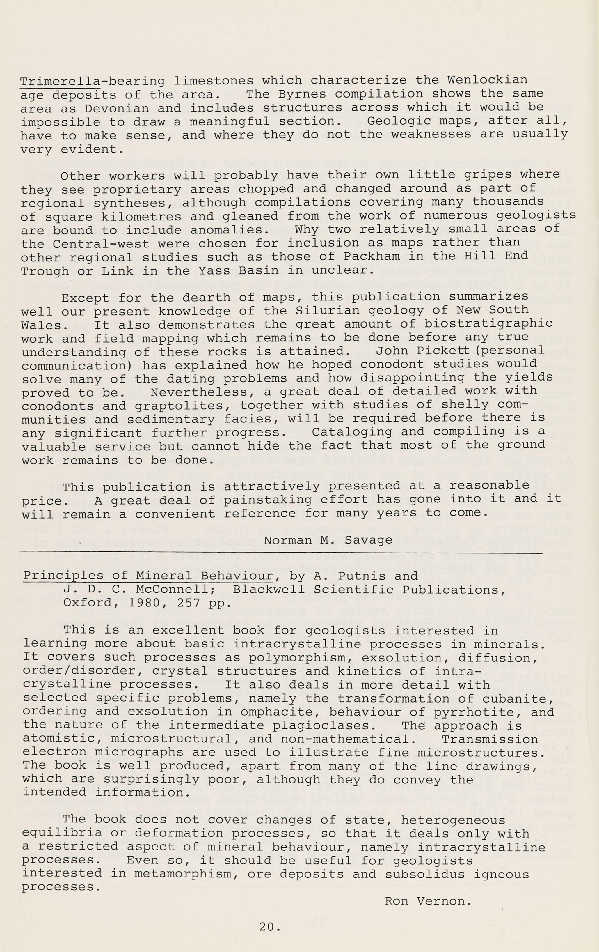 Except for the dearth of maps, this publication summarizes well our present knowledge of the Silurian geology of New South Wales. It also demonstrates the great amount of biostratigraphic work and field mapping which remains to be done before any true understanding of these rocks is attained. John Pickett (personal communication) has explained how he hoped conodont studies would solve many of the dating problems and how disappointing the yields proved to be. Nevertheless, a great deal of detailed work with conodonts and graptolites, together with studies of shelly communities and sedimentary facies, will be required before there is any significant further progress. Cataloging and compiling is a valuable service but cannot hide the fact that most of the ground work remains to be done.