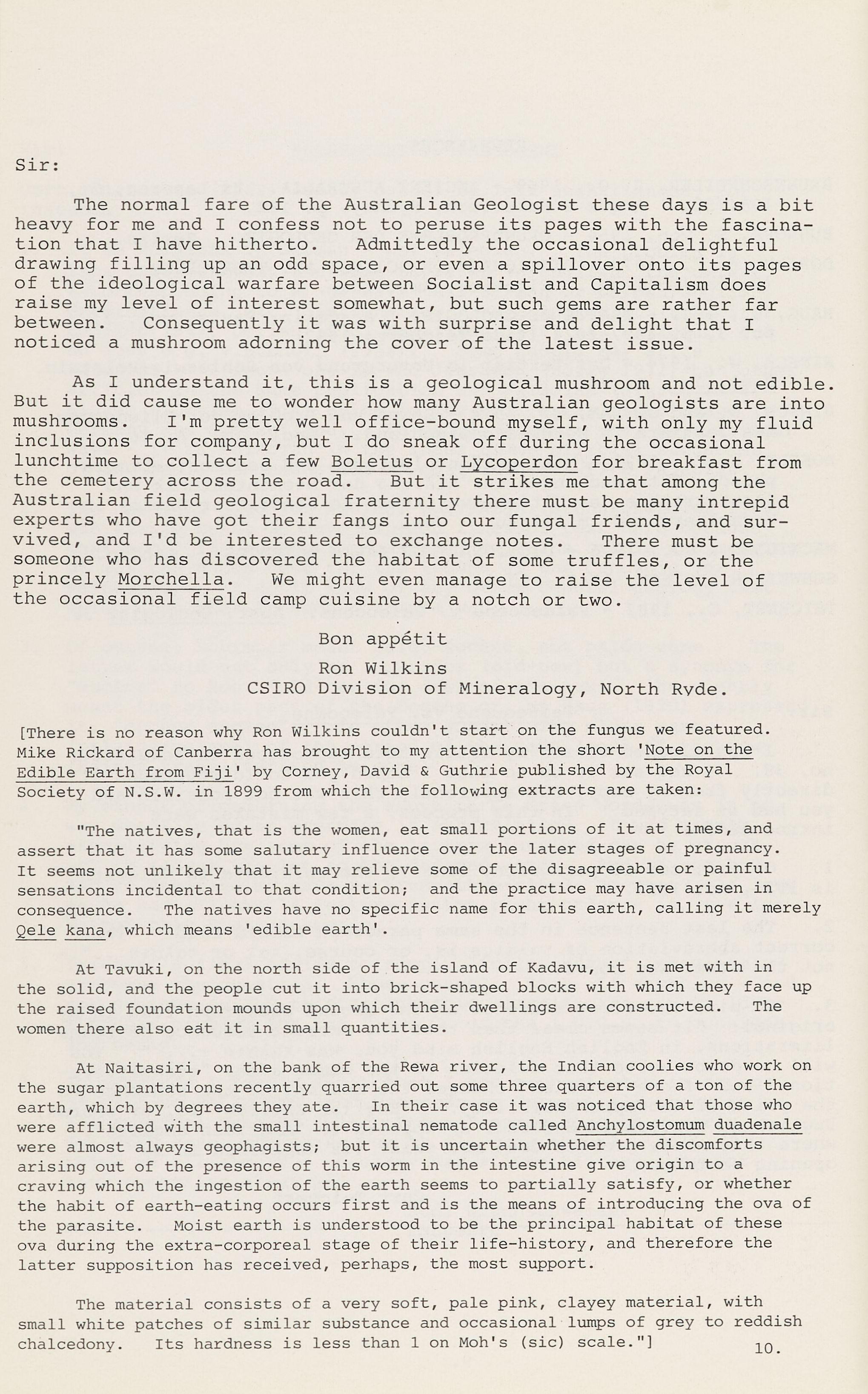 [There is no reason why Ron Wilkins couldn't start on the fungus we featured. Mike Rickard of Canberra has brought to my attention the short 'Note on the Edible Earth from Fiji' by Corney, David & Guthrie published by the Royal Society of N.S.W. in 1899 from which the following extracts are taken:
