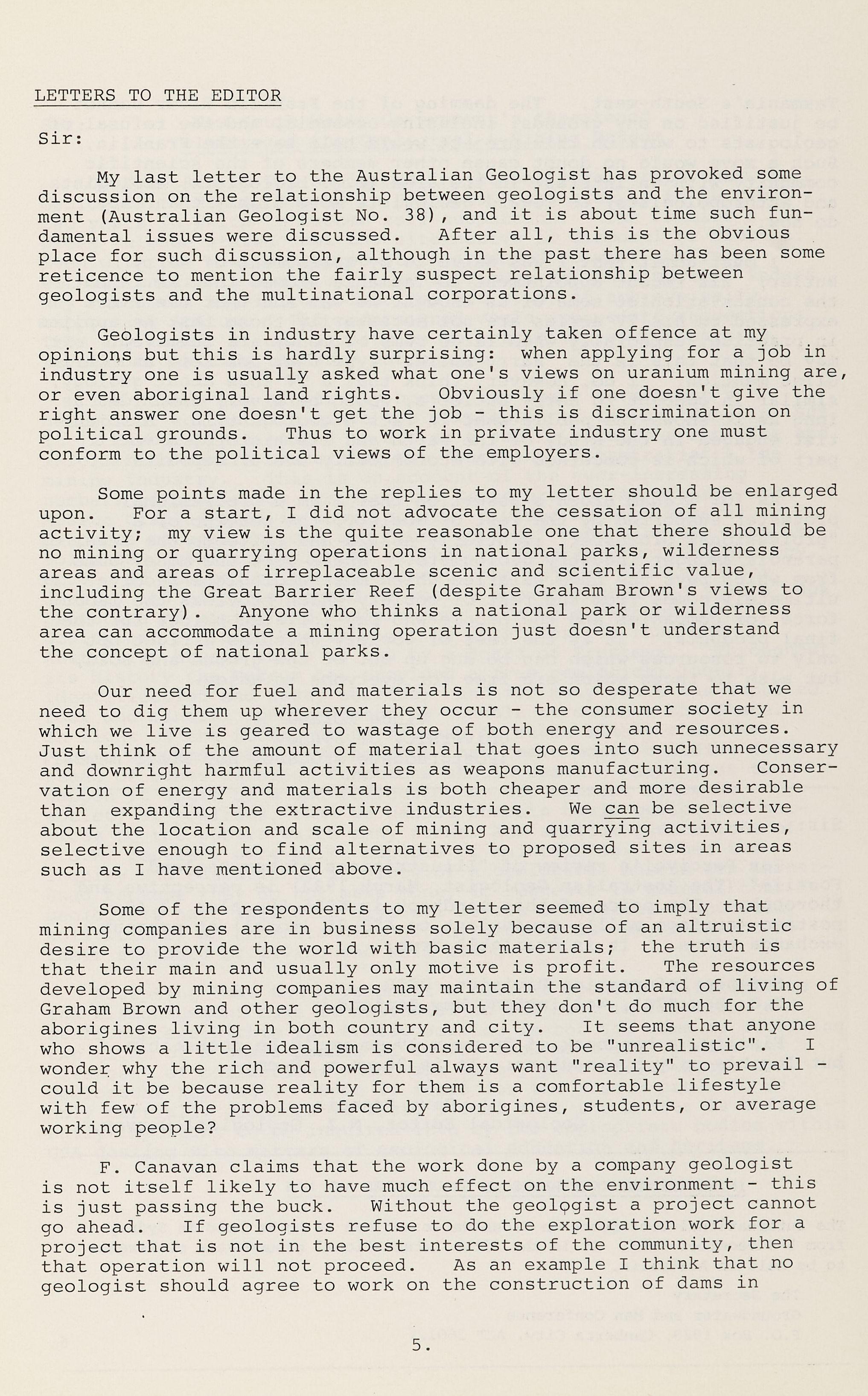 F. Canavan claims that the work done by a company geologist is not itself likely to have much effect on the environment - this is just passing the buck. Without the geol9gist a project cannot go ahead. If geologists refuse to do the exploration work for a project that is not in the best interests of the community, then that operation will not proceed. As an example I think that no geologist should agree to work on the construction of dams in