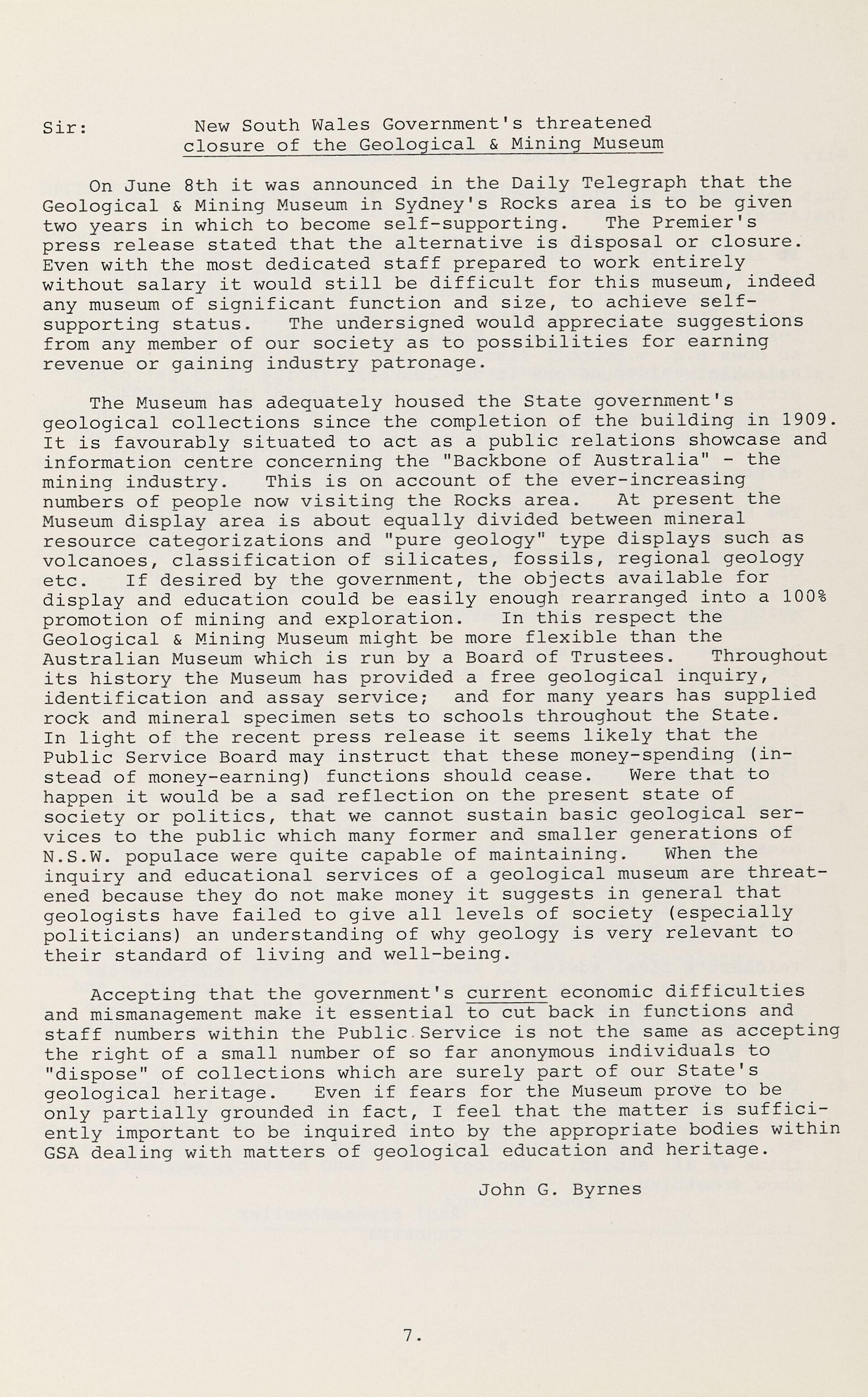 On June 8th it was announced in the Daily Telegraph that the Geological & Mining Museum in Sydney's Rocks area is to be given two years in which to become self-supporting. The Premier's press release stated that the alternative is disposal or closure. Even with the most dedicated staff prepared to work entirely without salary it would still be difficult for this museum, indeed any museum of significant function and size, to achieve selfsupporting status . The undersigned would appreciate suggestions from any member of our society as to possibilities for earning revenue or gaining industry patronage.