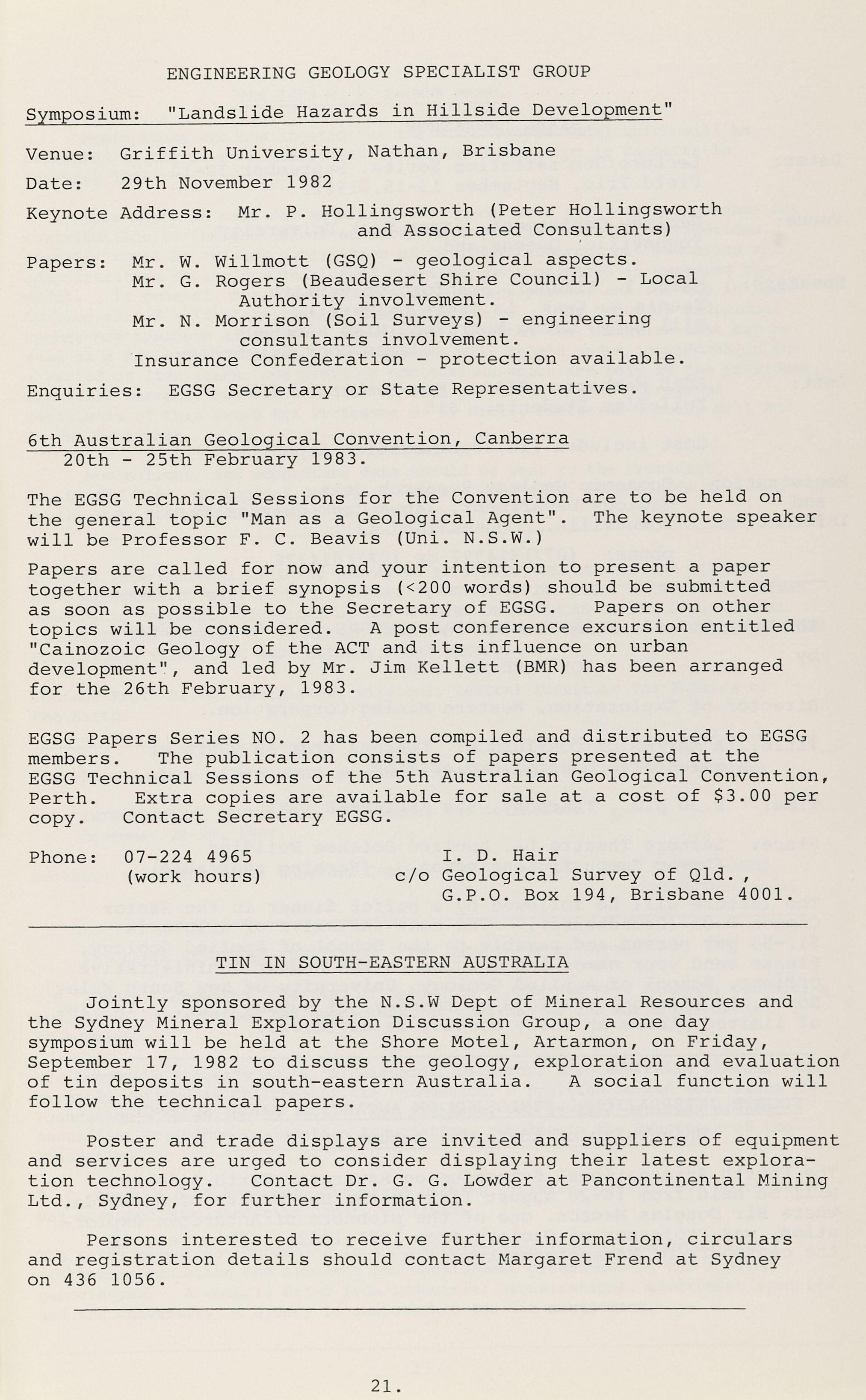 Papers are called for now and your intention to present a paper together with a brief synopsis (<200 words) should be submitted as soon as possible to the Secretary of EGSG. Papers on other topics will be considered. A post conference excursion entitled "Cainozoic Geology of the ACT and its influence on urban development", and led by Mr. Jim Kellett (BMR) has been arranged for the 26th February, 1983.
