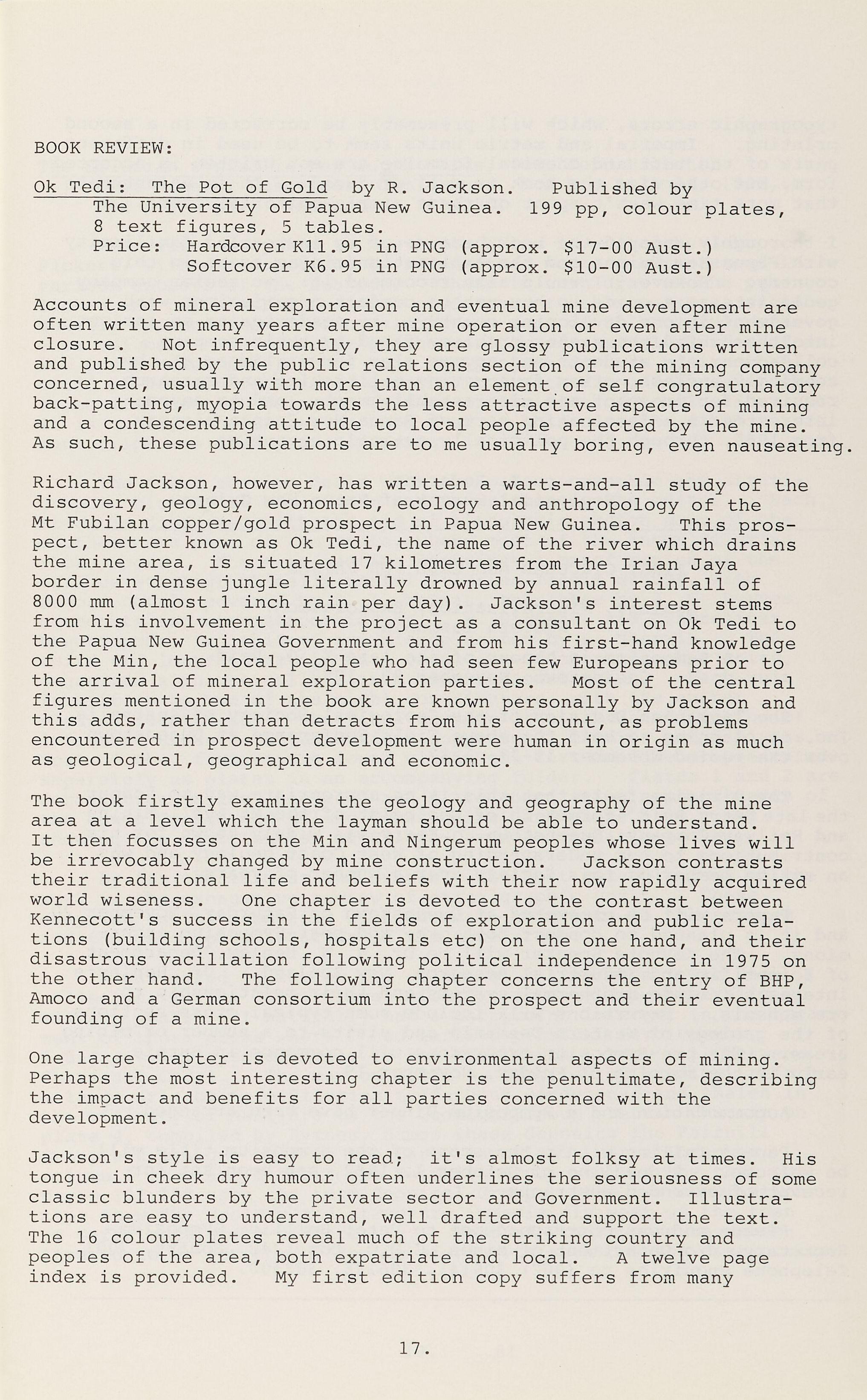 Richard Jackson, however, has written a warts-and-all study of the discovery, geology, economics, ecology and anthropology of the Mt Fubilan copper/gold prospect in Papua New Guinea. This prospect, better known as Ok Tedi, the name of the river which drains the mine area, is situated 17 kilometres from the Irian Jaya border in dense jungle literally drowned by annual rainfall of 8000 mm (almost 1 inch rain per day). Jackson's interest stems from his involvement in the project as a consultant on Ok Tedi to the Papua New Guinea Government and from his first-hand knowledge of the Min, the local people who had seen few Europeans prior to the arrival of mineral exploration parties. Most of the central figures mentioned in the book are known personally by Jackson and this adds, rather than detracts from his account, as problems encountered in prospect development were human in origin as much as geological, geographical and economic.