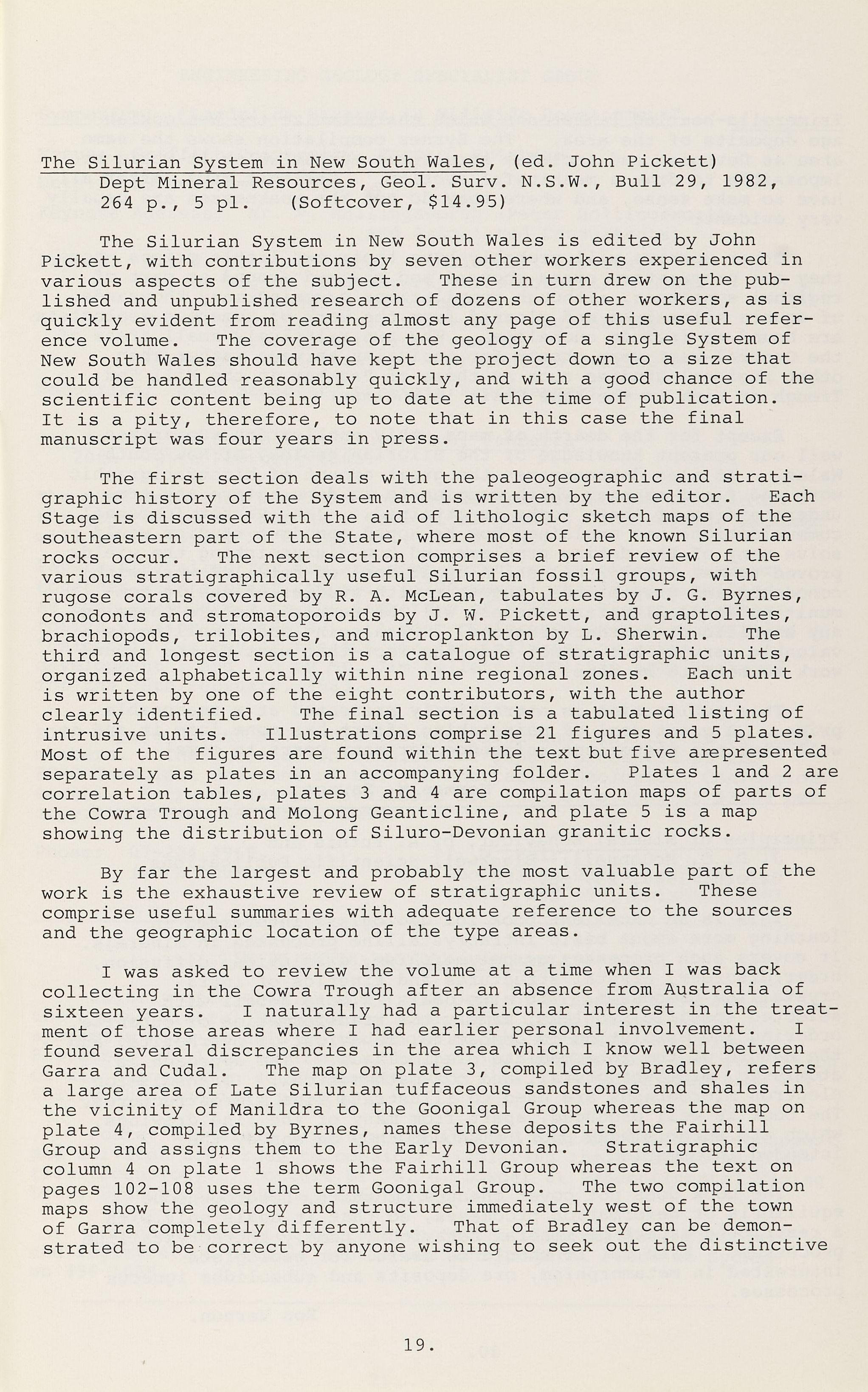 The Silurian System in New South Wales, (ed. John Pickett) Dept Mineral Resources, Geol. Surv . N.S.W., Bull 29, 1982, 264 p , 5 pl. (Softcover, $14 95)