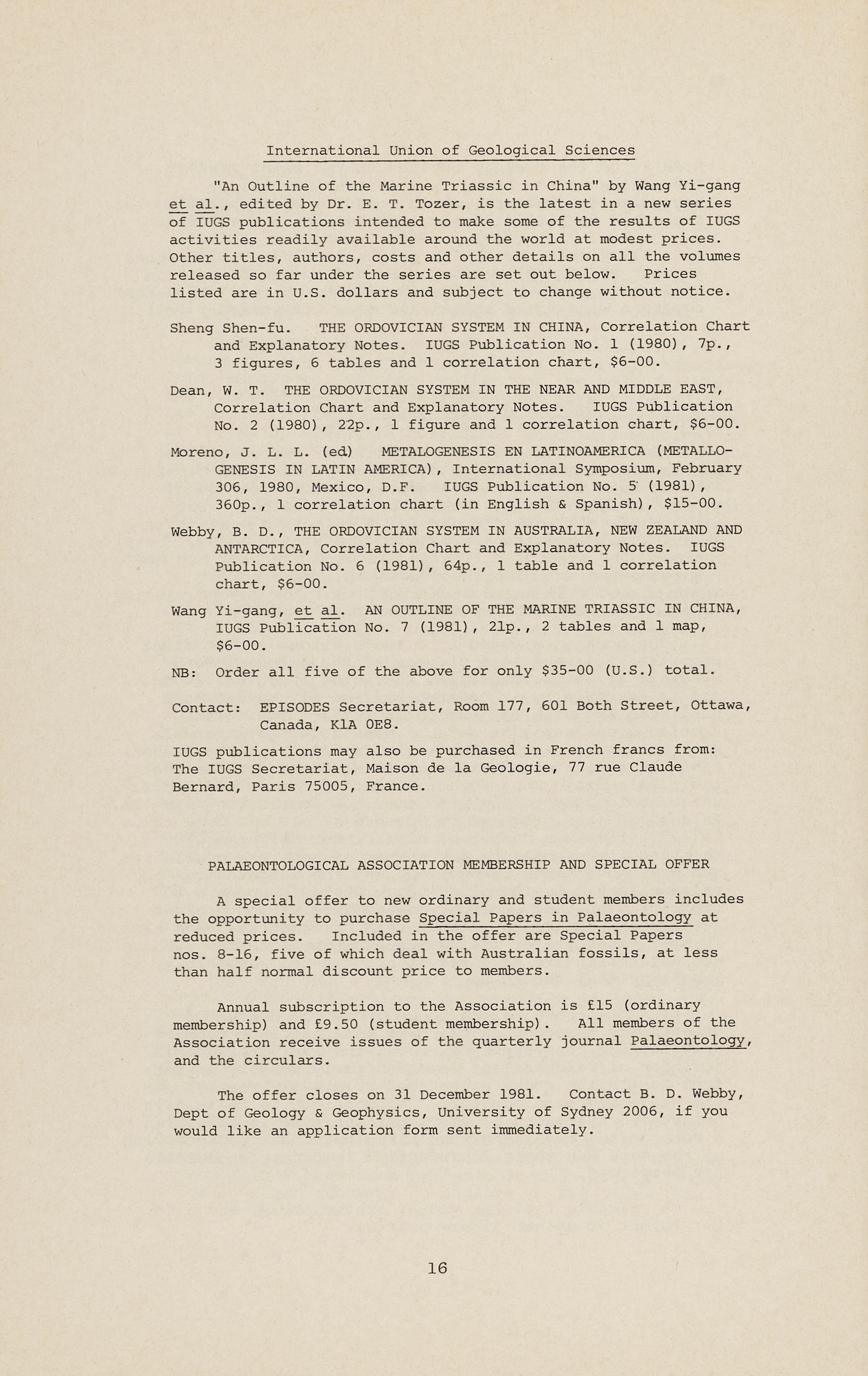 The offer closes on 31 December 1981. Cont~ct B. D. Webby, Dept of Geology & Geophysics , University of Sydney 2006, if you would like an application form sent immediately.