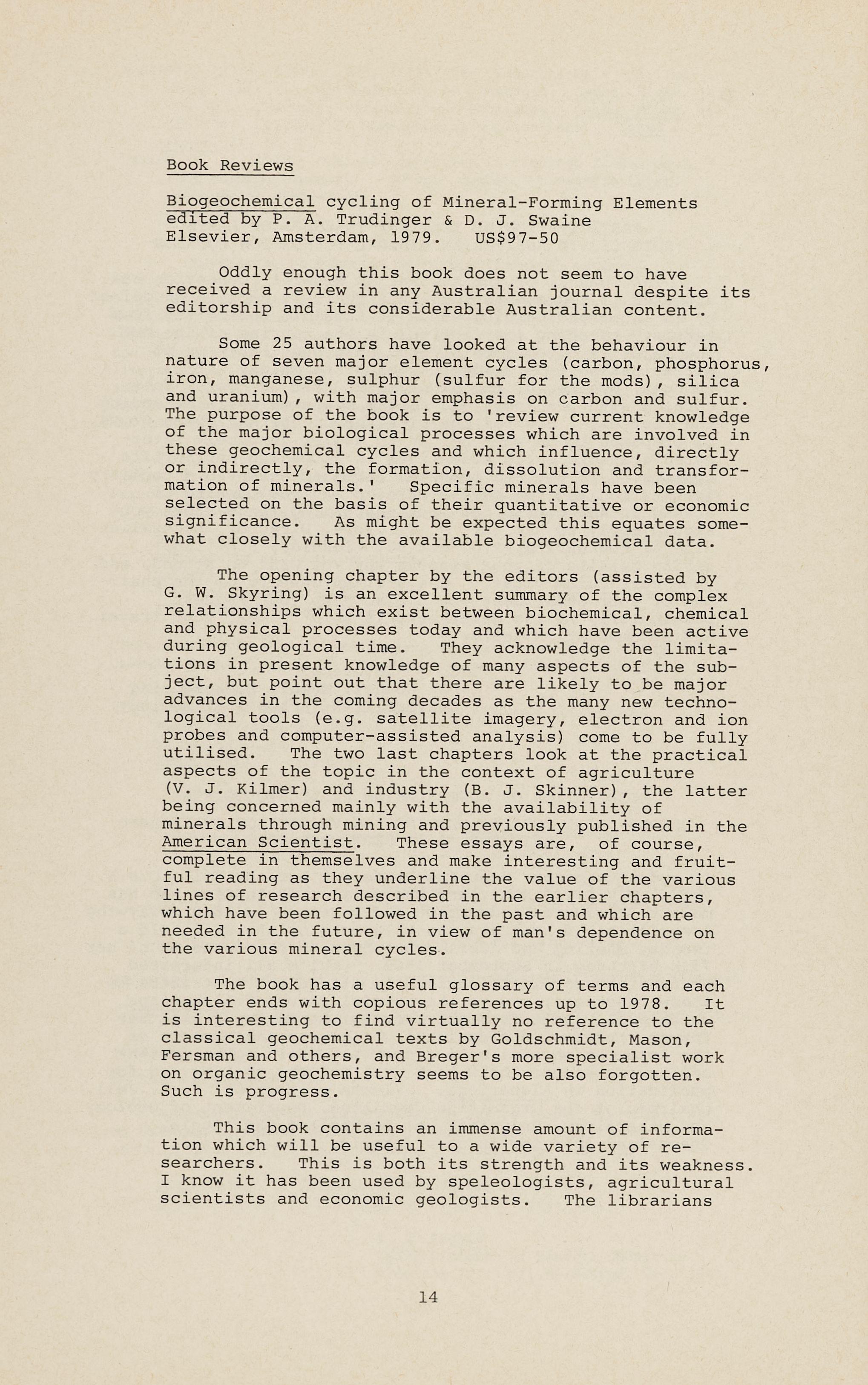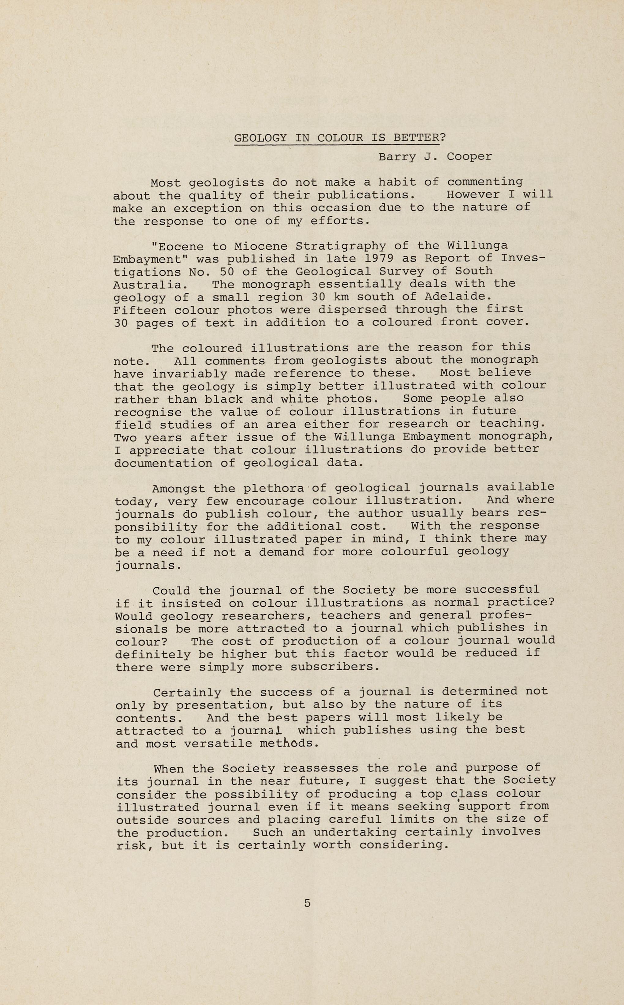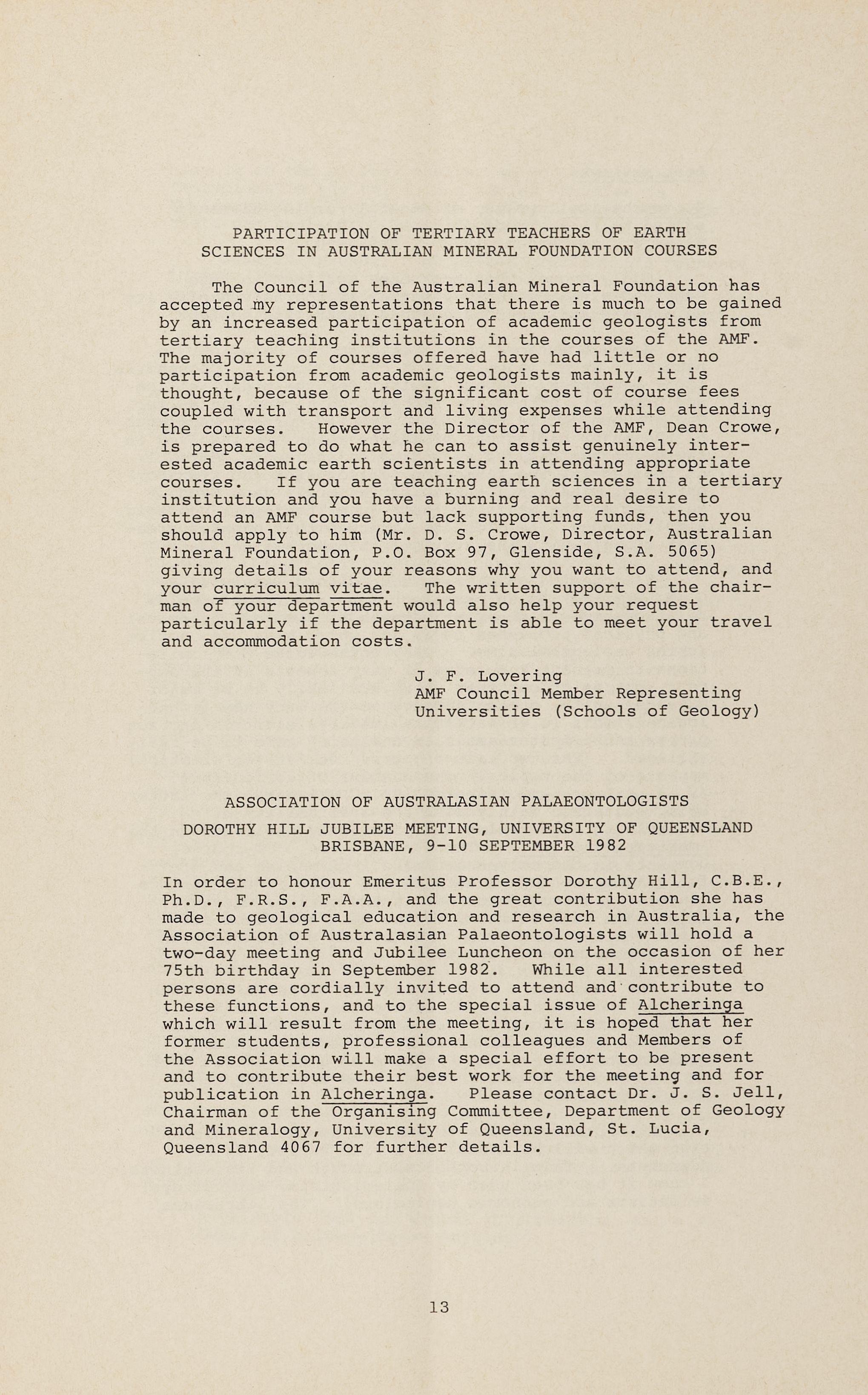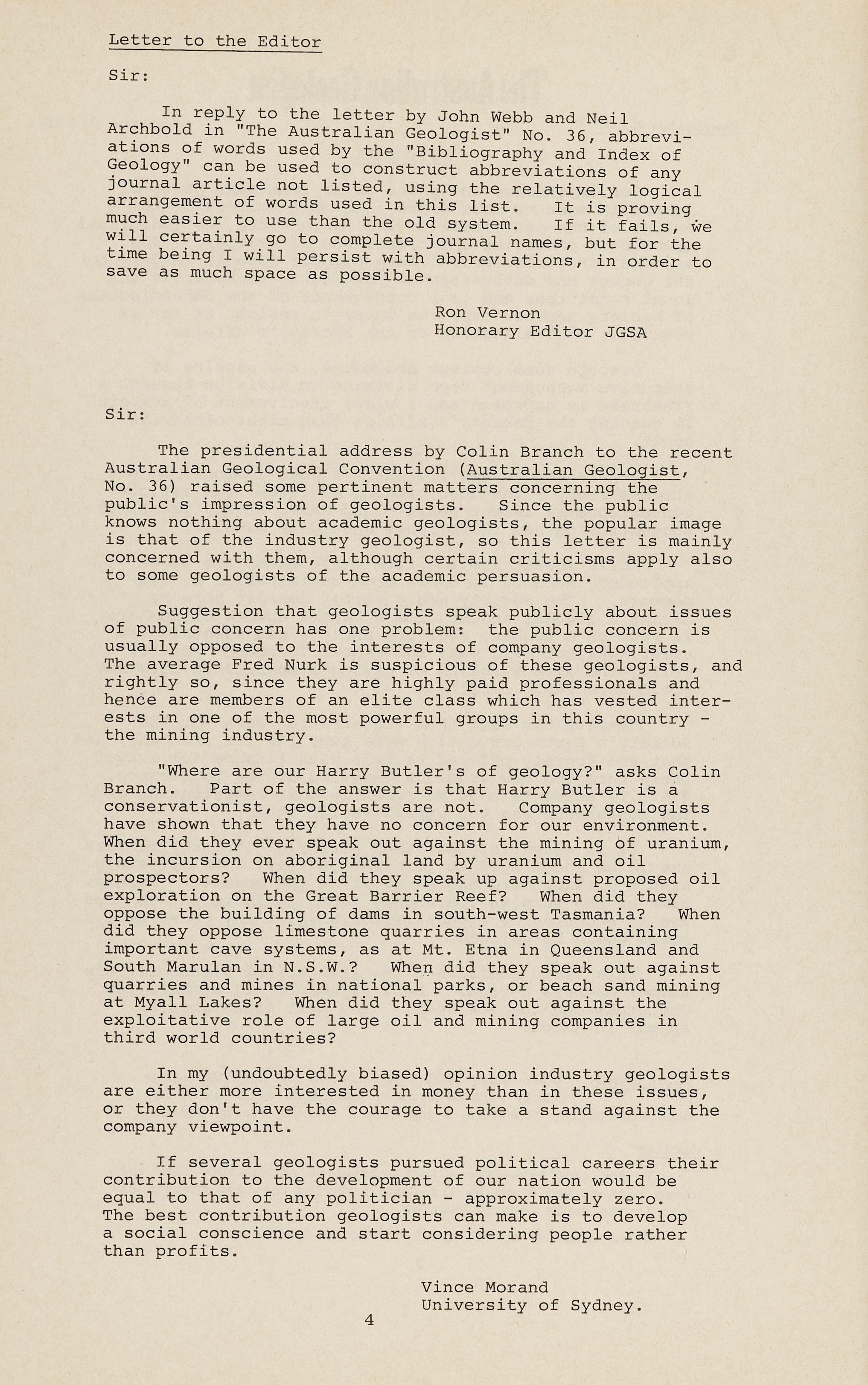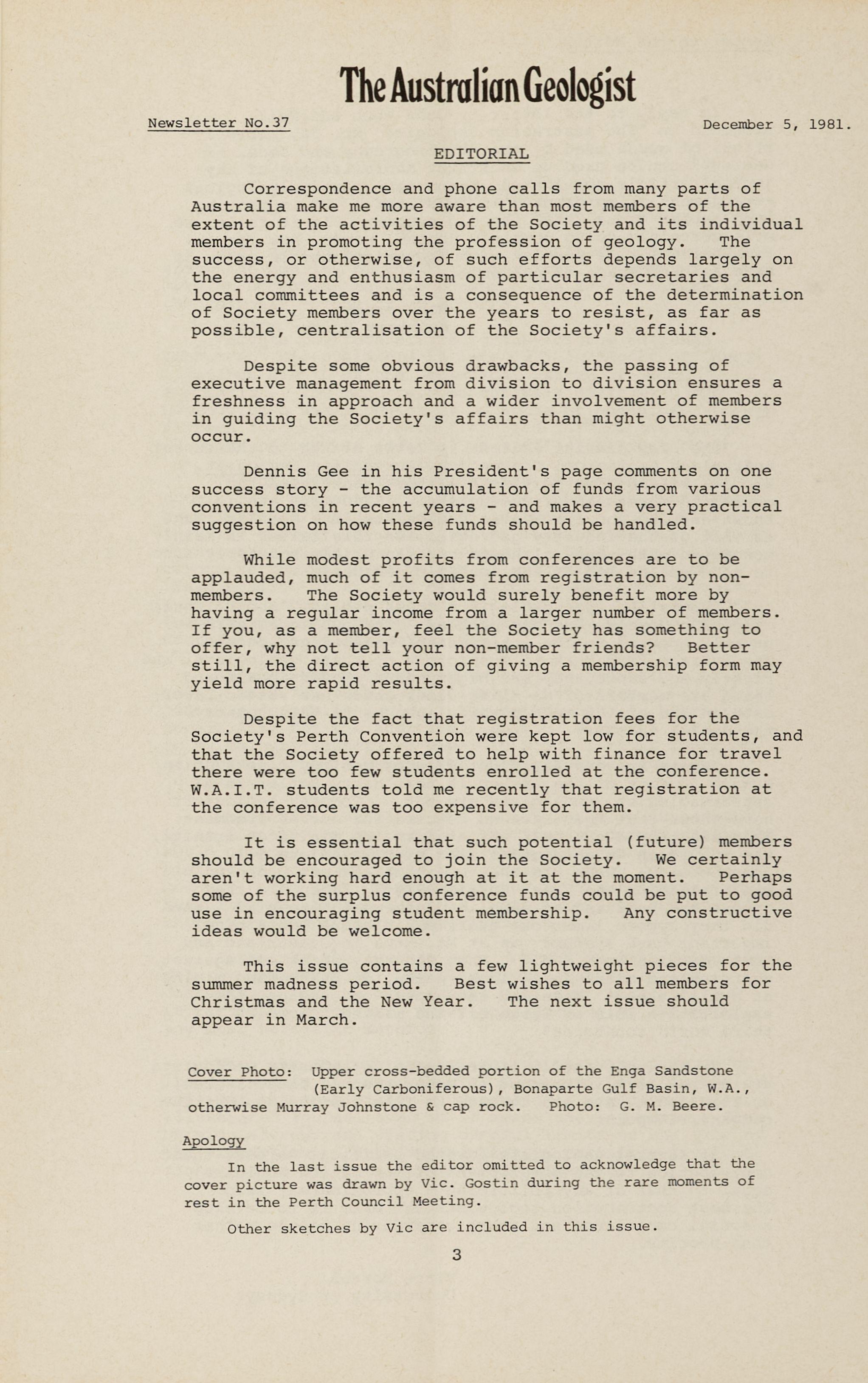 Correspondence and phone calls from many parts of Australia make me more aware than most members of the extent of the activities of the Society and its individual members in promoting the profession of geology. The success, or otherwise, of such efforts depends largely on the energy and enthusiasm of particular secretaries and local committees and is a consequence of the determination of Society members over the years to resist, as far as possible, centralisation of the Societ y 's affairs.