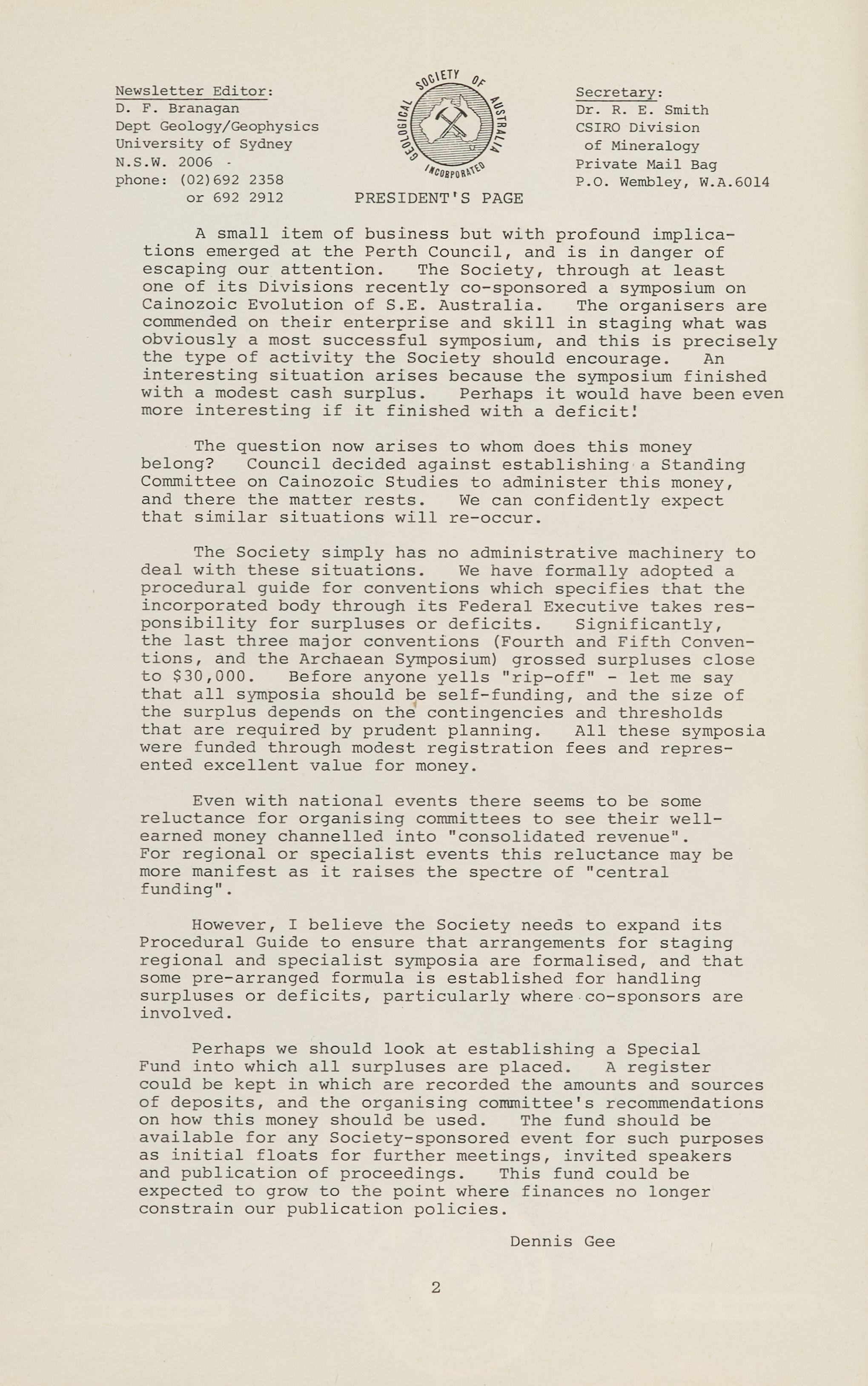 The Society simply has no administrative machinery to deal with these situations. We have formally adopted a procedural guide for conventions which specifies that the incorporated body through its Federal Executive takes responsibility for surpluses or deficits. Significantly, the la s t three major conventions (Fourth and Fifth Conventions, and the Archaean Symposium) grossed surpluses close to $30,000. Before anyone yells "rip-off" - let me say that all symposia should be self-funding, and the size of the surplus depends on the contingencies and thresholds that are required by prudent planning. All these symposia were funded through modest registration fees and represented excellent value for money.