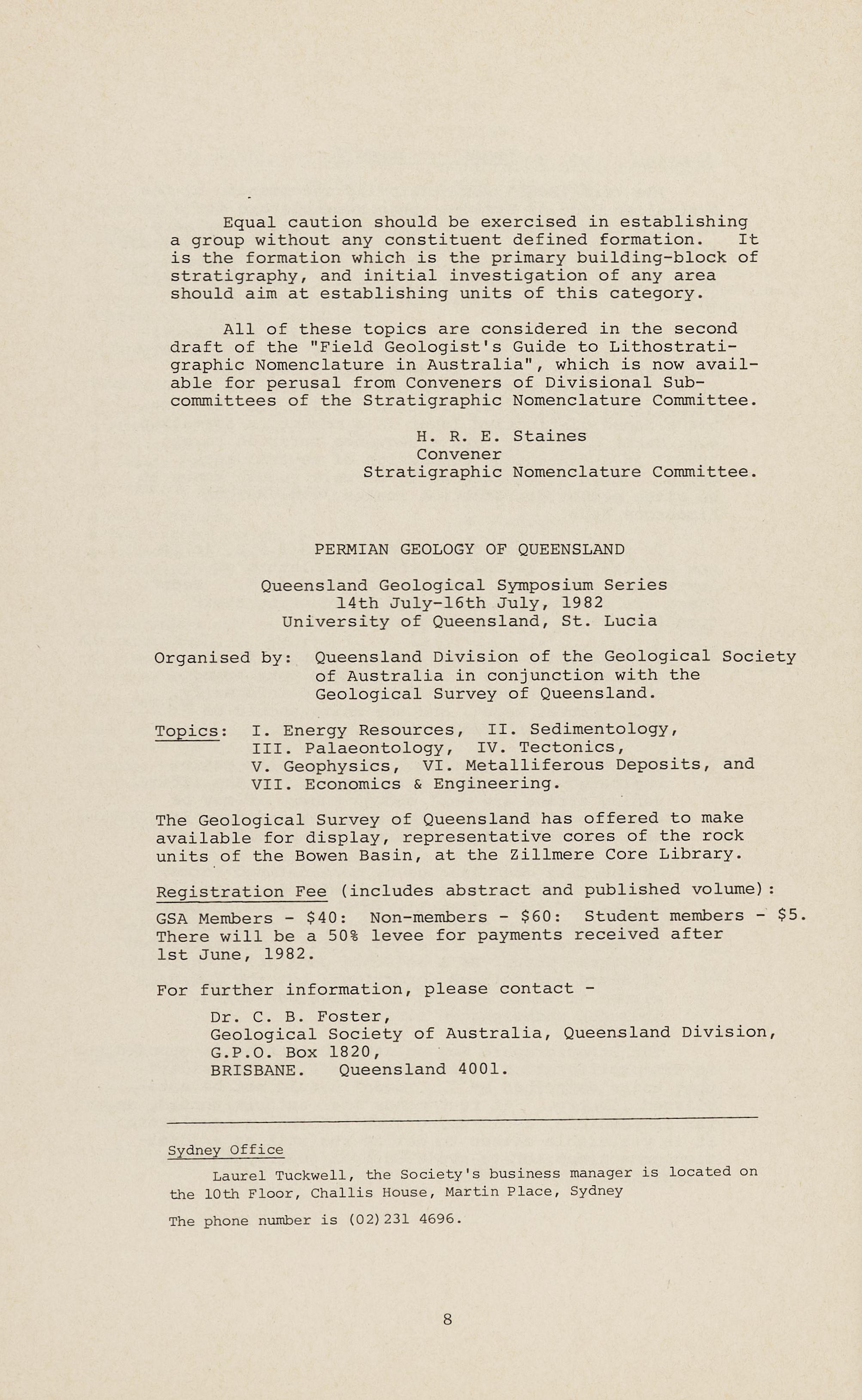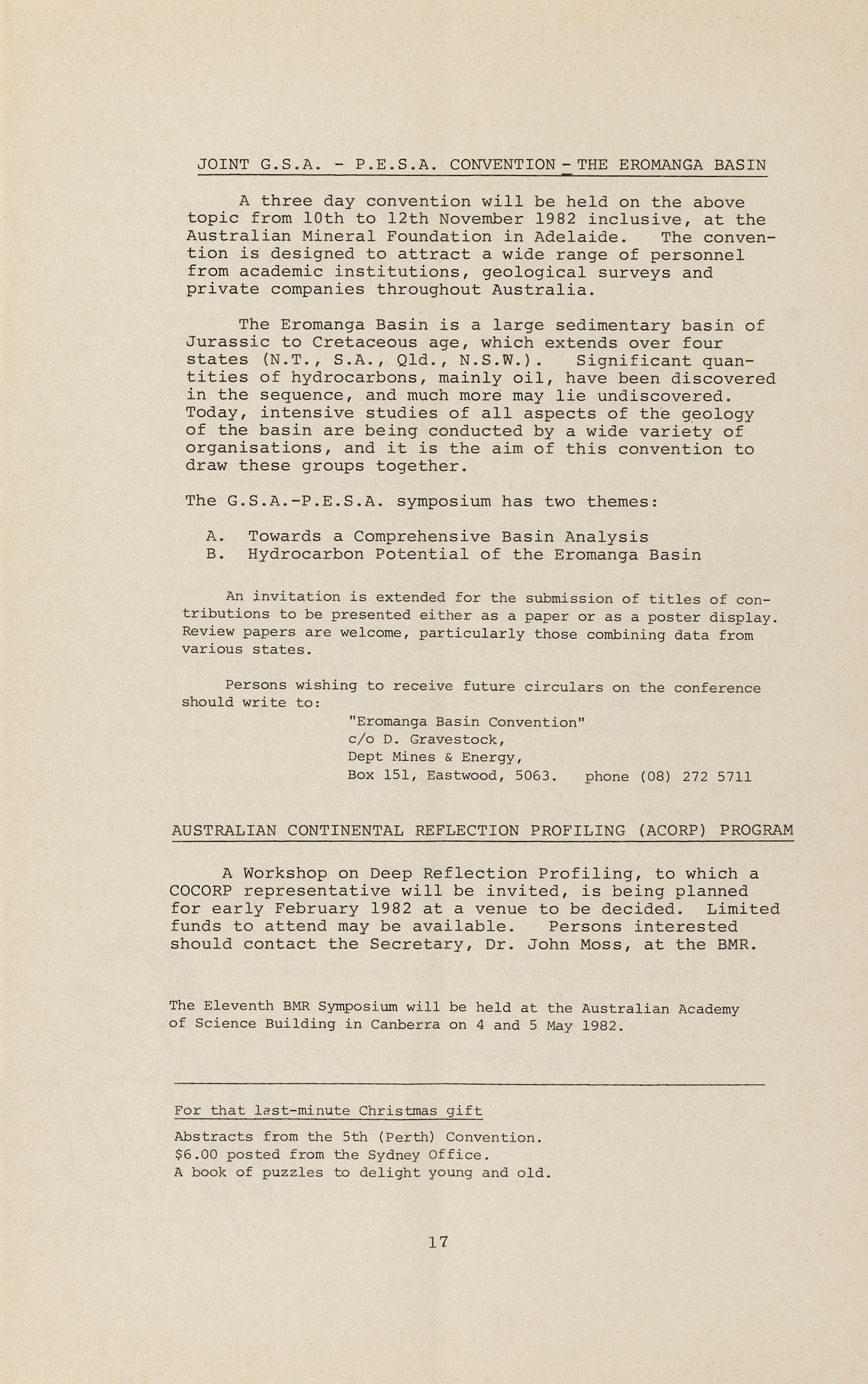 "Eromanga Basin Convention" c/o D. Gravestock, Dept Mines & Energy, Box 151, Eastwood, 5063. phone (08) 272 5711