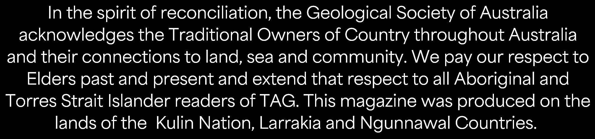 The Australian Geologist (TAG) is a quarterly member magazine that includes society news, conference details, special reports, feature articles, book reviews and other items of interest to Earth Scientists. Each issue has a long shelf-life and is read by more than 3,000 geologists, geophysicists, paleontologists, hydrologists, geochemists, cartographers and geoscience educators from Australia and around the world.