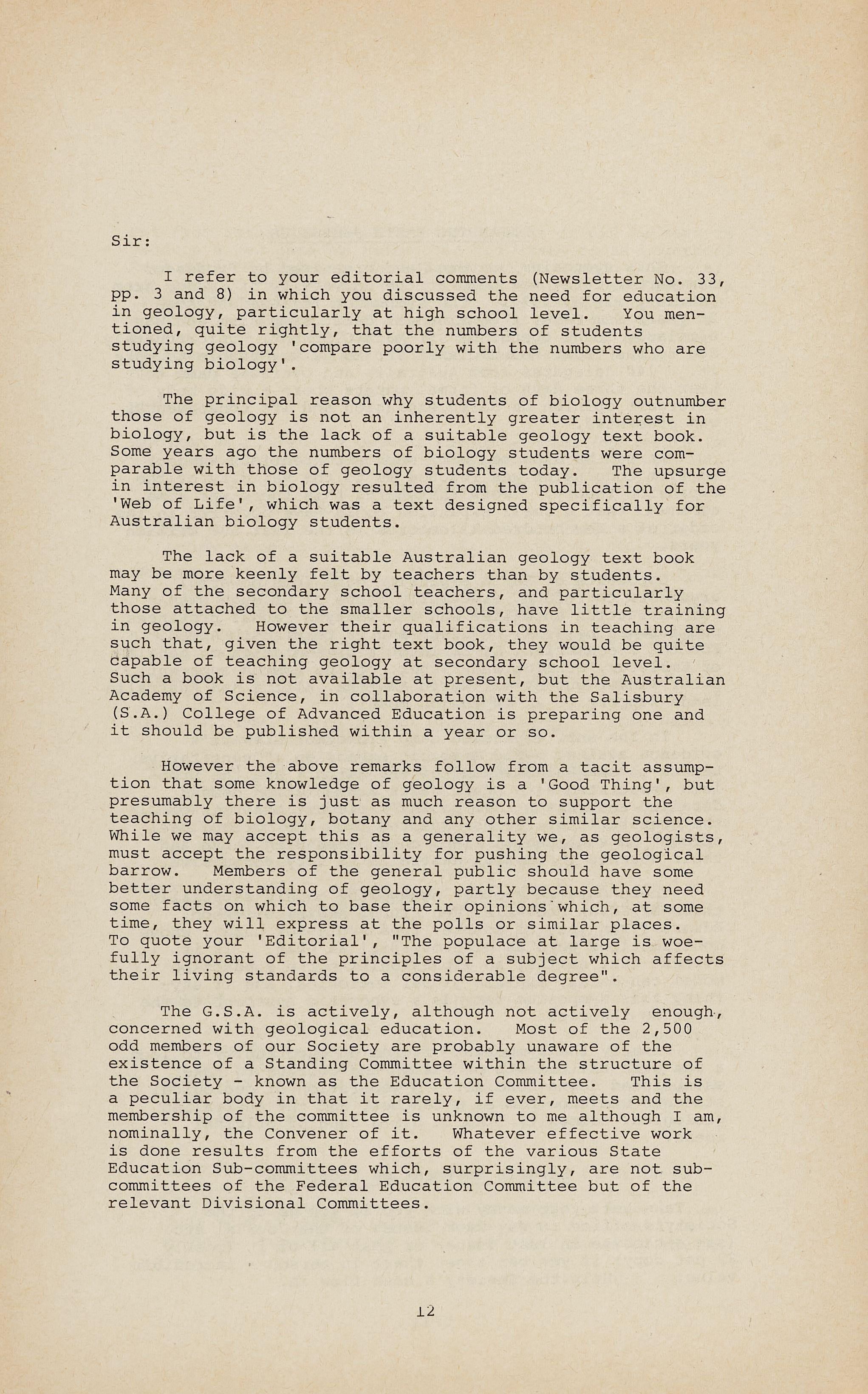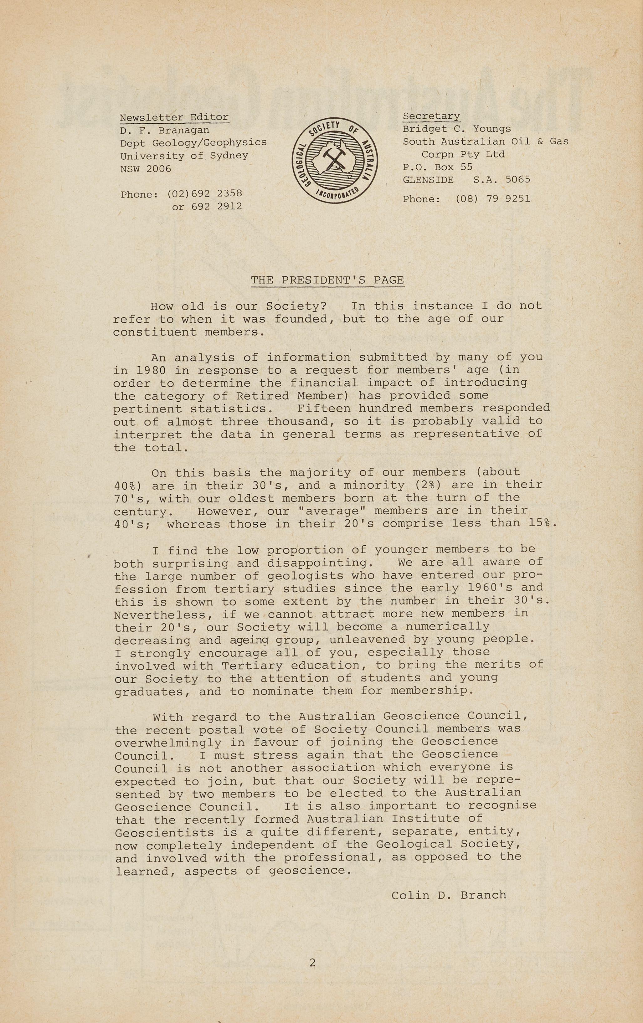 With regard to the Australian Geoscience Council, the recent postal vote of Society Council members was overwhelmingly in favour of joining the Geoscience Council. I must stress again that the Geoscience Council is not another association which everyone is expected to join, but that our Society will be represented by two members to be elected to the Australian Geoscience Council. It is also important to recognise that the recently formed Australian Institute of Geoscientists is a quite different, separate, entity, now completely independent of the Geological Society, and involved with the professional, as opposed to the learned, aspects of geoscience.