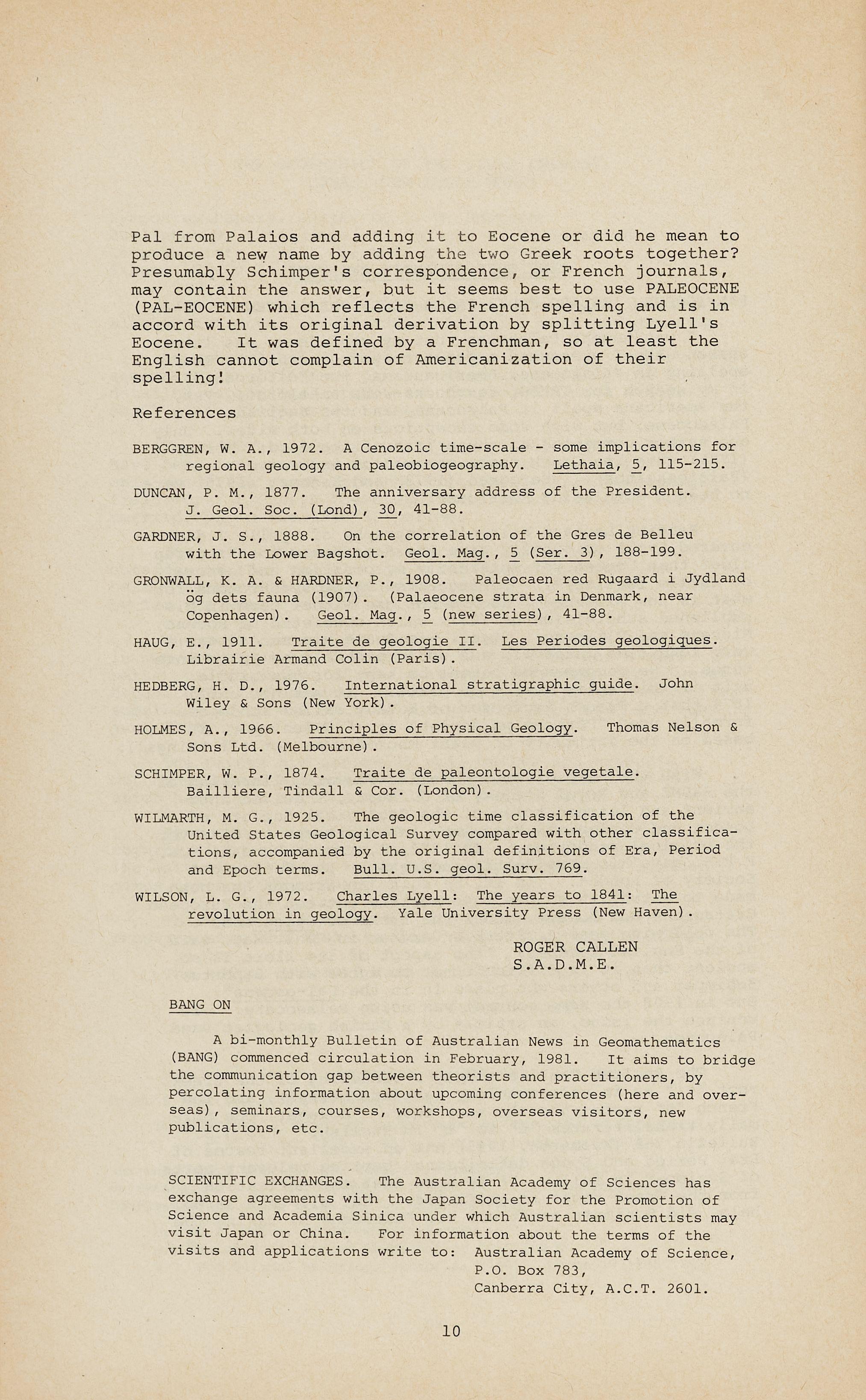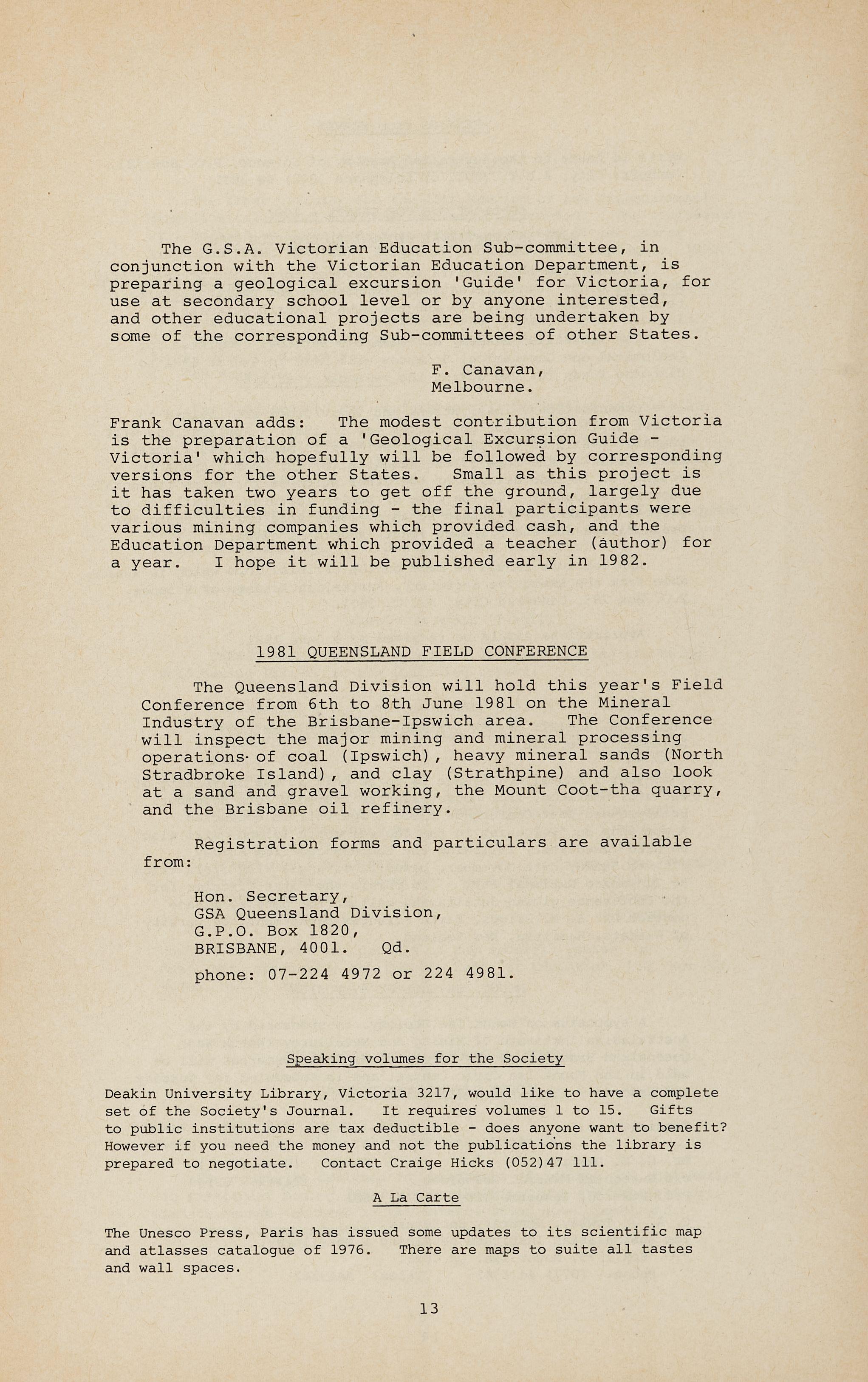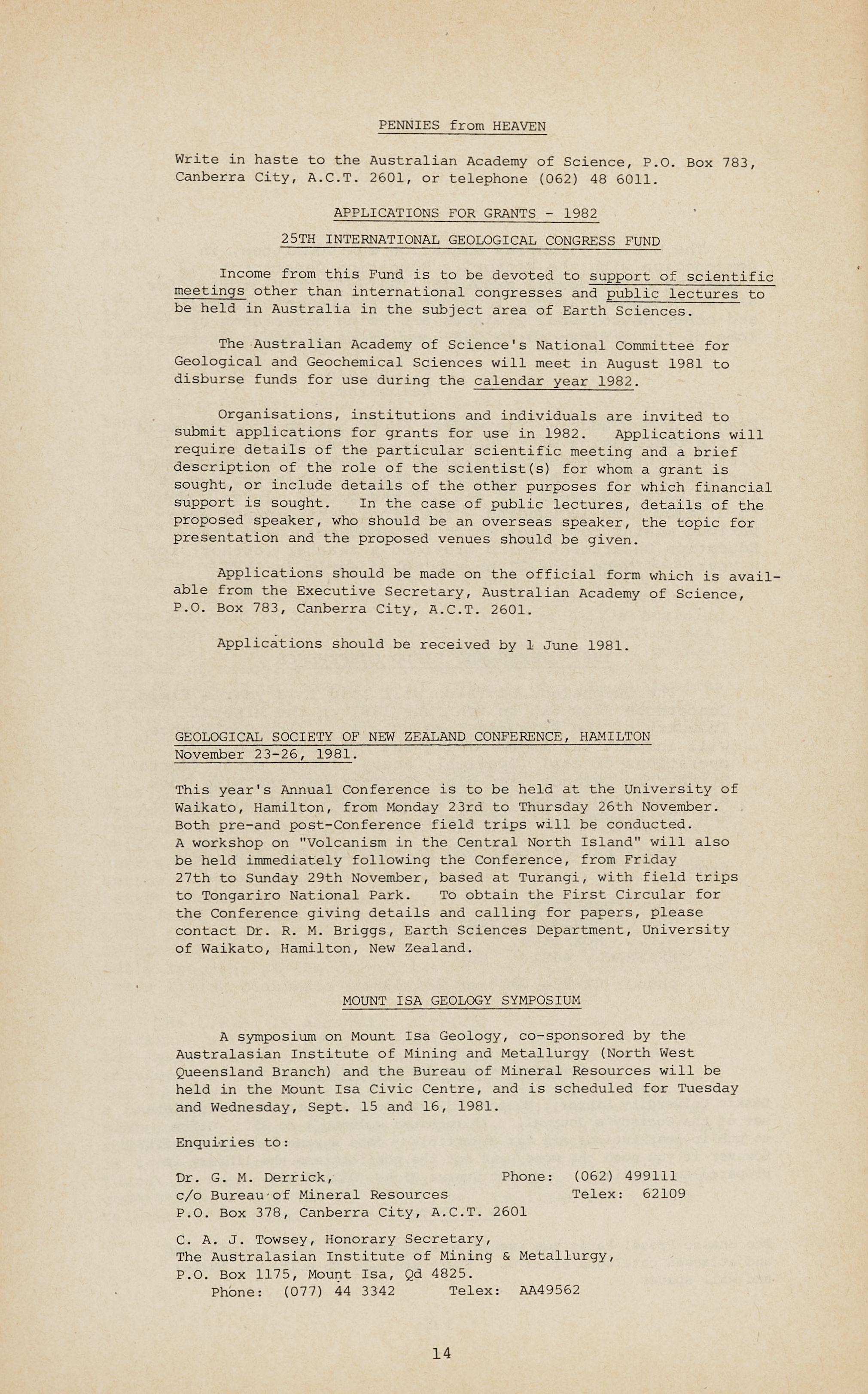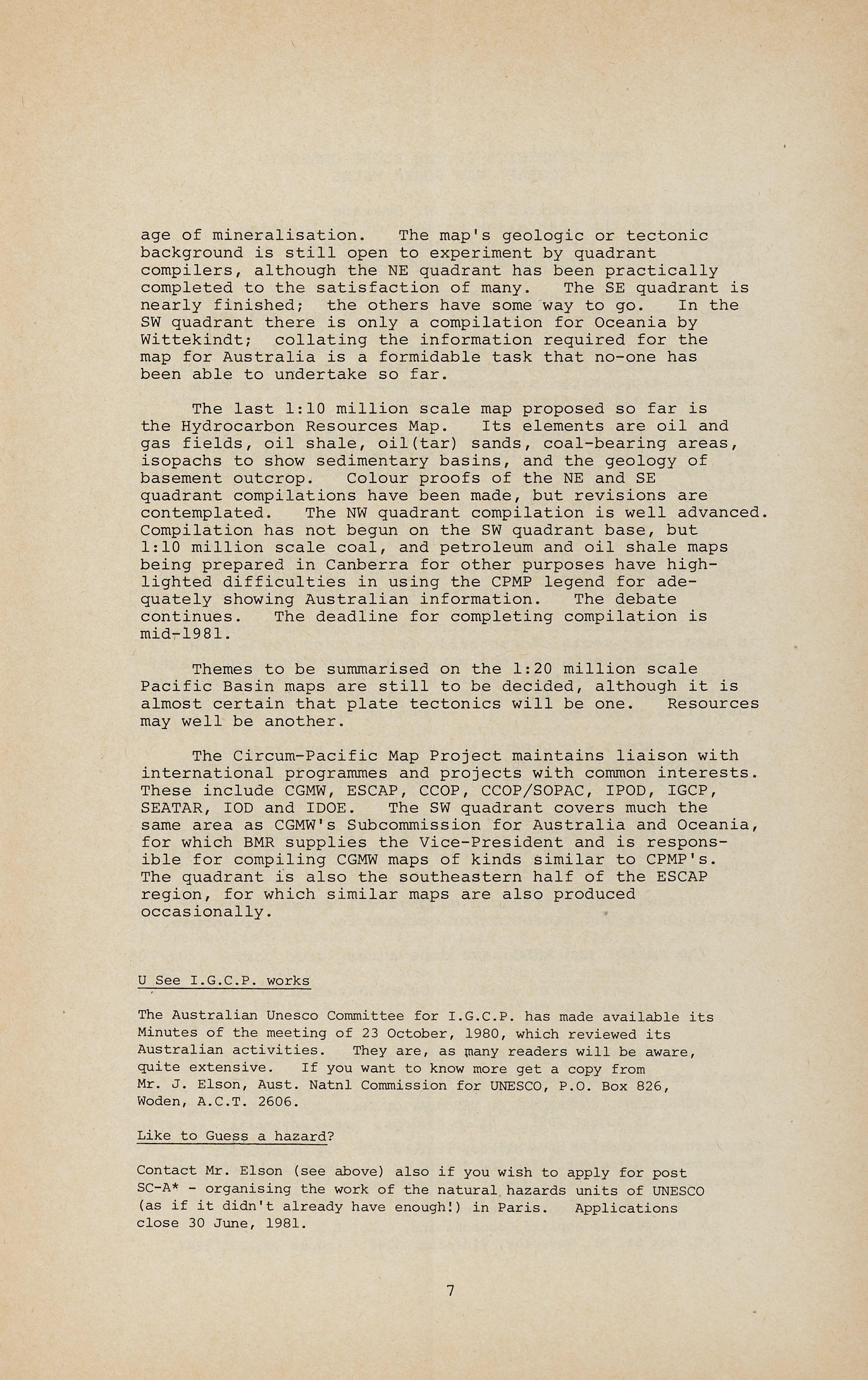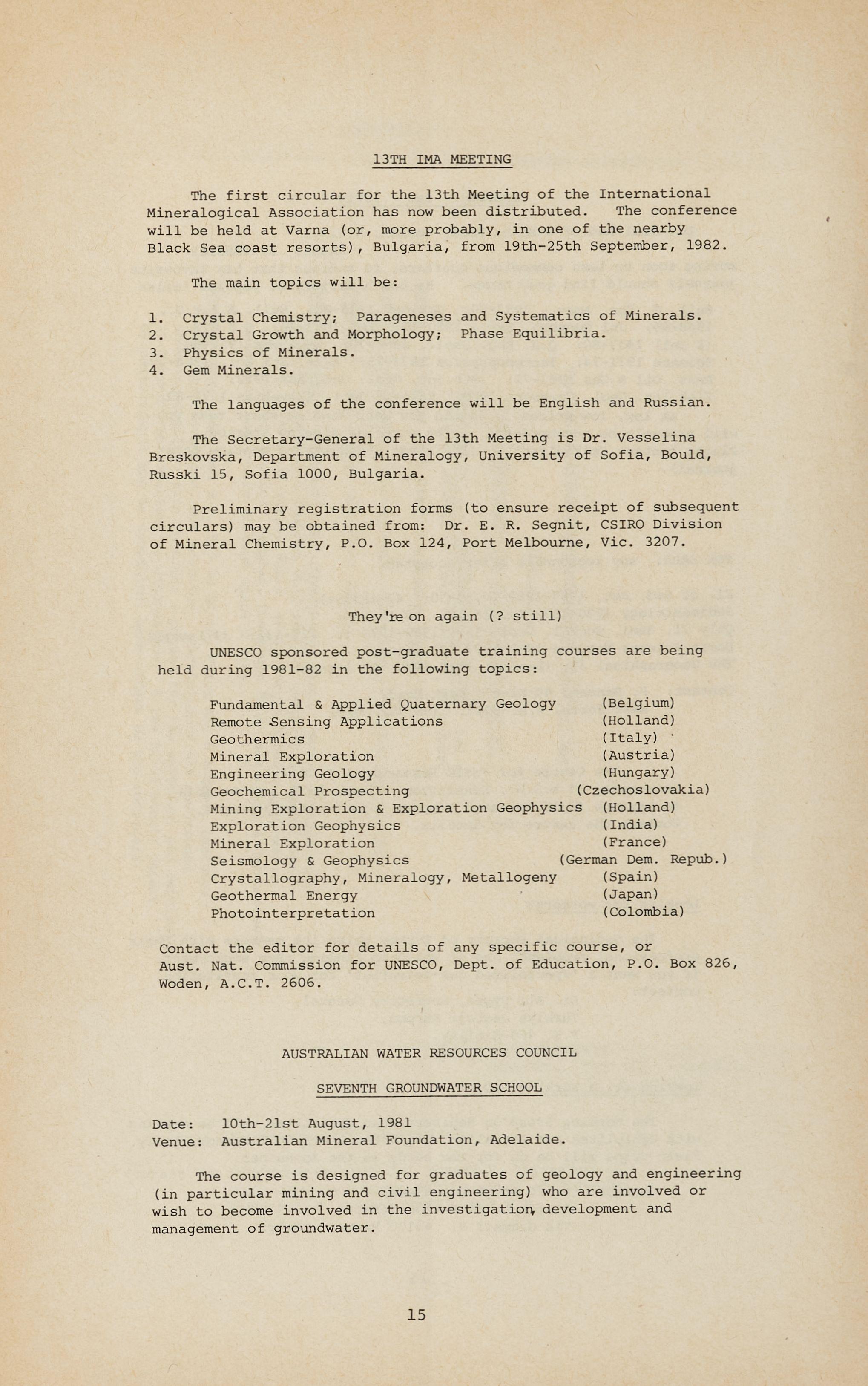 The Australian Unesco Committee for I.G.C.P. has made available its Minutes of the meeting of 23 October, 1980, which reviewed its Australian activities. They are, as ~any readers will be aware, quite extensive. If you want to know more get a copy from Mr. J. Elson, Aust. Natnl Commission for UNESCO, P.O. Box 826, Woden, A.C.T. 2606.