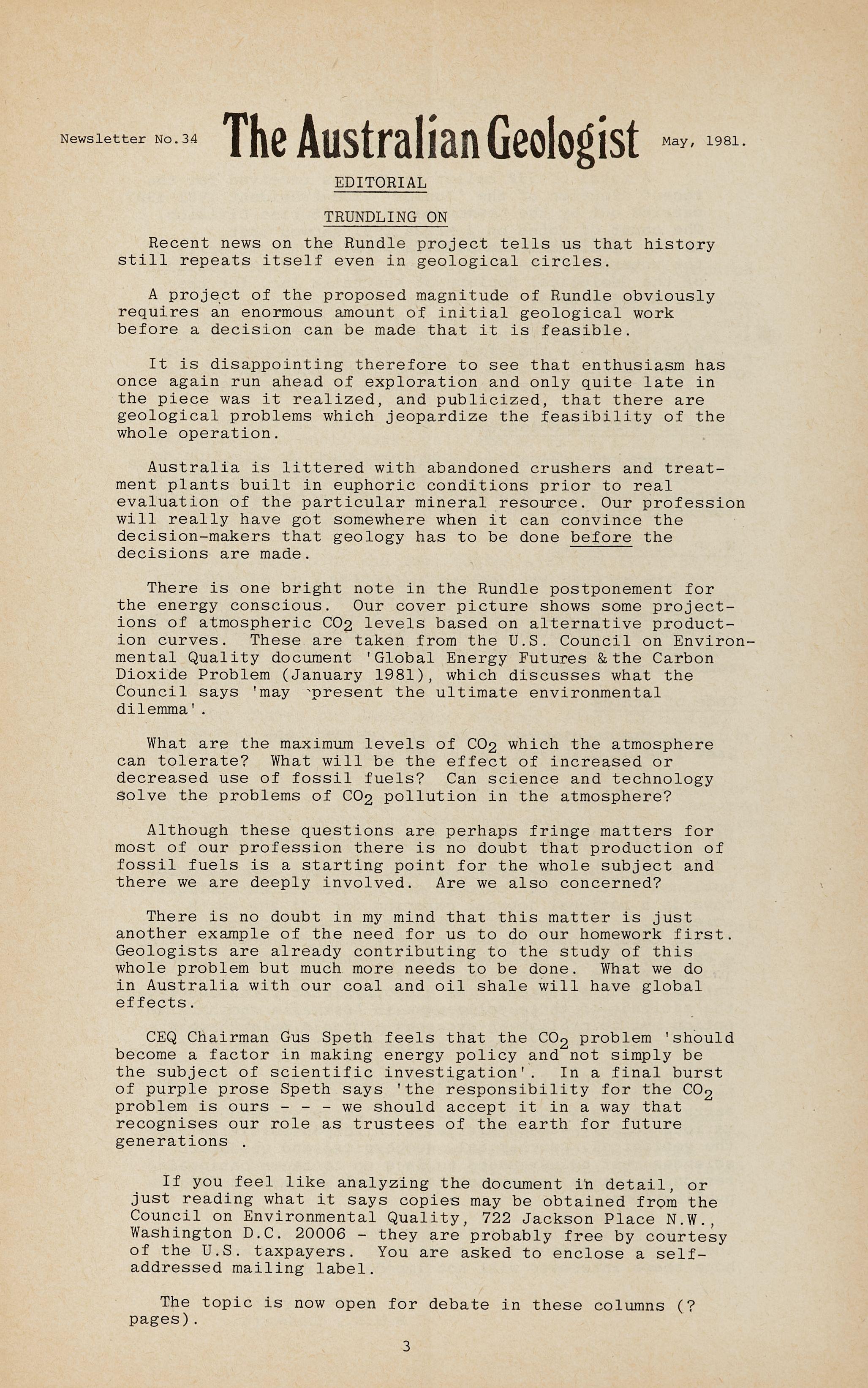 There is no doubt in my mind that this matter is just another example of the need for us to do our homework first. Geologists are already contributing to the study of this whole problem but much more needs to be done. What we do in Australia with our coal and oil shale will have global effects