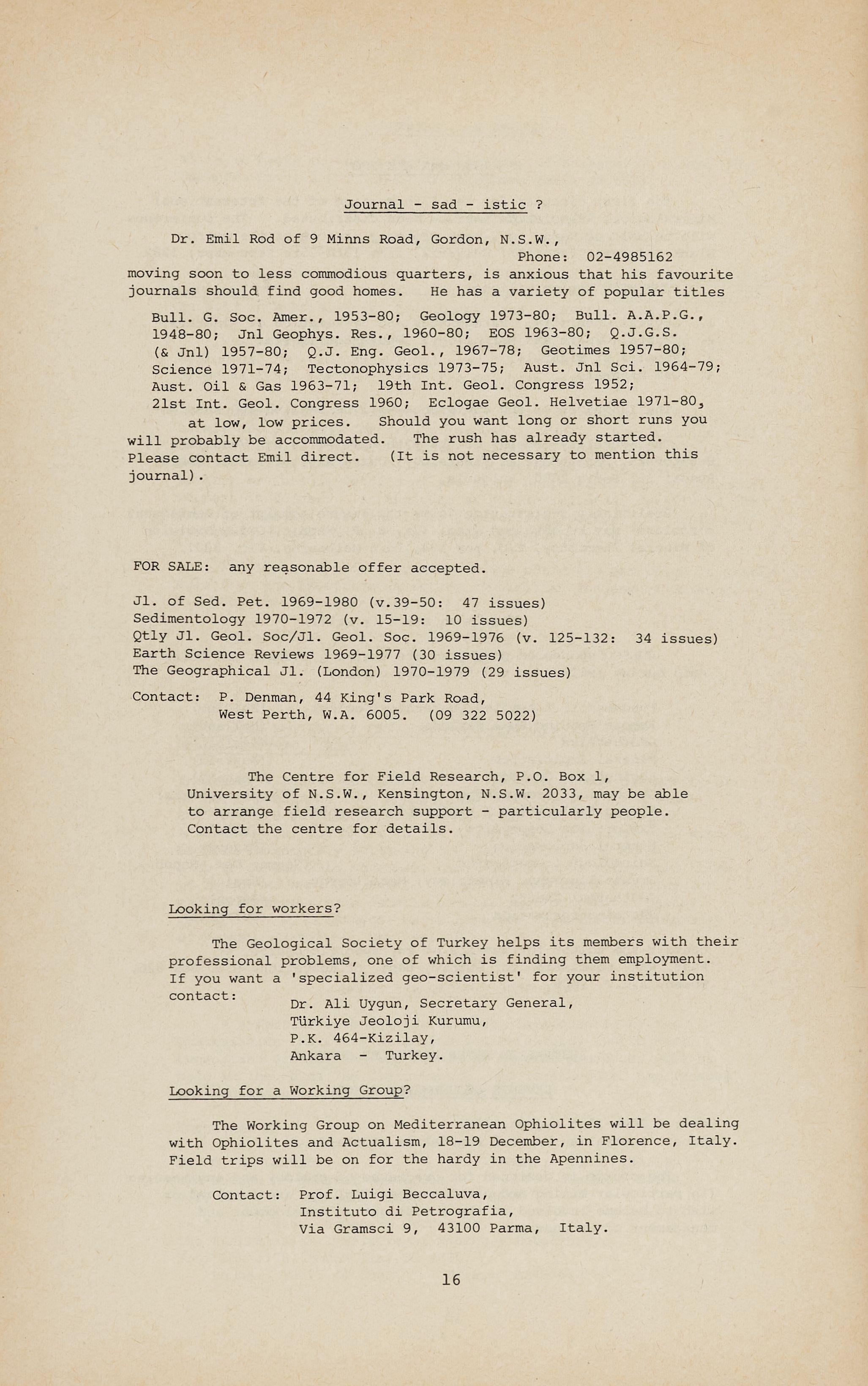 Bull. G. Soc. Amer., 1953-80; Geology 1973-80; Bull. A.A.P.G., 1948-80; Jnl Geophys. Res., 1960-80; EOS 1963-80; Q.J.G.S. (& Jnl) 1957-80; Q.J. Eng. Geol., 1967-78; Geotimes 1957-80; Science 1971-74; Tectonophysics 1973-75; Aust. Jnl Sci. 1964-79; Aust. Oil & Gas 1963-71; 19th Int. Geol. Congress 1952; 21st Int. Geol. Congress 1960; Eclogae Geol. Helvetiae 1971-80~ at low, low prices. Should you want long or short runs you will probably be accommodated. The rush has already started. Please contact Emil direct. (It is not necessary to mention this journal).