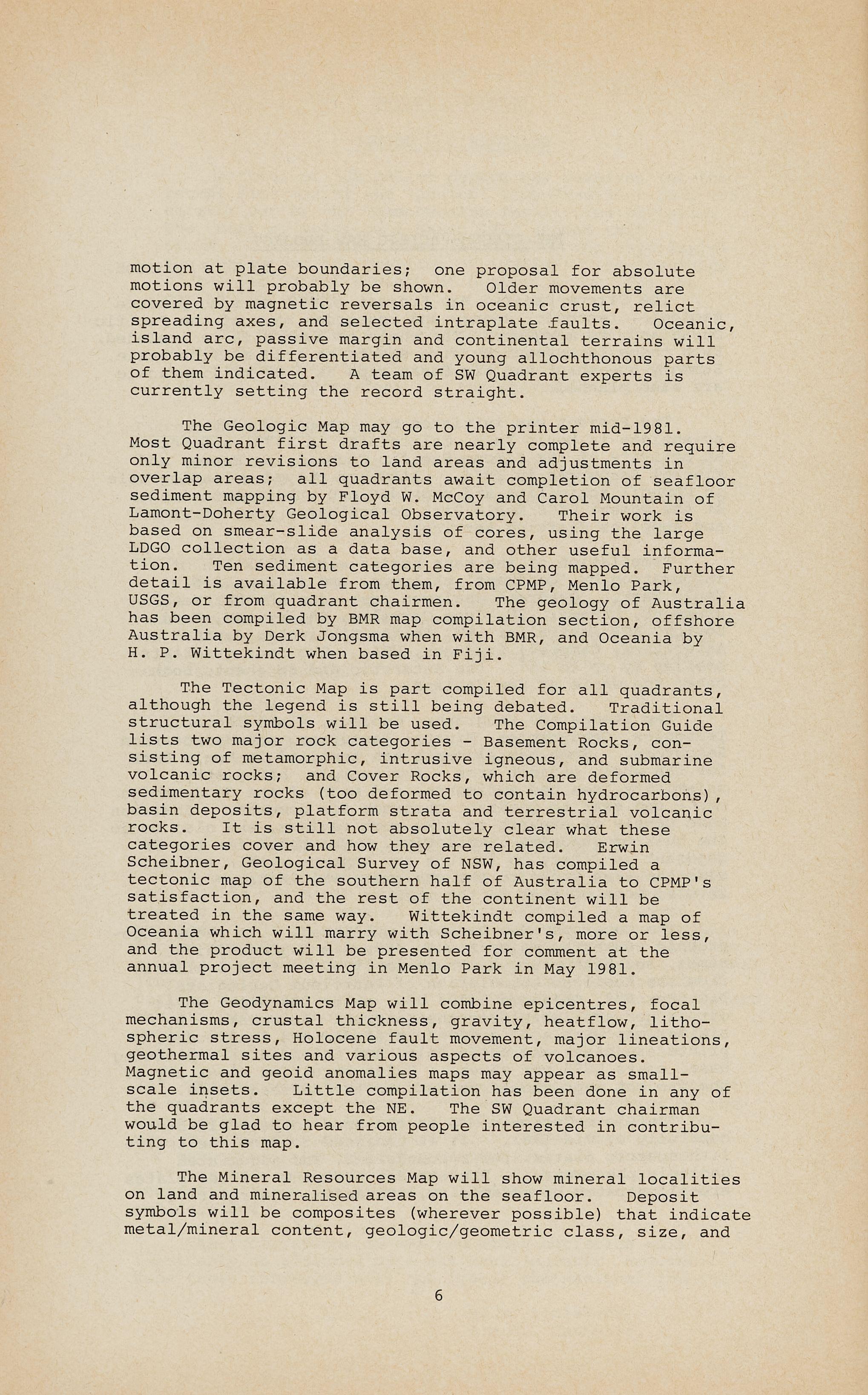 The Geologic Map may go to the printer mid-1981. Most Quadrant first drafts are nearly complete and require only minor revisions to land areas and adjustments in overlap areas; all quadrants await completion of seafloor sediment mapping by Floyd W. McCoy and Carol Mountain of Lamont-Doherty Geological Observatory. Their work is based on smear-slide analysis of cores, using the large LOGO collection as a data base, and other useful information. Ten sediment categories are being mapped. · Further detail is available from them, from CPMP, Menlo Park, USGS, or from quadrant chairmen. The geology of Australia has been compiled by BMR map compilation section, offshore Australia by Derk Jongsma when with BMR, and Oceania by H. P. Wittekindt when based in Fiji.