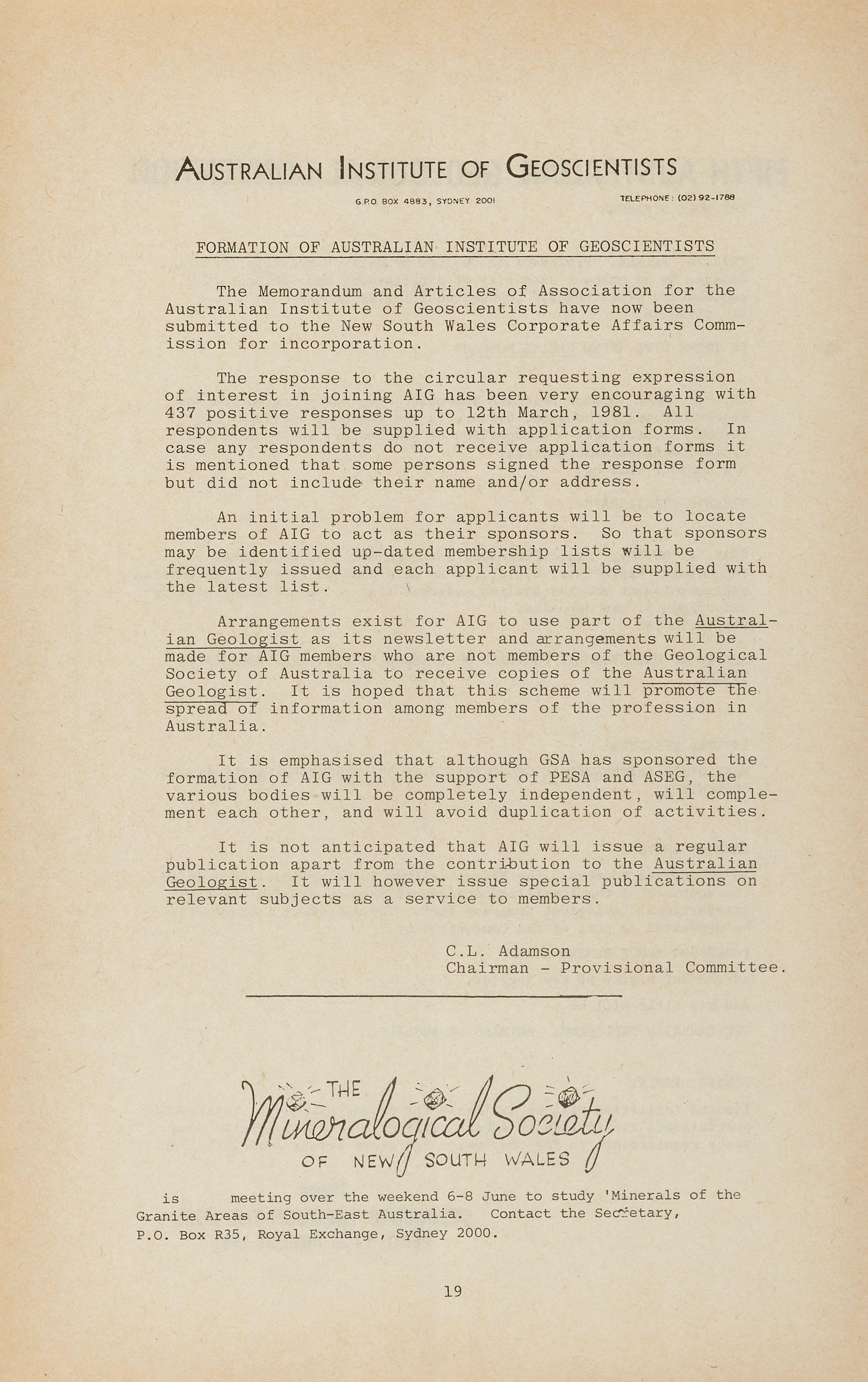 The Memorandum and Articles of Association for the Australian Institute of Geoscientists have now been submitted to the New South Wales Corporate Affairs Commission for incorporation.