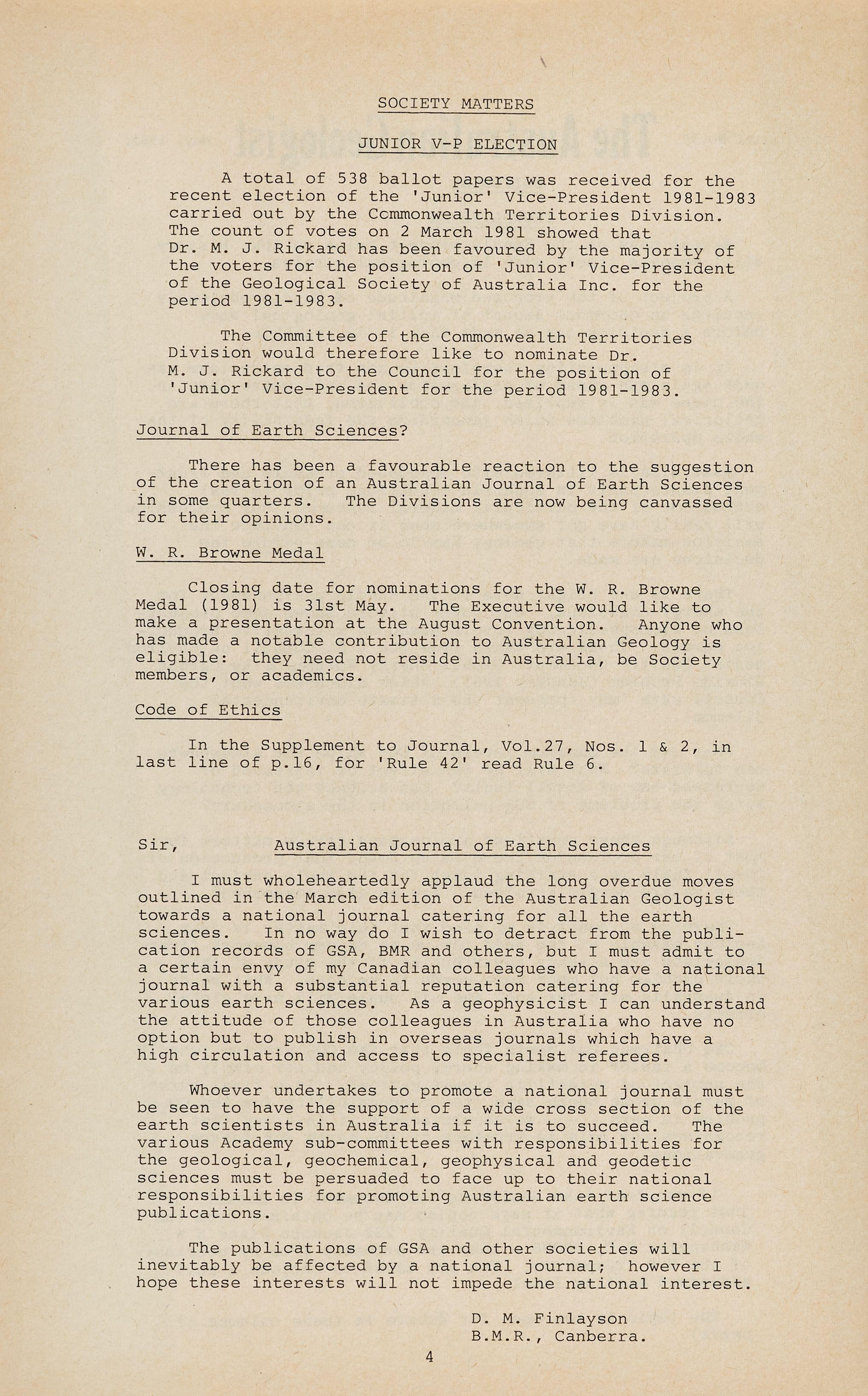 A total of 538 ballot papers was received for the recent election of the 'Junior' Vice-President 1981-1983 carried out by the Commonwealth Territories Division. The count of votes on 2 March 1981 showed that Dr. M. J. Rickard has been favoured by the majority of the voters for the position of 'Junior' Vice-President of the Geological Society of Australia Inc. for the period 1981-1983.