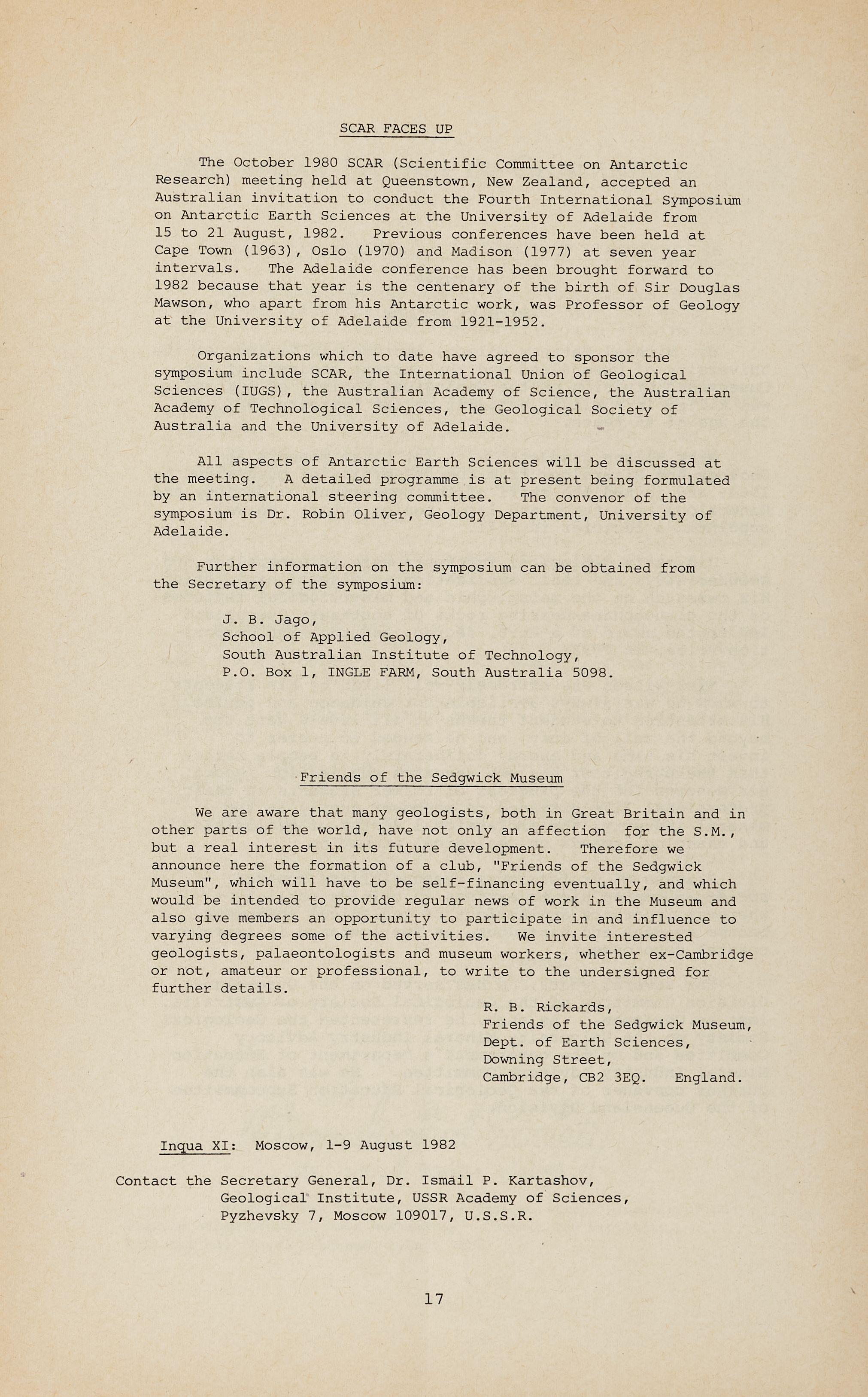 The Oc tober 1980 SCAR (Scientific Committee on Antarctic Research) meeting held at Queenstown, New Zealand , accepted an Australian invitation to conduct the Fourth International Symposium on Antarctic Earth Sciences at the Univers i ty of Adelaide from 15 to 21 August, 1982. Previous confe rences have been he l d at Cape Town (1963) , Oslo (1970) and Madison (1977) at seven year intervals. The Adelaide conference has been brought forward to 1982 because that year is the centenary of the birth of Sir Douglas Mawson , who apart from his Antarctic work, was Professor of Geology at the University of Adelaide from 1921-1952.