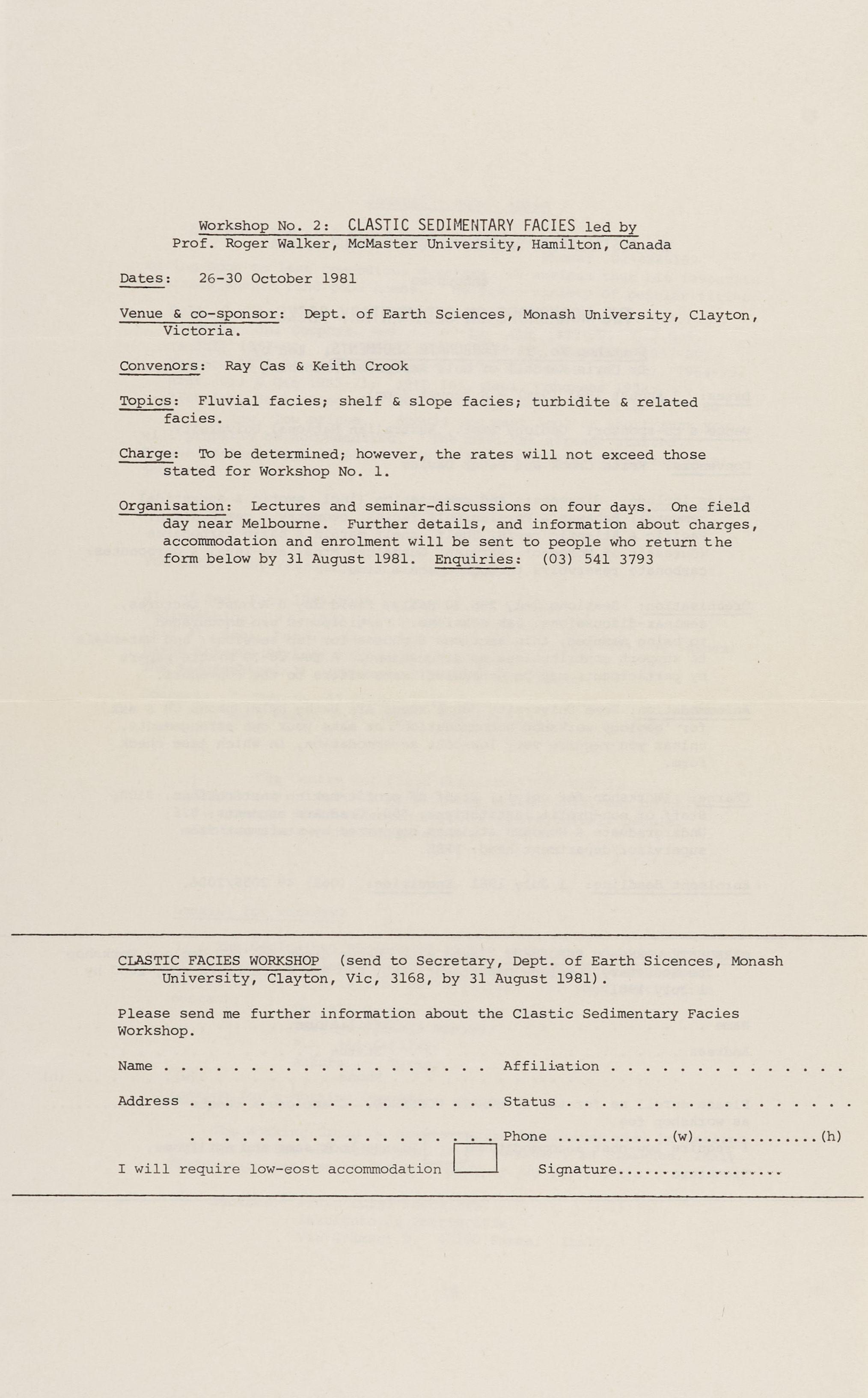CI.ASTIC FACIES WORKSHOP (send to Secretary, Dept. of Earth Sicences, Monash University, Clayton, Vic, 3168, by 31 August 1981).