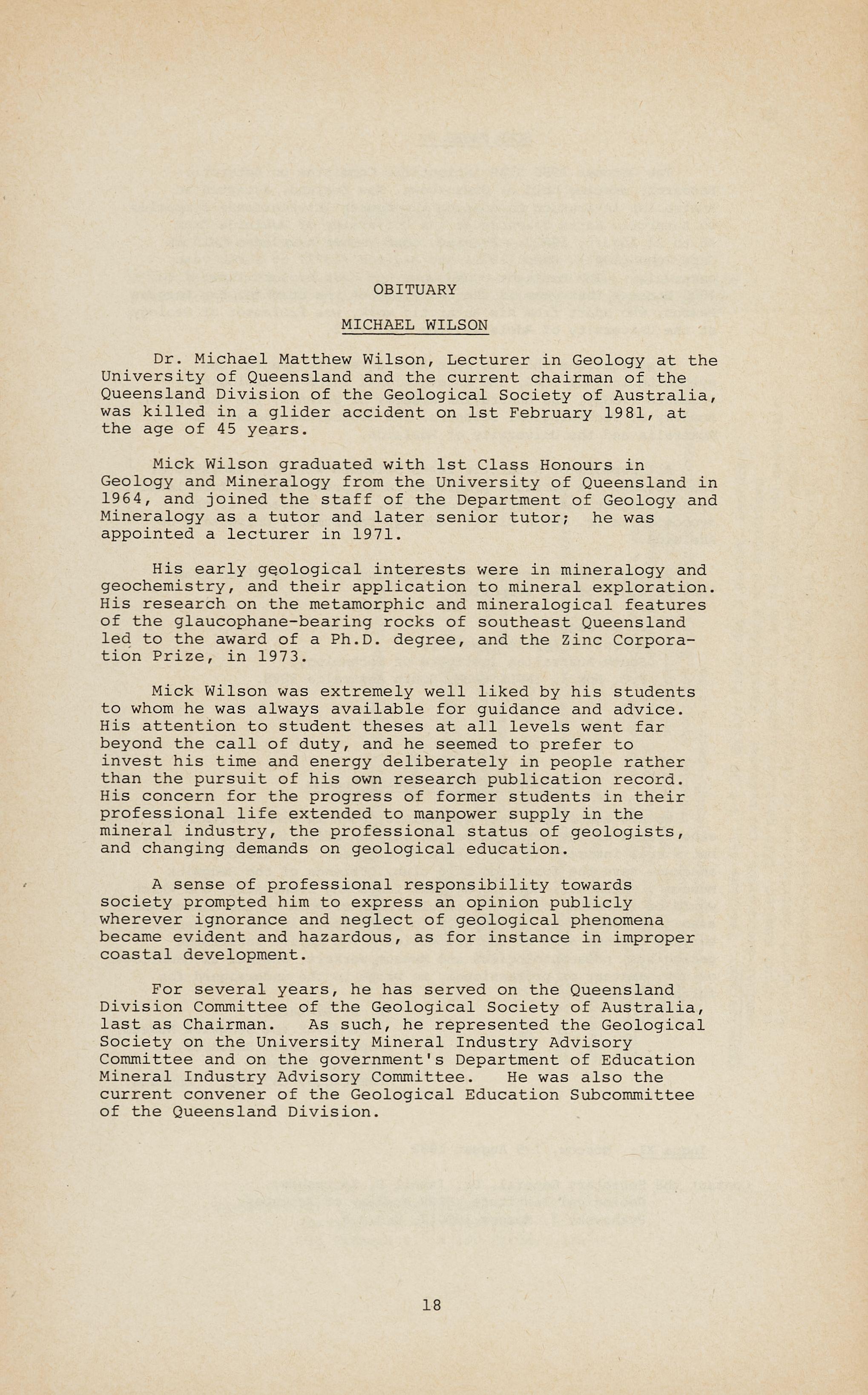 Dr. Michael Matthew Wilson, Lecturer in Geology at the University of Queensland and the current chairman of the Queensland Division of the Geological Society of Australia, was killed in a glider accident on 1st February 1981, at the age of 45 years.