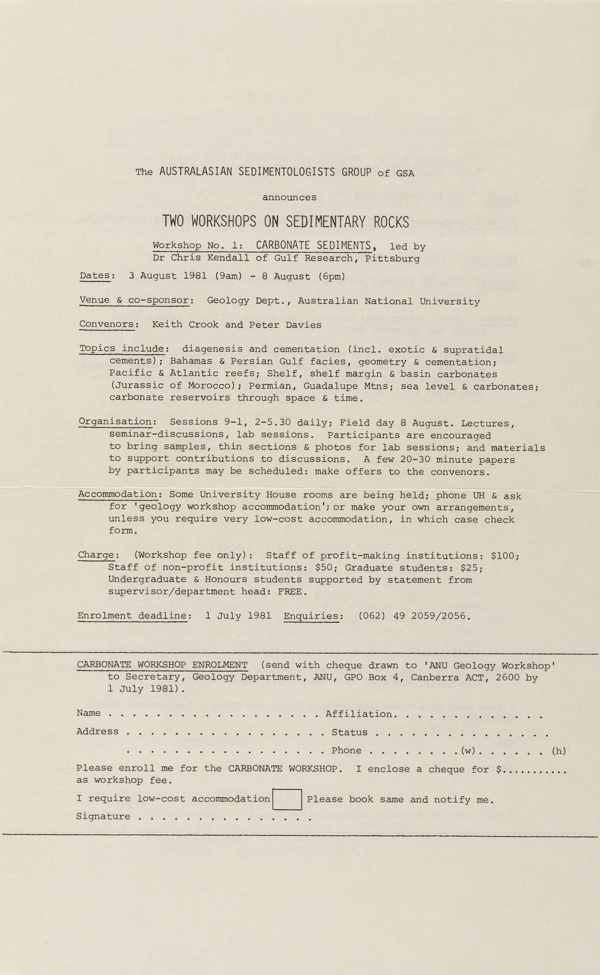 CARBONATE WORKSHOP ENROLMENT (send with cheque drawn to ' ANU Geology Workshop ' to Secretary, Geology Department , ANU , GPO Box 4, Canberra ACT, 2600 by 1 July 1981)